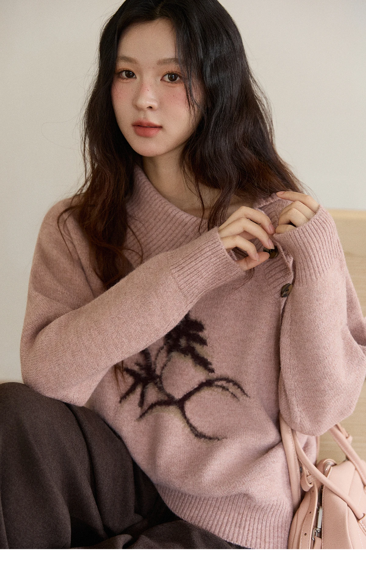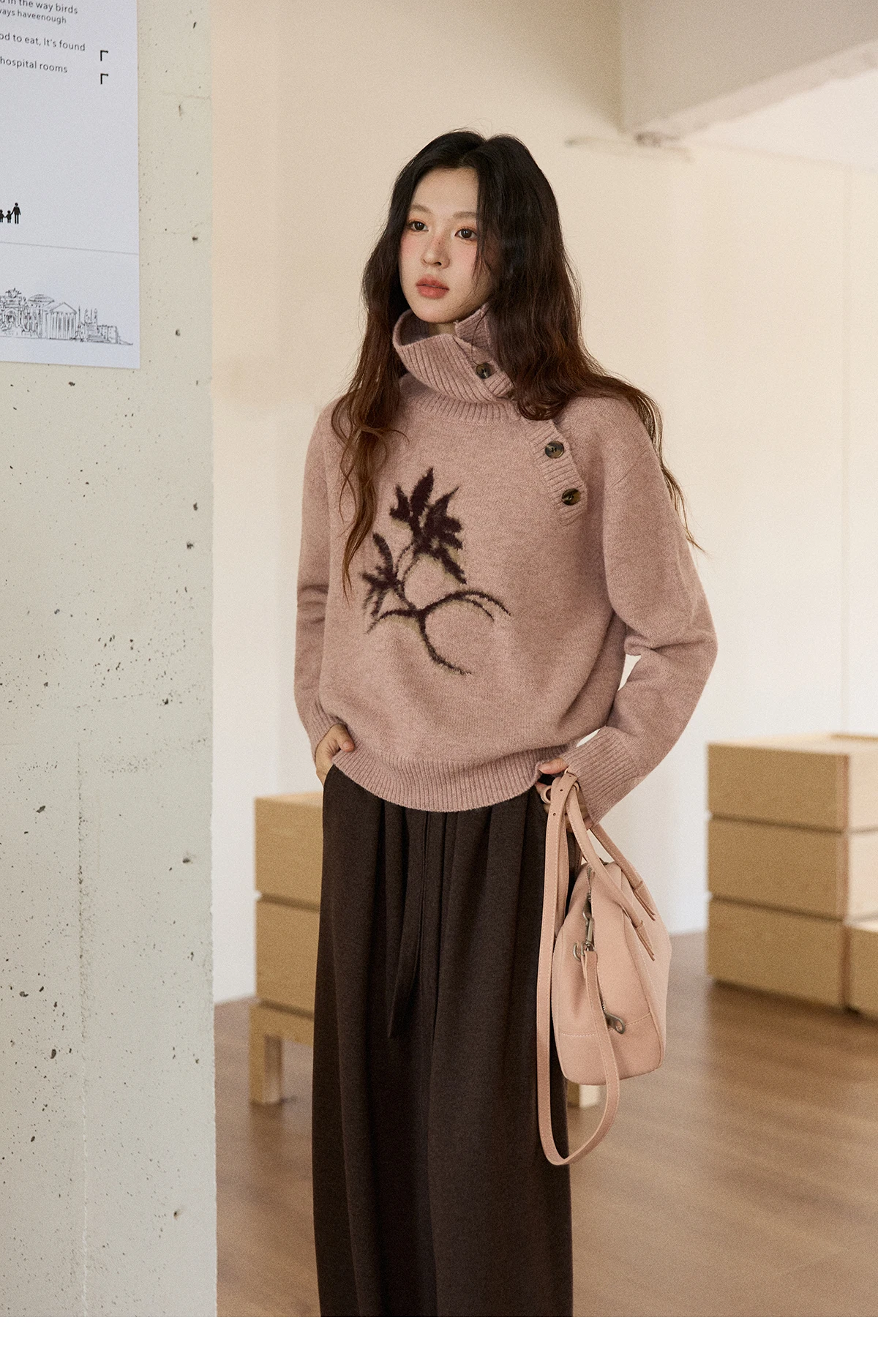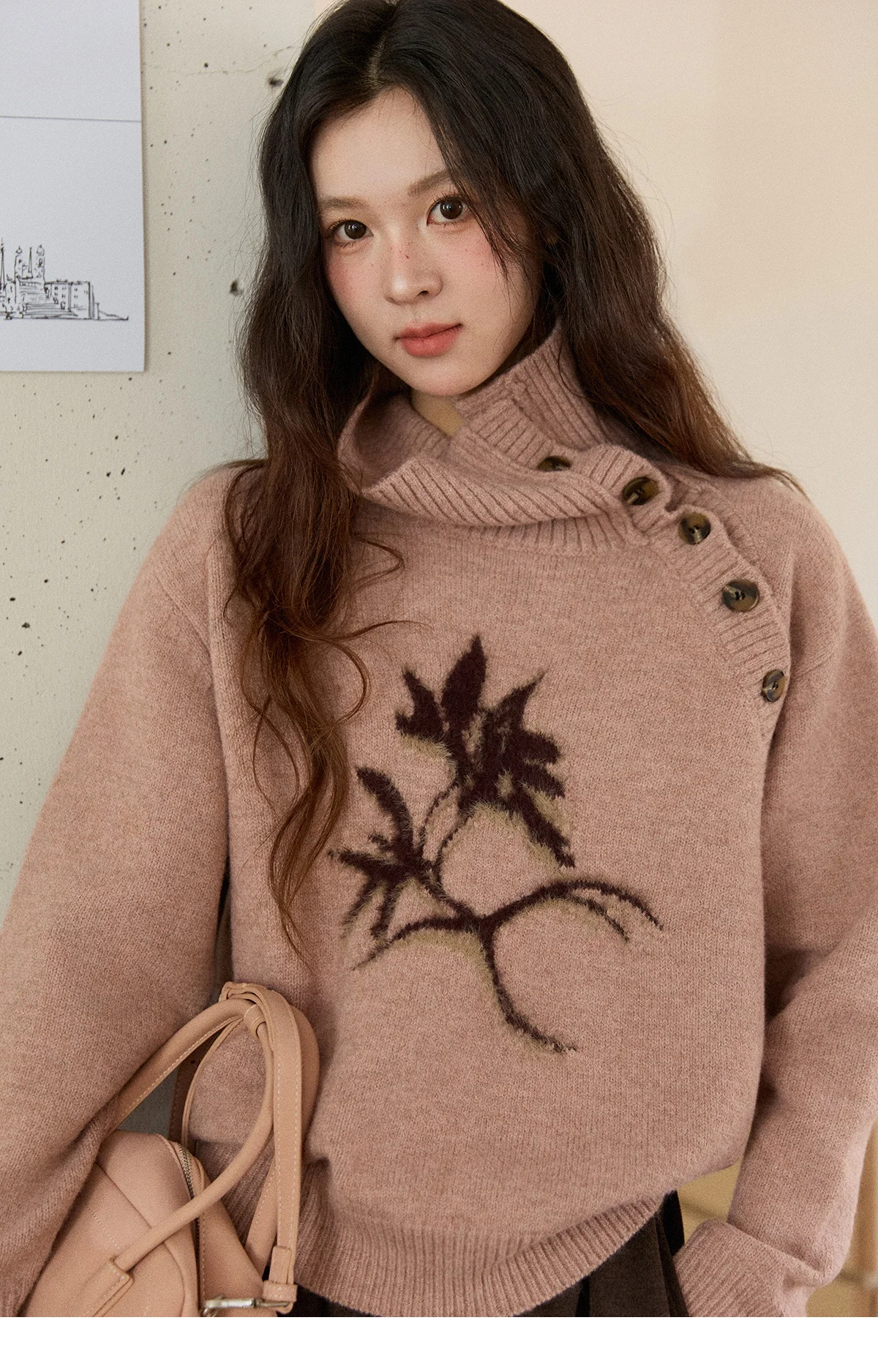 MISHOW Plant Jacquard Sweater for Woman 2025 Winter French Style Casual Turtleneck Design Knitted Pullover Tops Woman MXE86Z2658