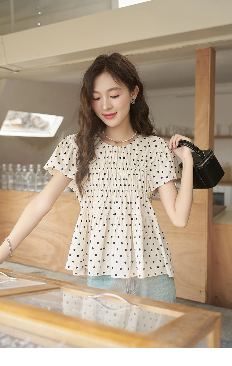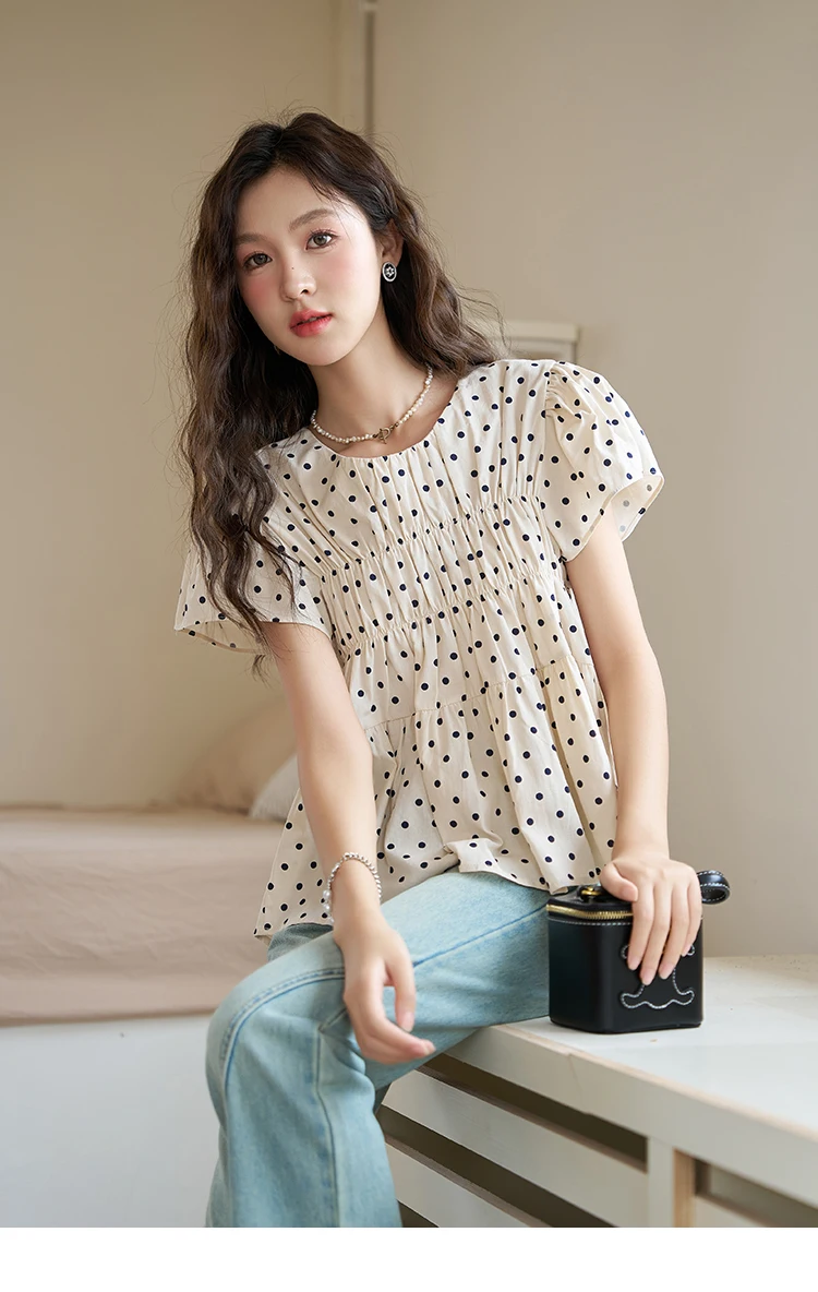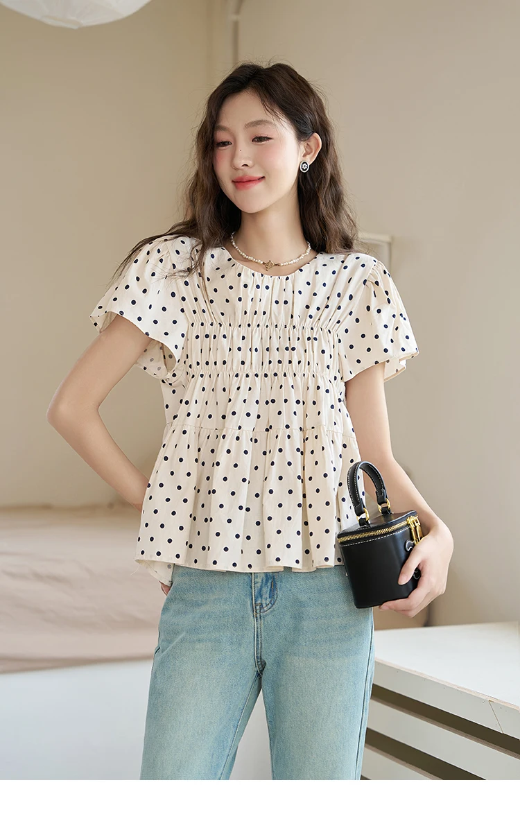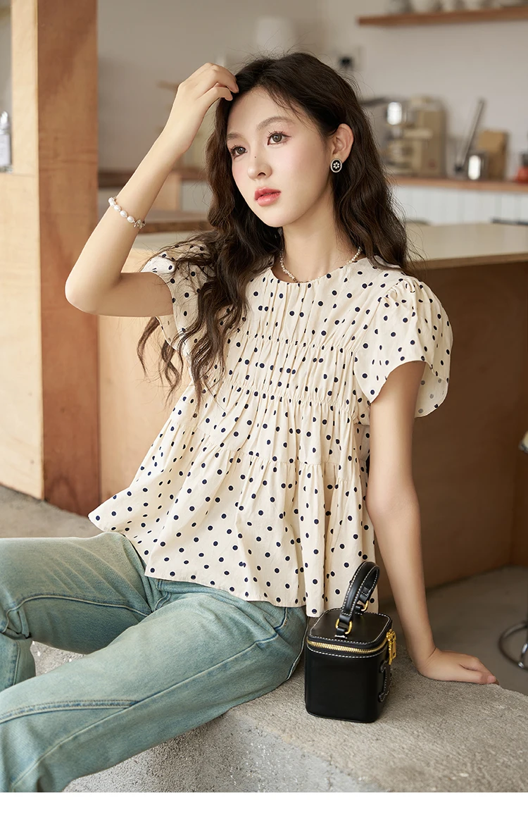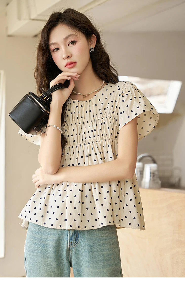 MISHOW Polka Dot Blouses for Women 2025 Summer French Flying Sleeve O Neck Elastic Folds Loose Retro Female Doll Top MXC39X1291