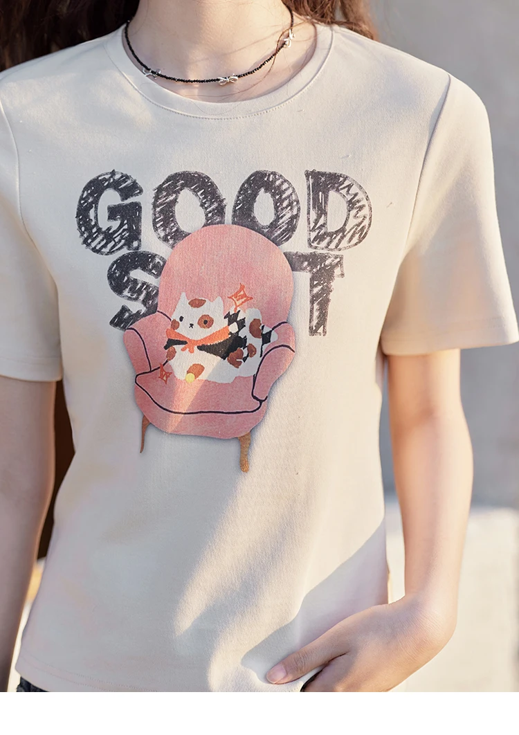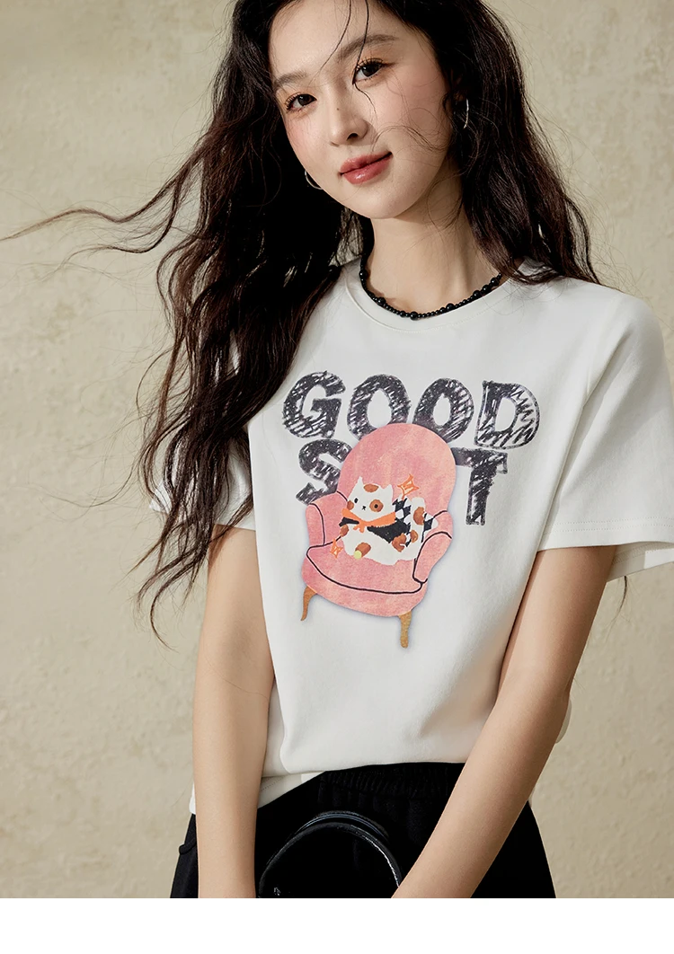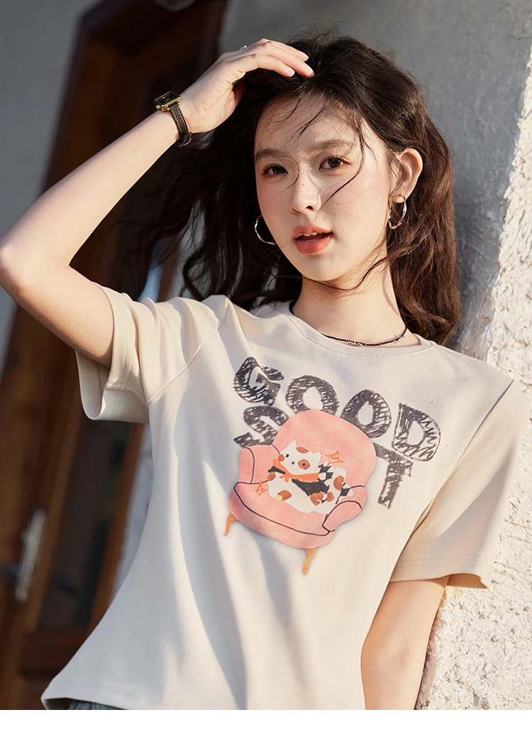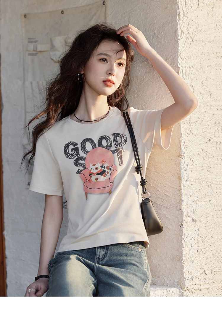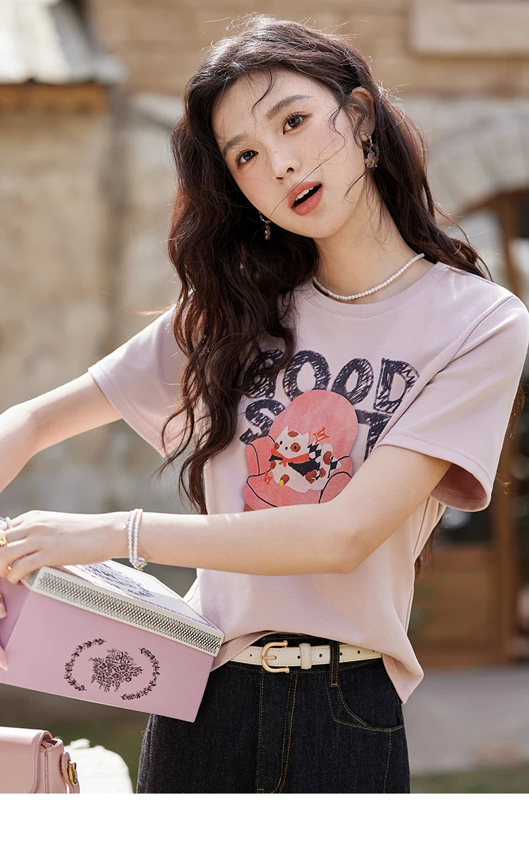 MISHOW Printed Cotton T-shirts for Women Spring 2025 Loose Slim Short Round Neck Tees Versatile Soft Casual Tops MXE13T0461