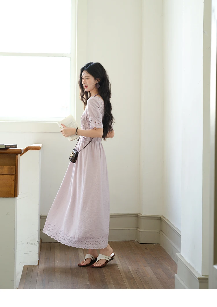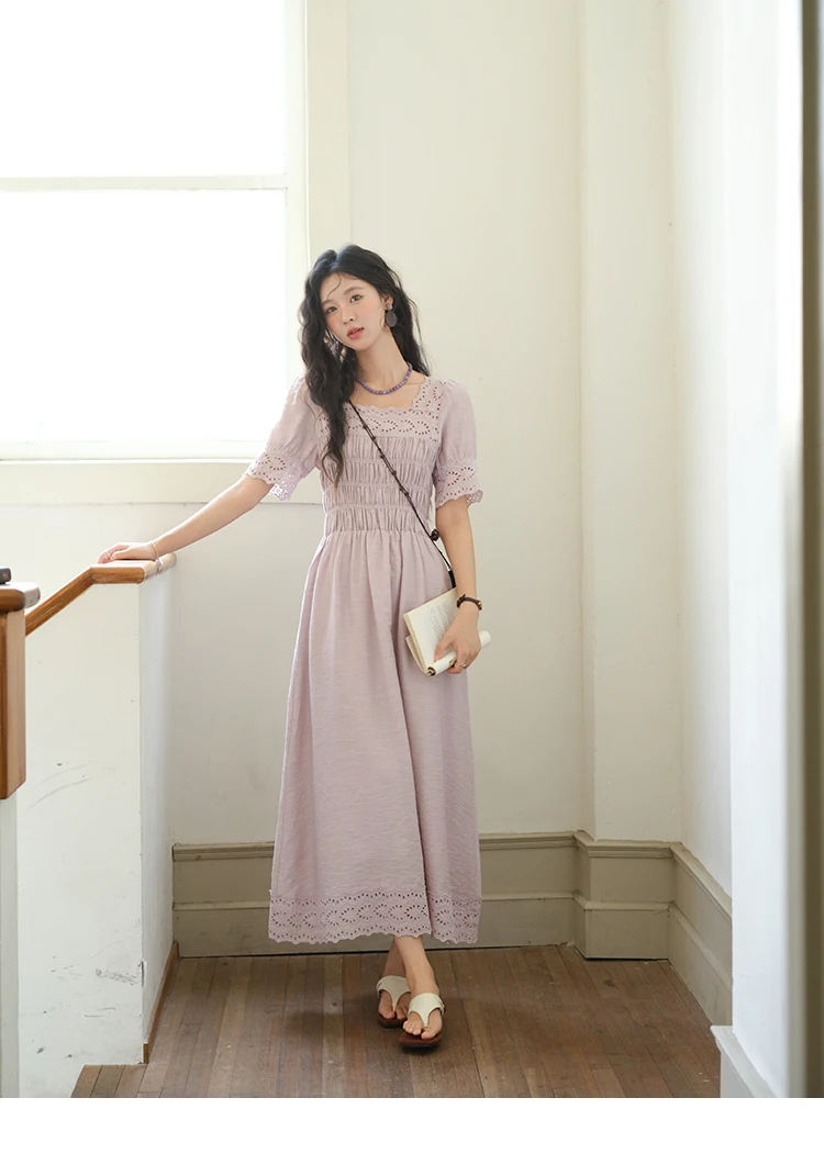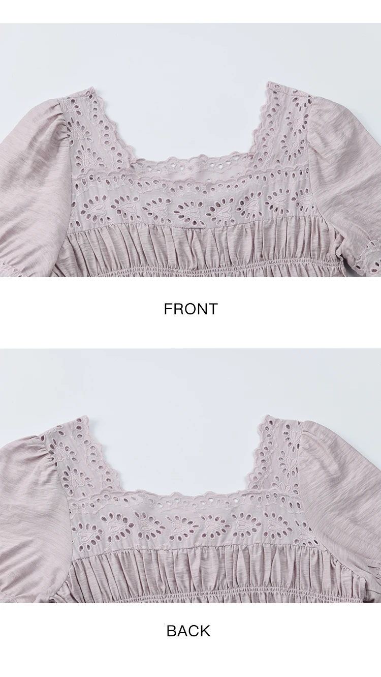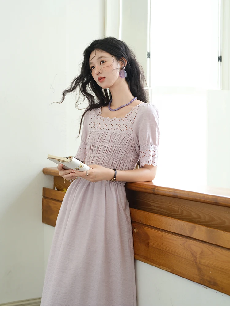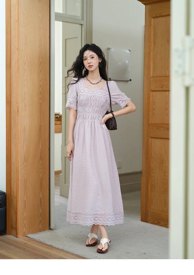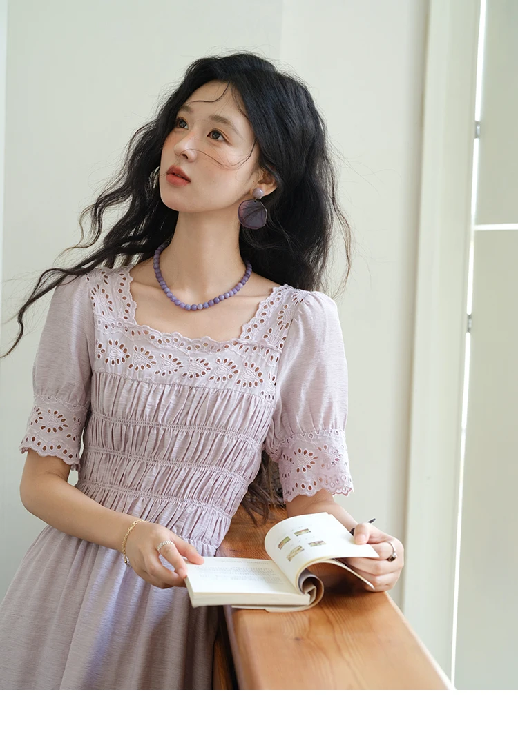 MISHOW Puff Sleeve Dress for Women 2025 Summer New Square Neck Fashion Lace Hollow Purple Dresses Female Clothing MXE39L2406