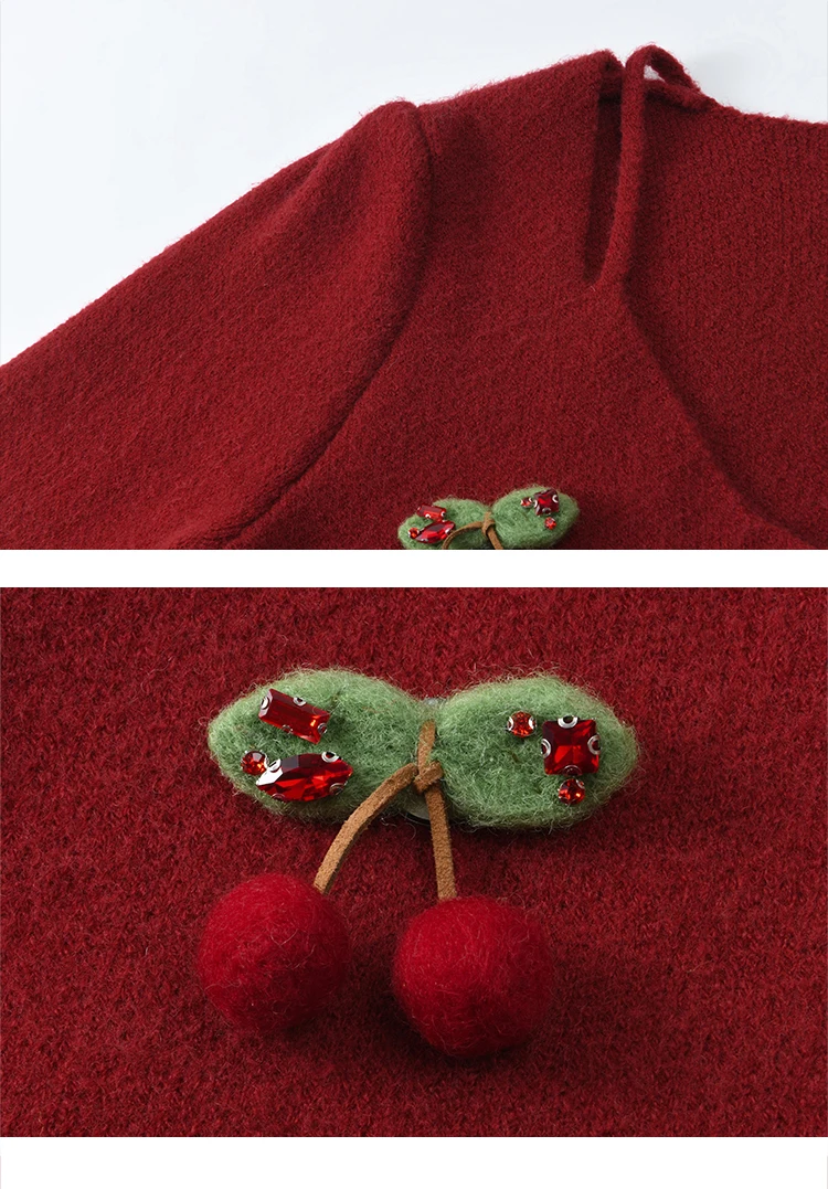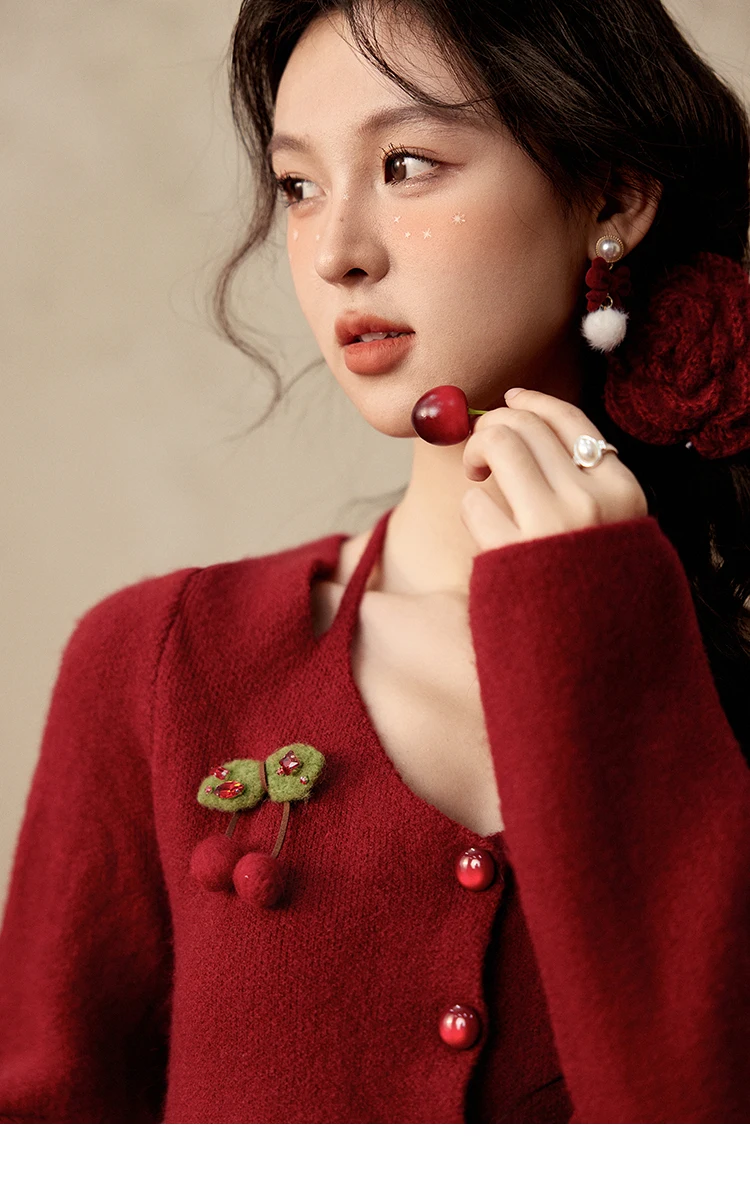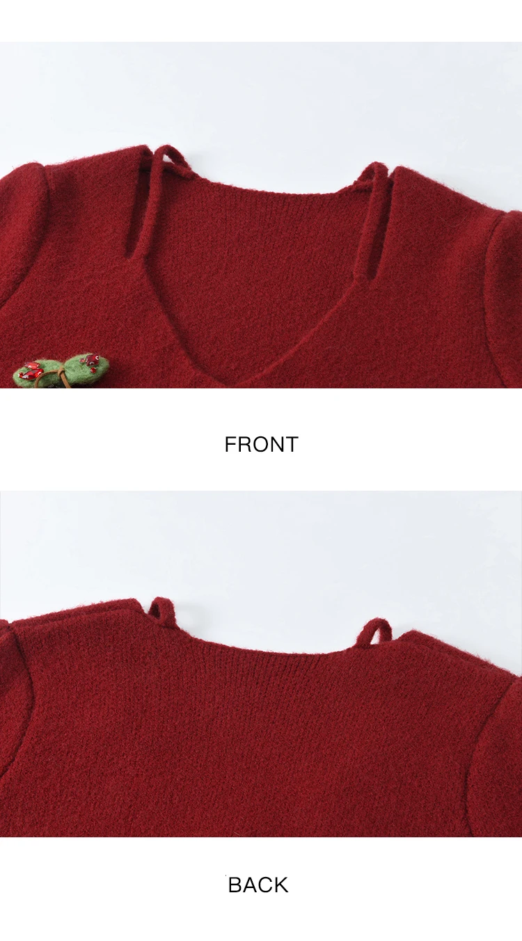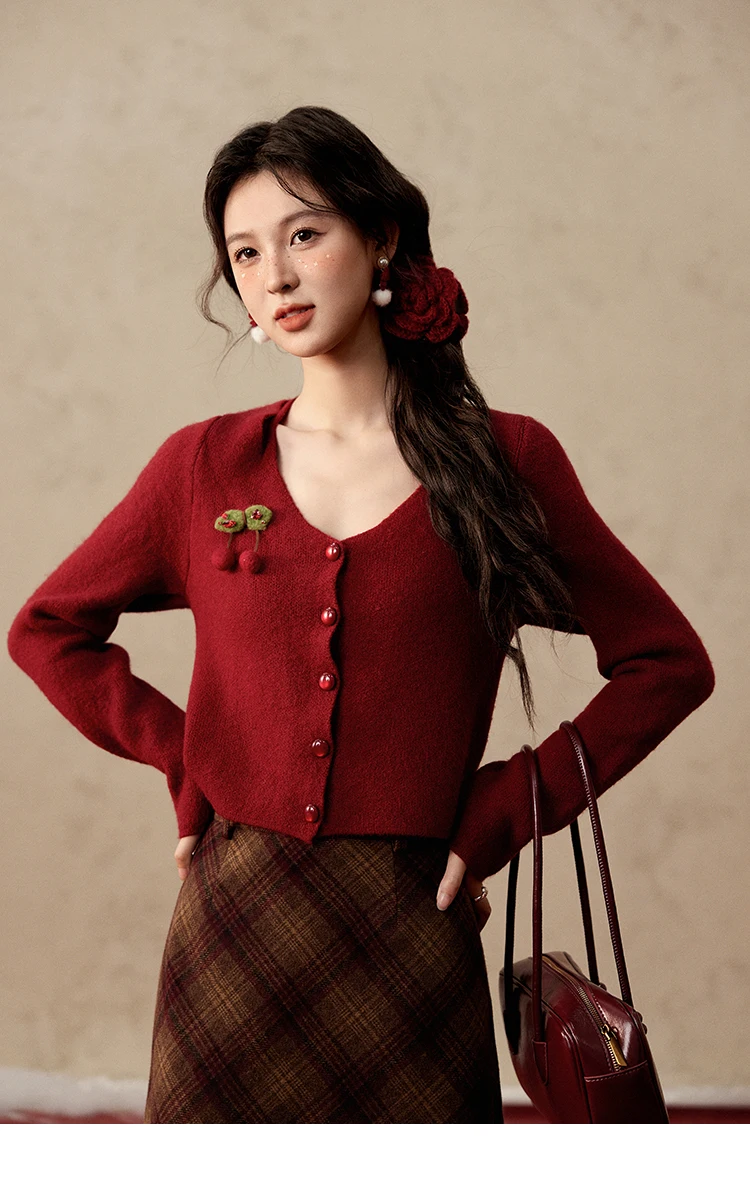 MISHOW Red Knitted Short Cardigan Women Autumn Winter New Cherry Ornaments Sweet Slim Fit V-neck Long Sleeve Tops MXD112Z1006