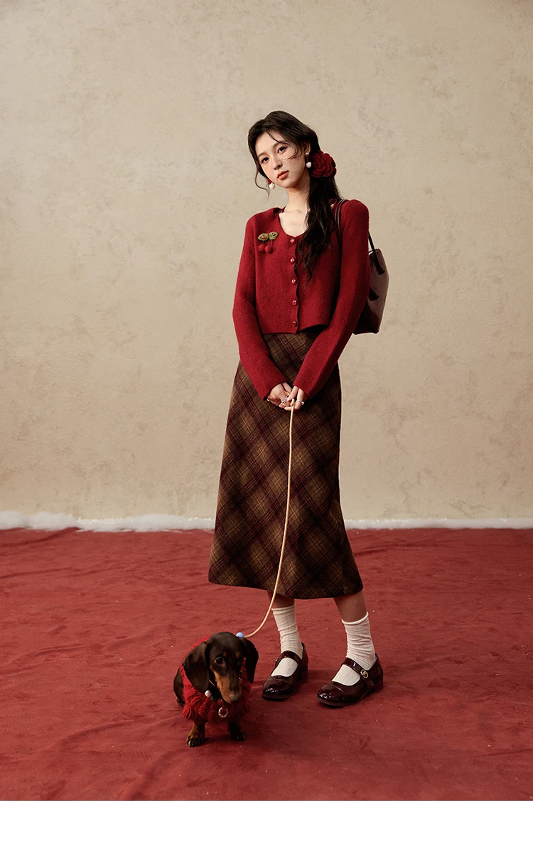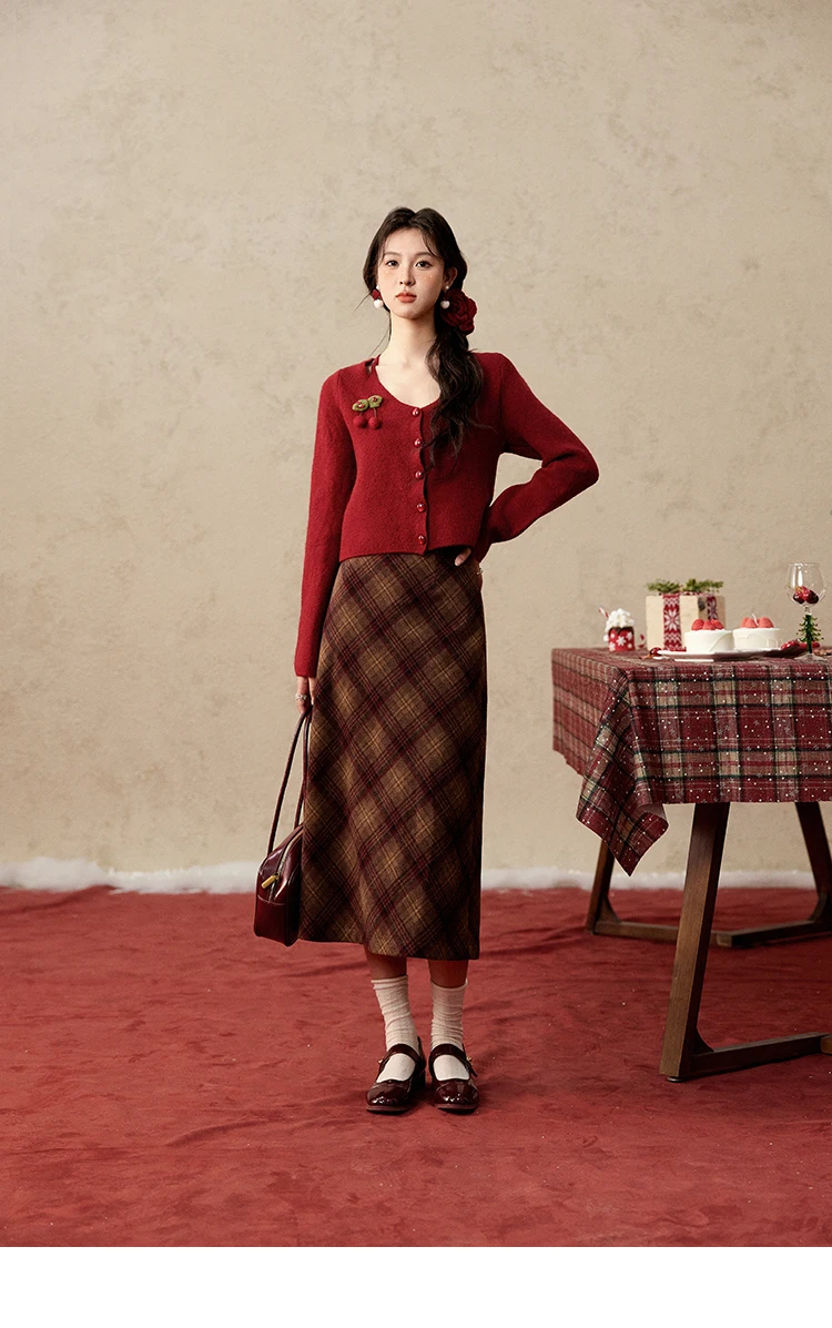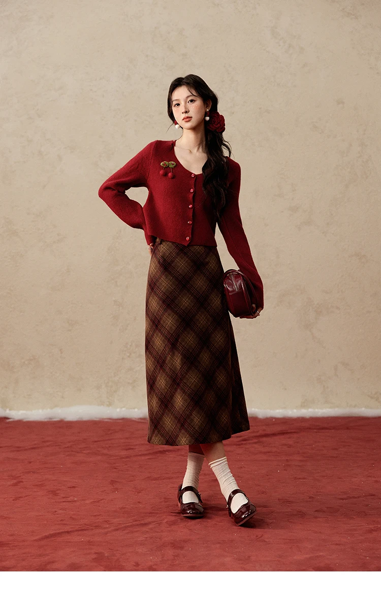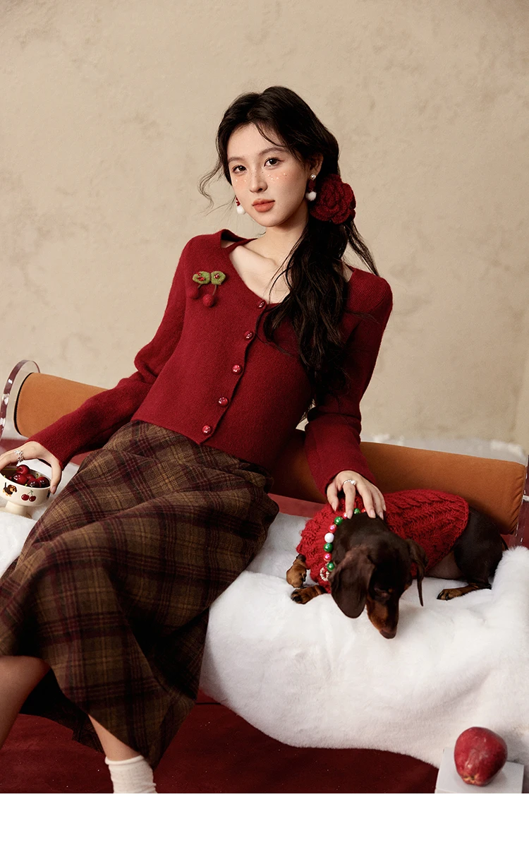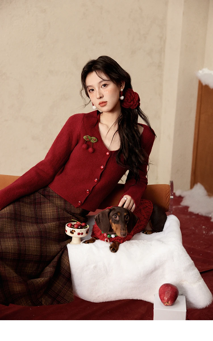 MISHOW Red Knitted Short Cardigan Women Autumn Winter New Cherry Ornaments Sweet Slim Fit V-neck Long Sleeve Tops MXD112Z1006