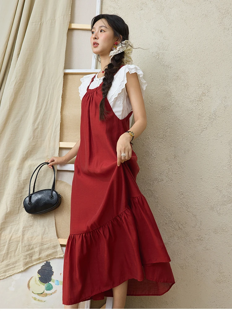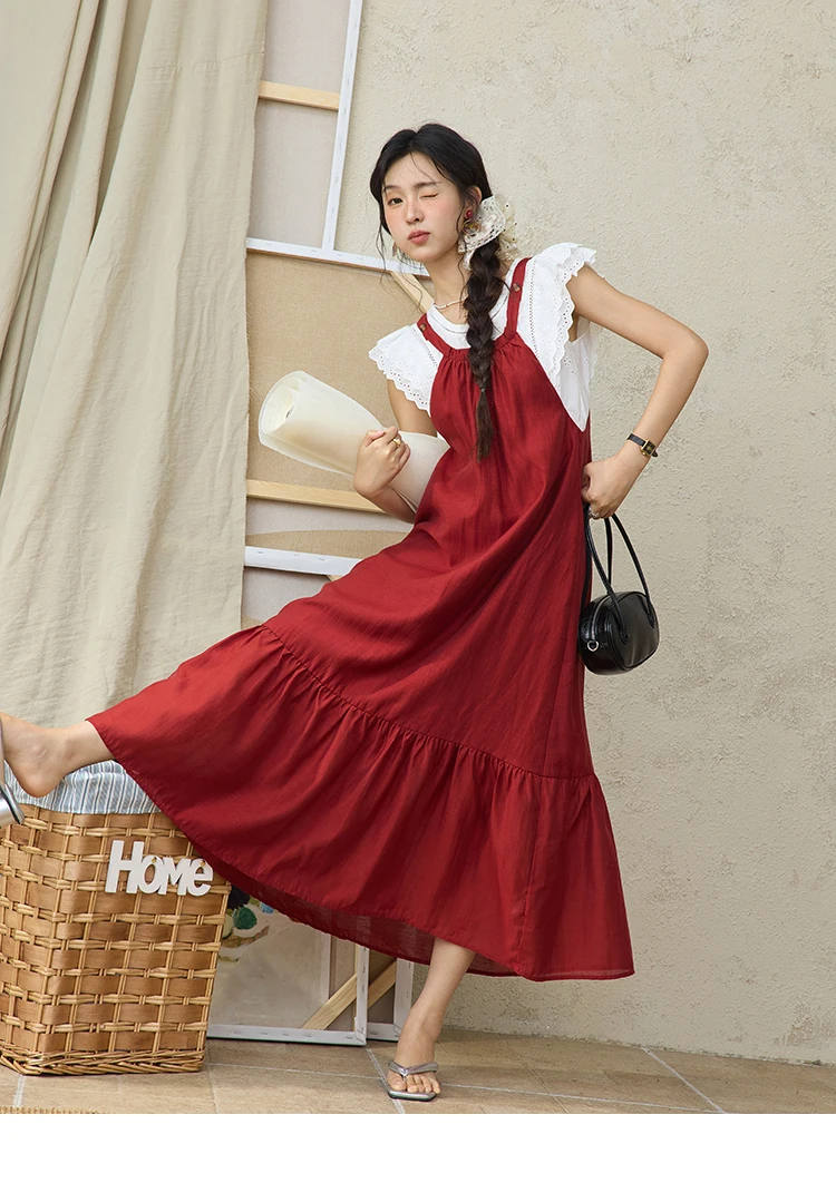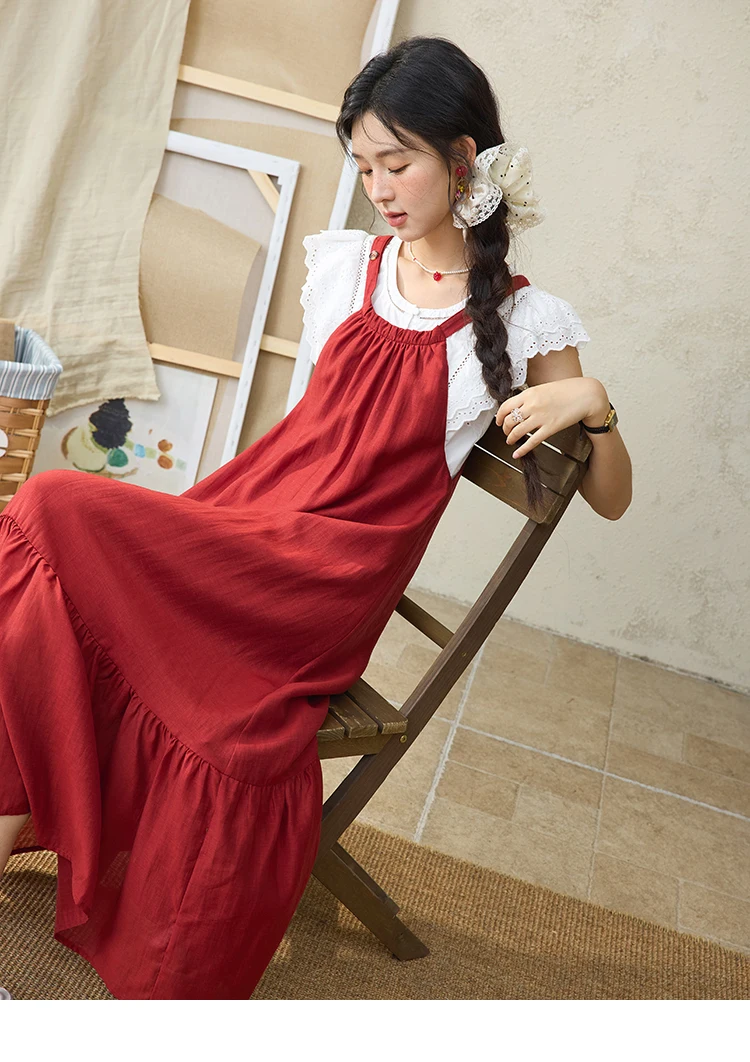 MISHOW Red Linen Strap Midi Dress Summer Sleeveless Casual Vacation Dress Hanging Neck Loose A-LINE Dress (Not A Set) MXE36L2309