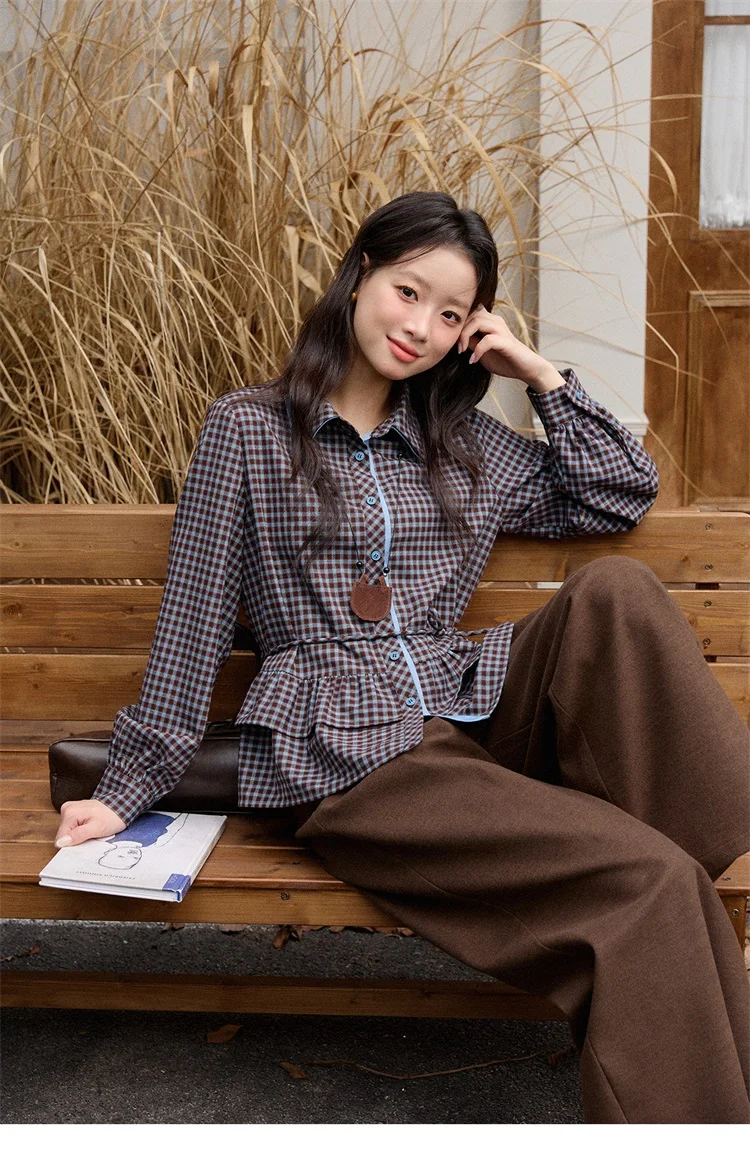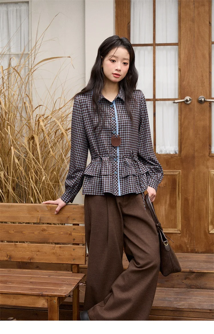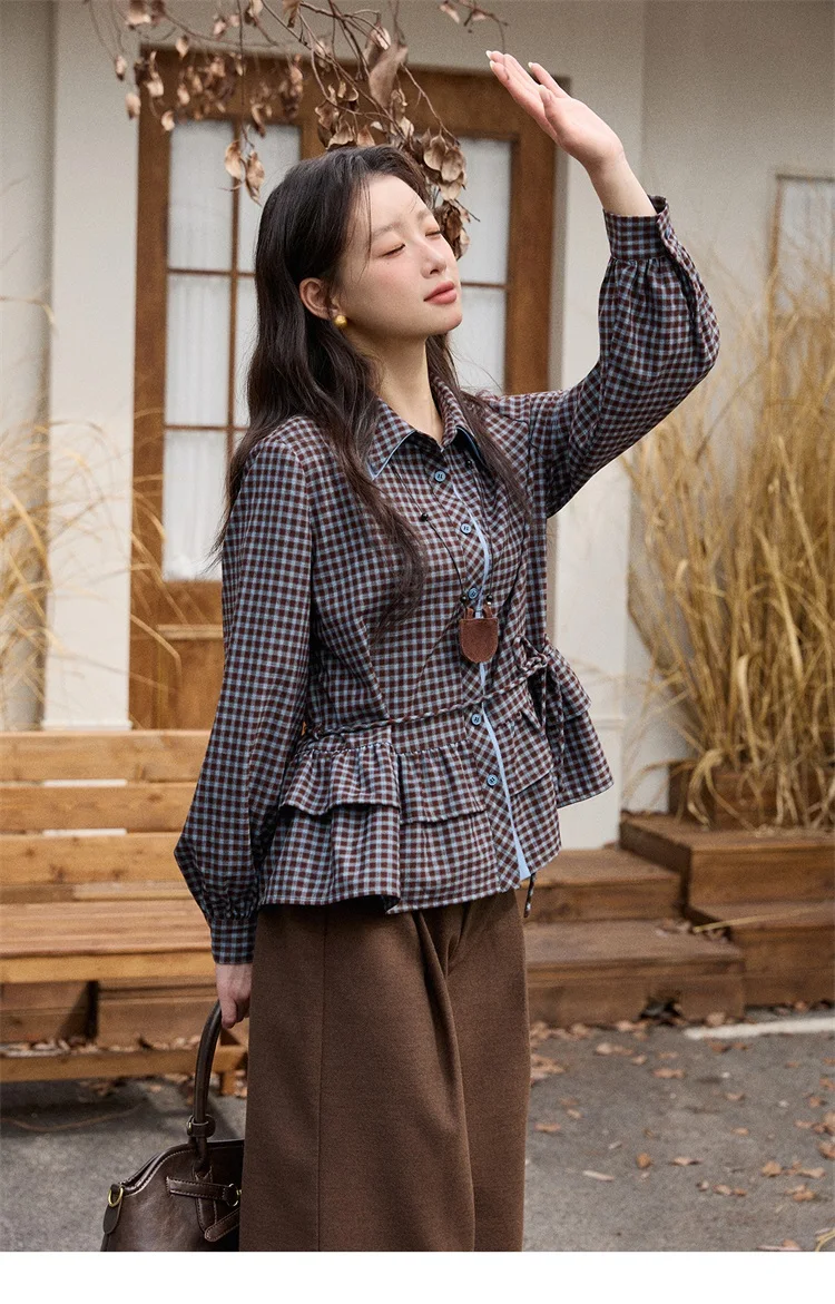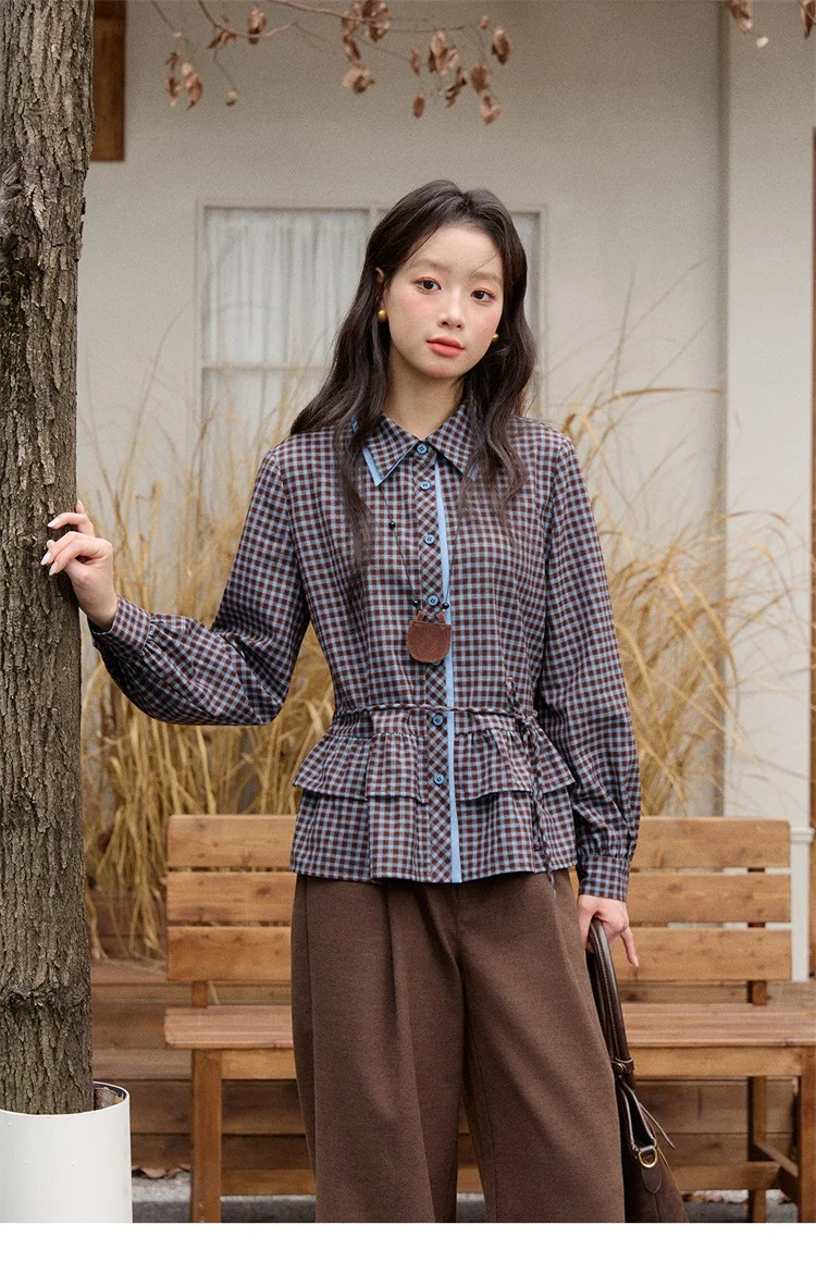MISHOW Retro Blue Plaid Shirt for Women 2025 Autumn Winter Lapel Lantern Sleeves Ruffled Hem Top Slim Casual Shirt MXE89C2420