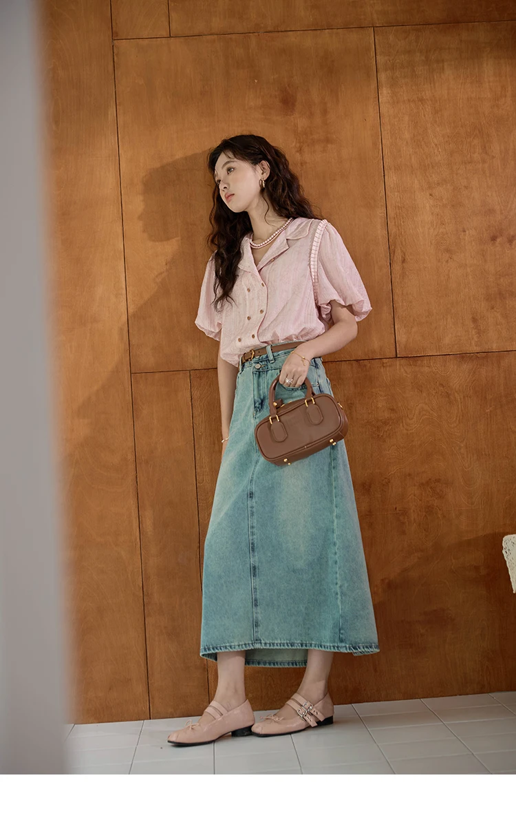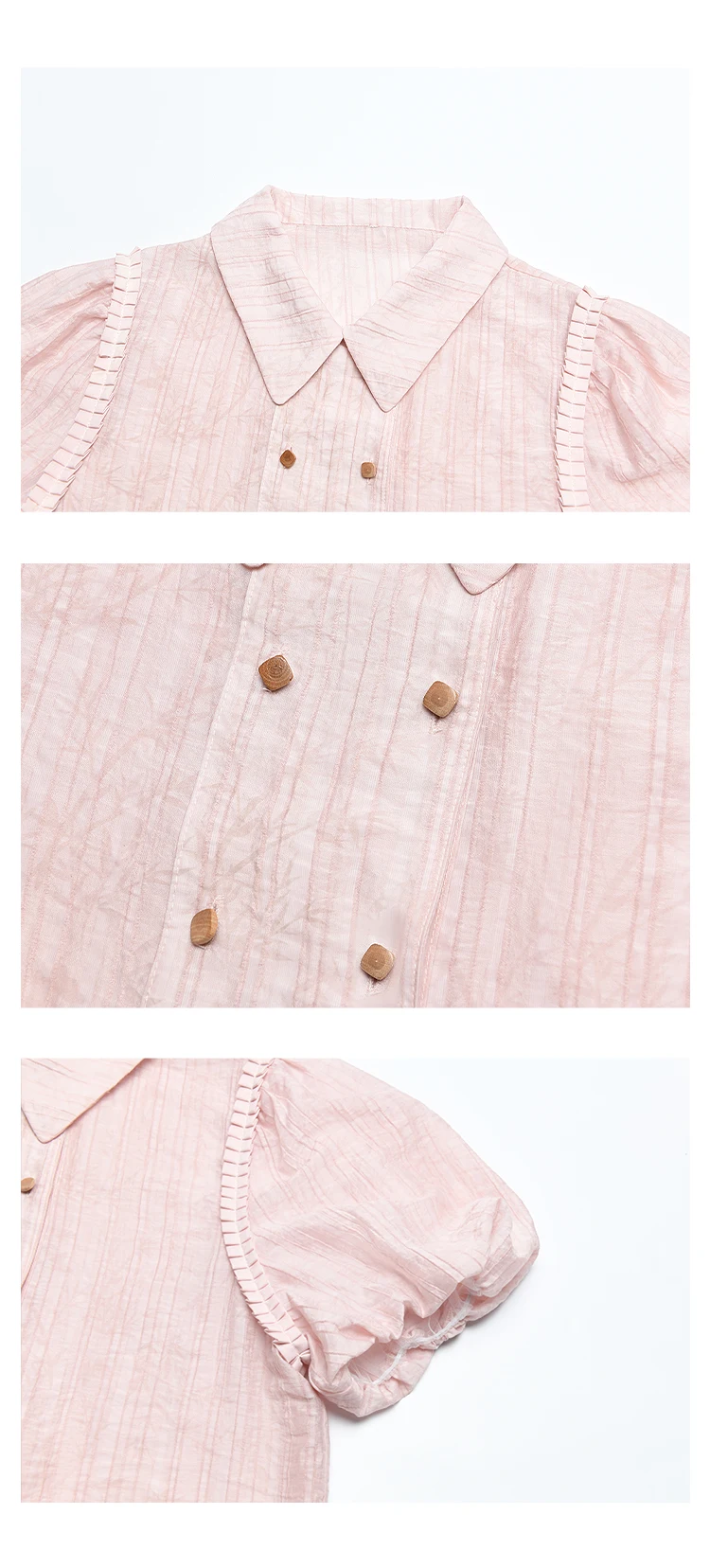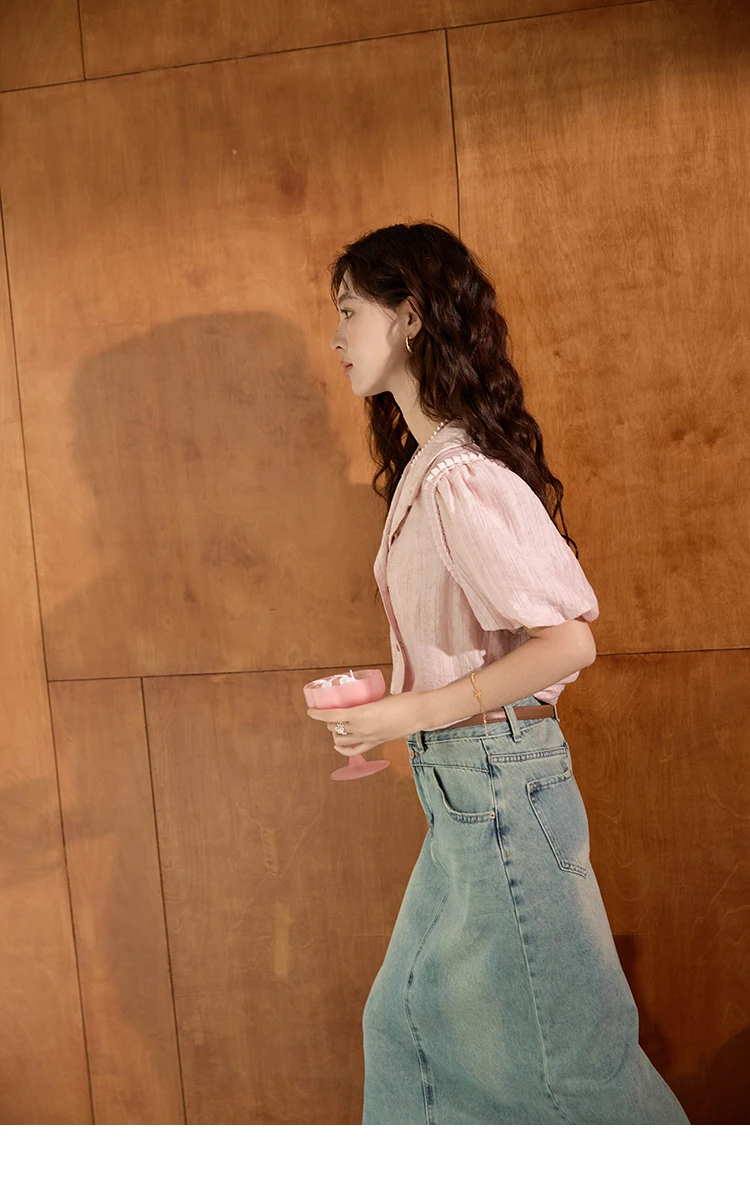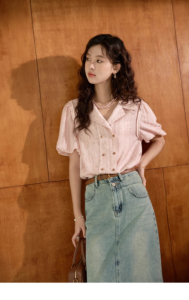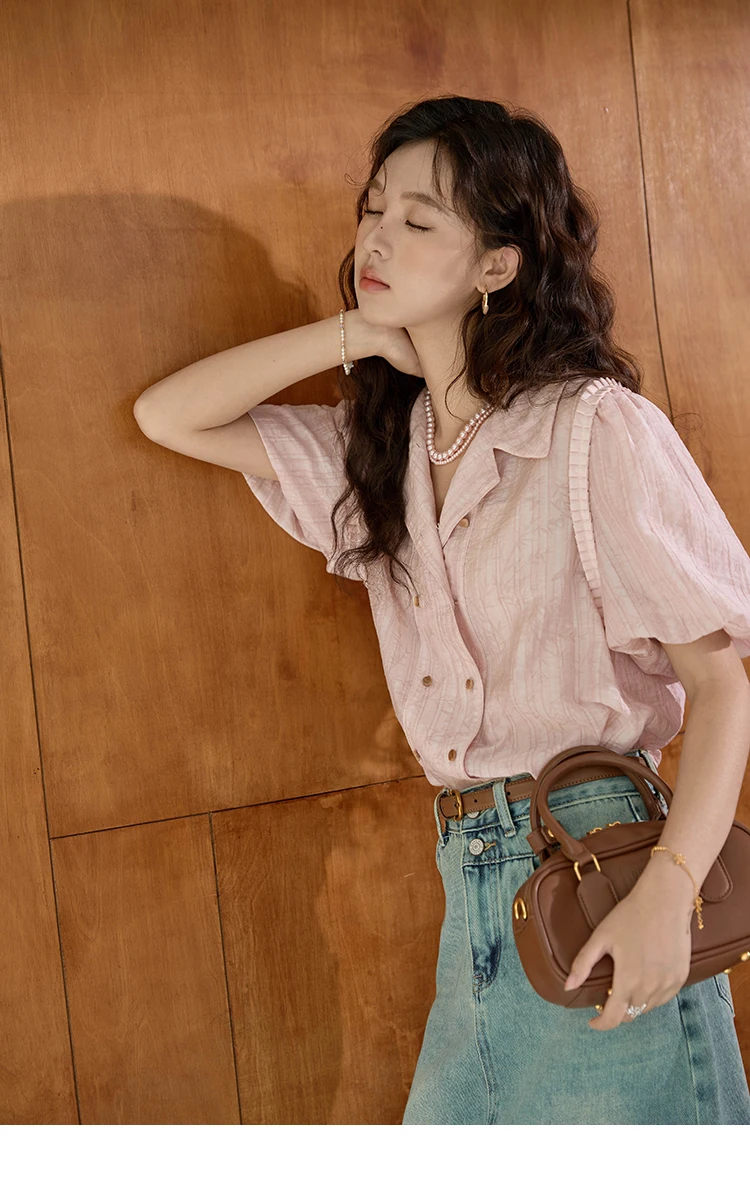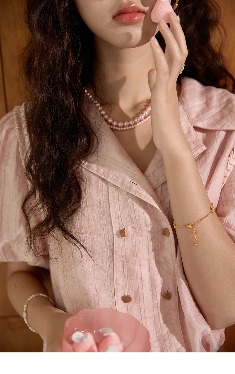 MISHOW Retro Pink Short Sleeved Shirt 2024 Summer V-neck Folded Ruffled Edge Top Elastic Cuffs Lapel Neck Blouses MXD29C0273