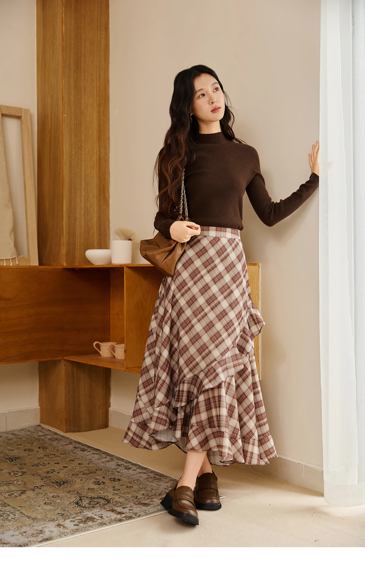 MISHOW Retro Plaid Skirt for Women Autumn 2025 Irregular Ruffle Edge Mid Length Skirt Women Back Elastic Waist Skirts MXE43B2396