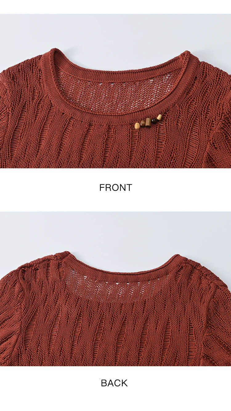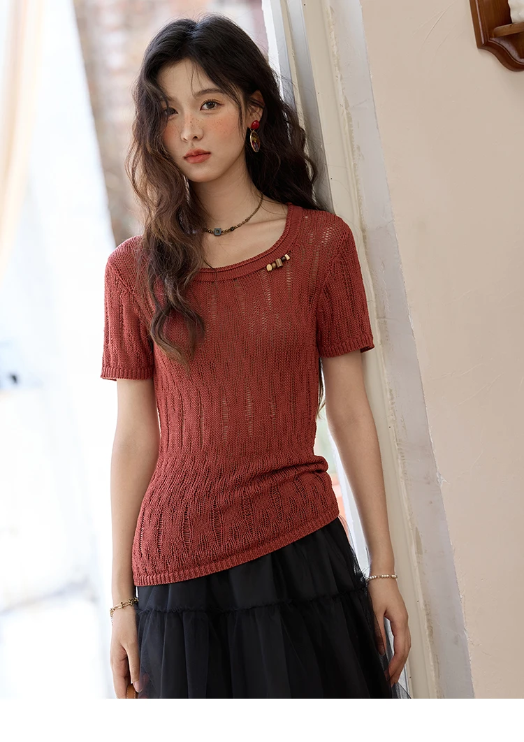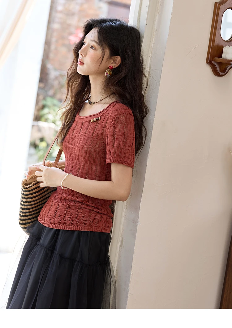 MISHOW Retro Red Hollow Thin Knitted Sweater Shirt for Women 2025 Summer Beads Short Sleeves Knitted Breathable Top MXE35Z1271