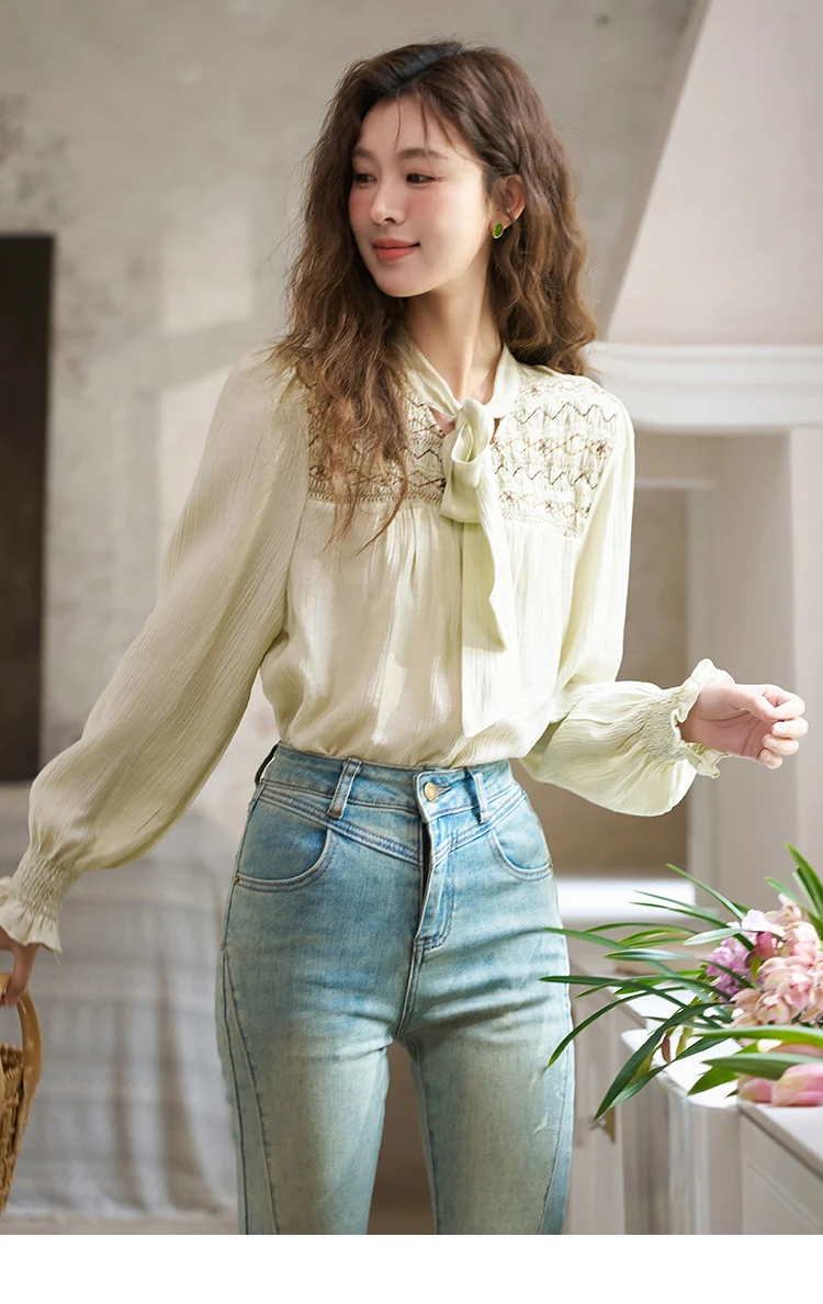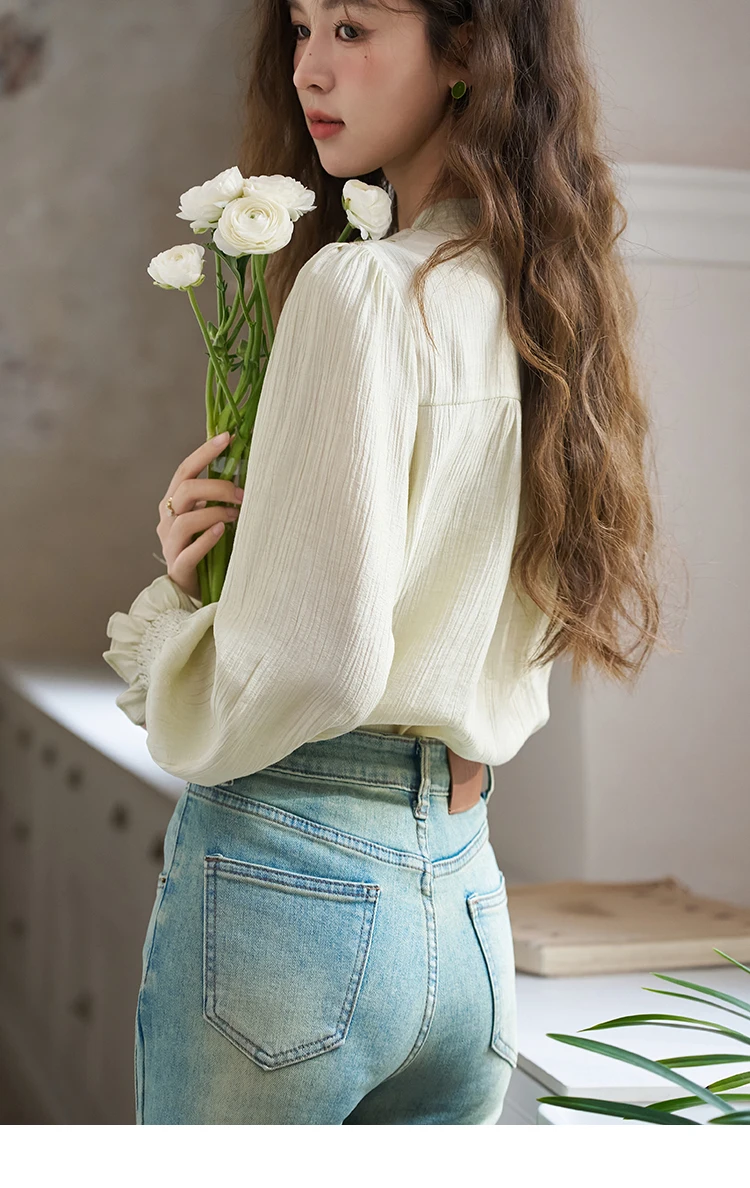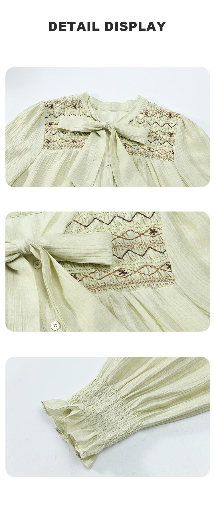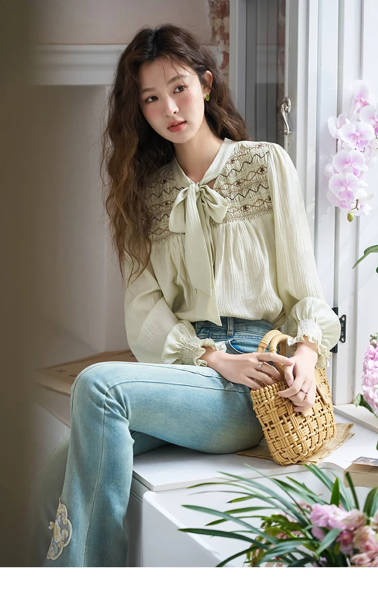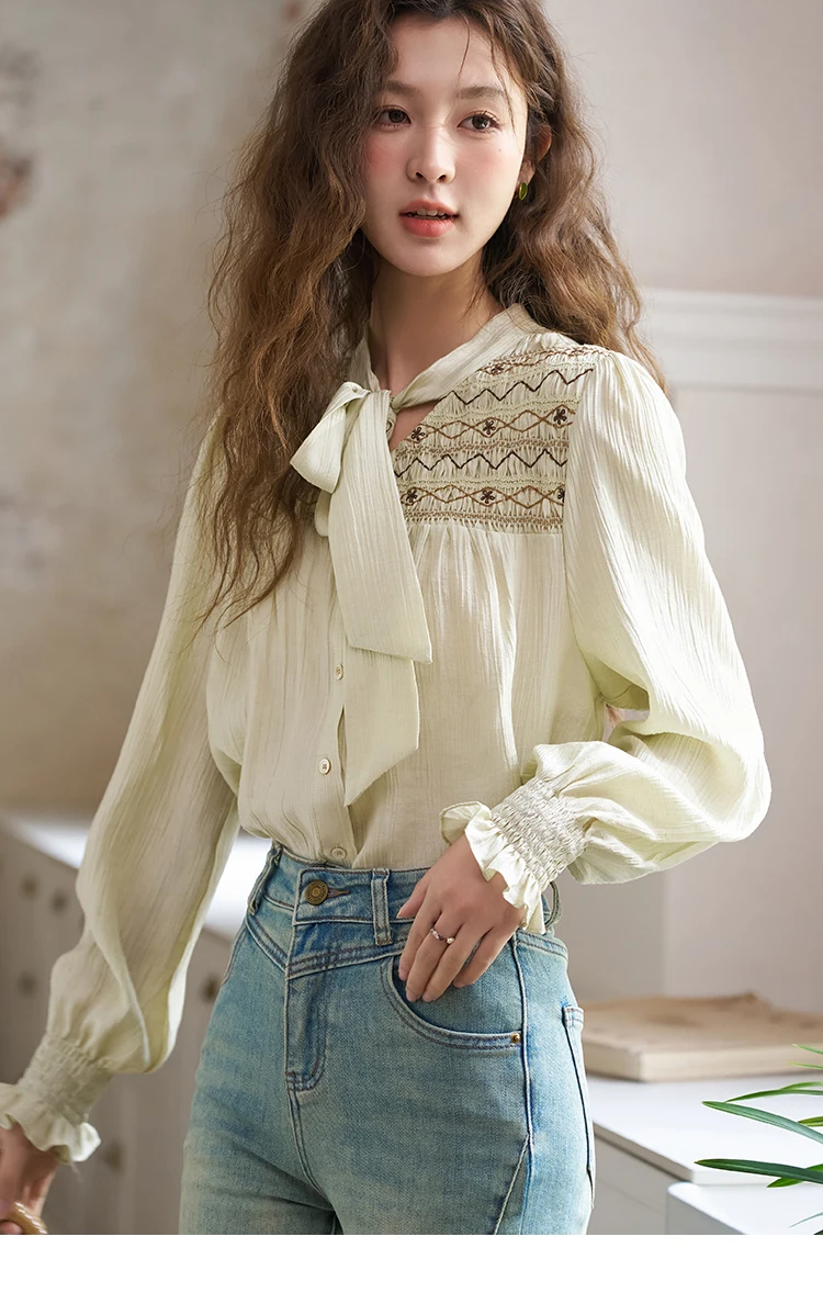 MISHOW Ribbon Collar Shirt for Women Autumn 2025 Sweet Cuffs Pleated Embroidered Petal Sleeve Loose Top Office Lady MXD14C0226