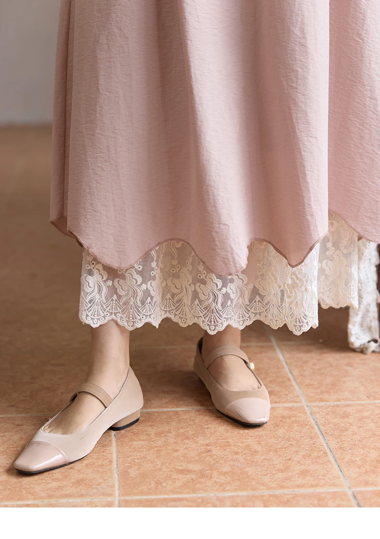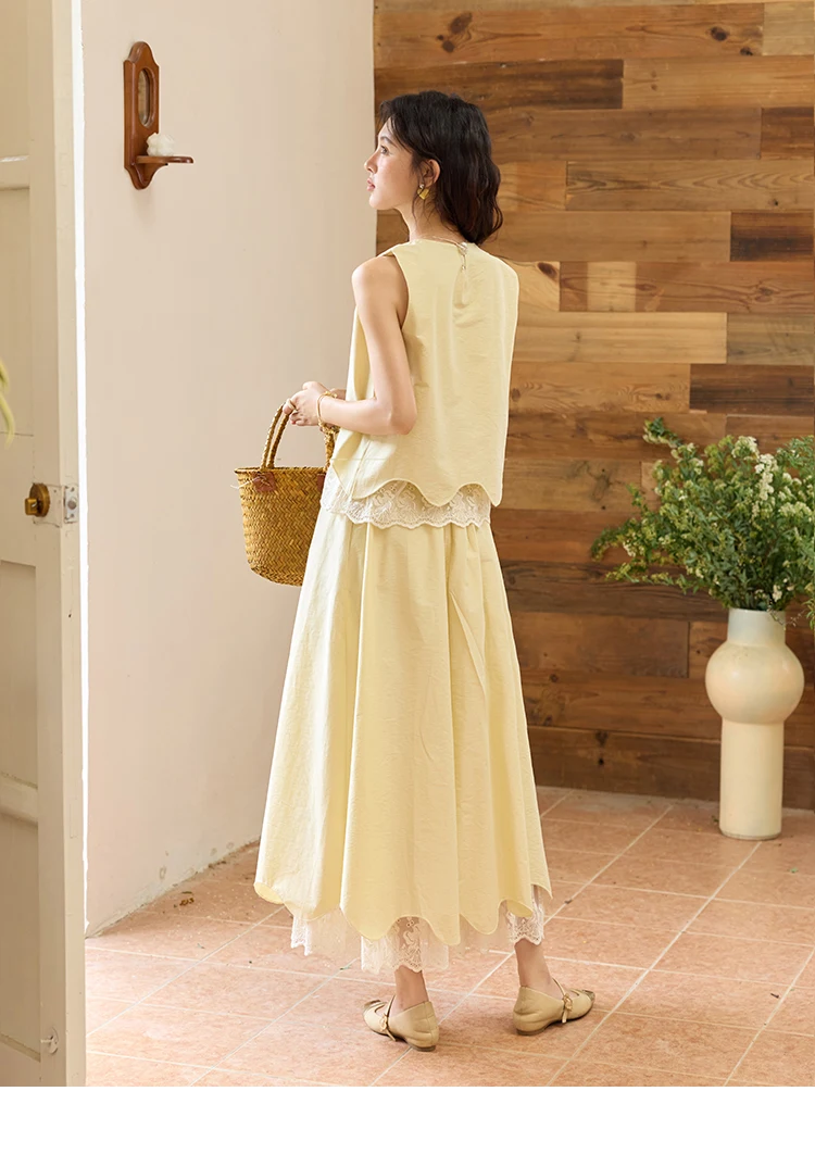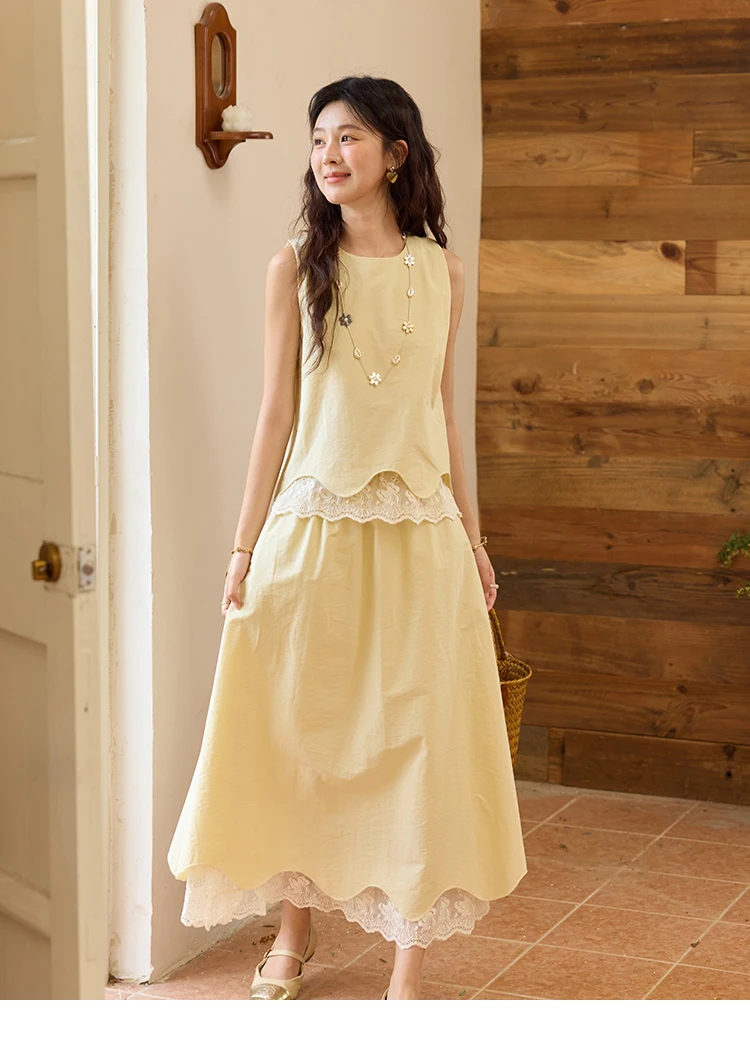MISHOW Set 2 Piece 2025 Summer Women's O-Neck Lace Patchwork Sleeveless Top Elastic Waist Midi Skirt Elegnat Set MXE36T0641