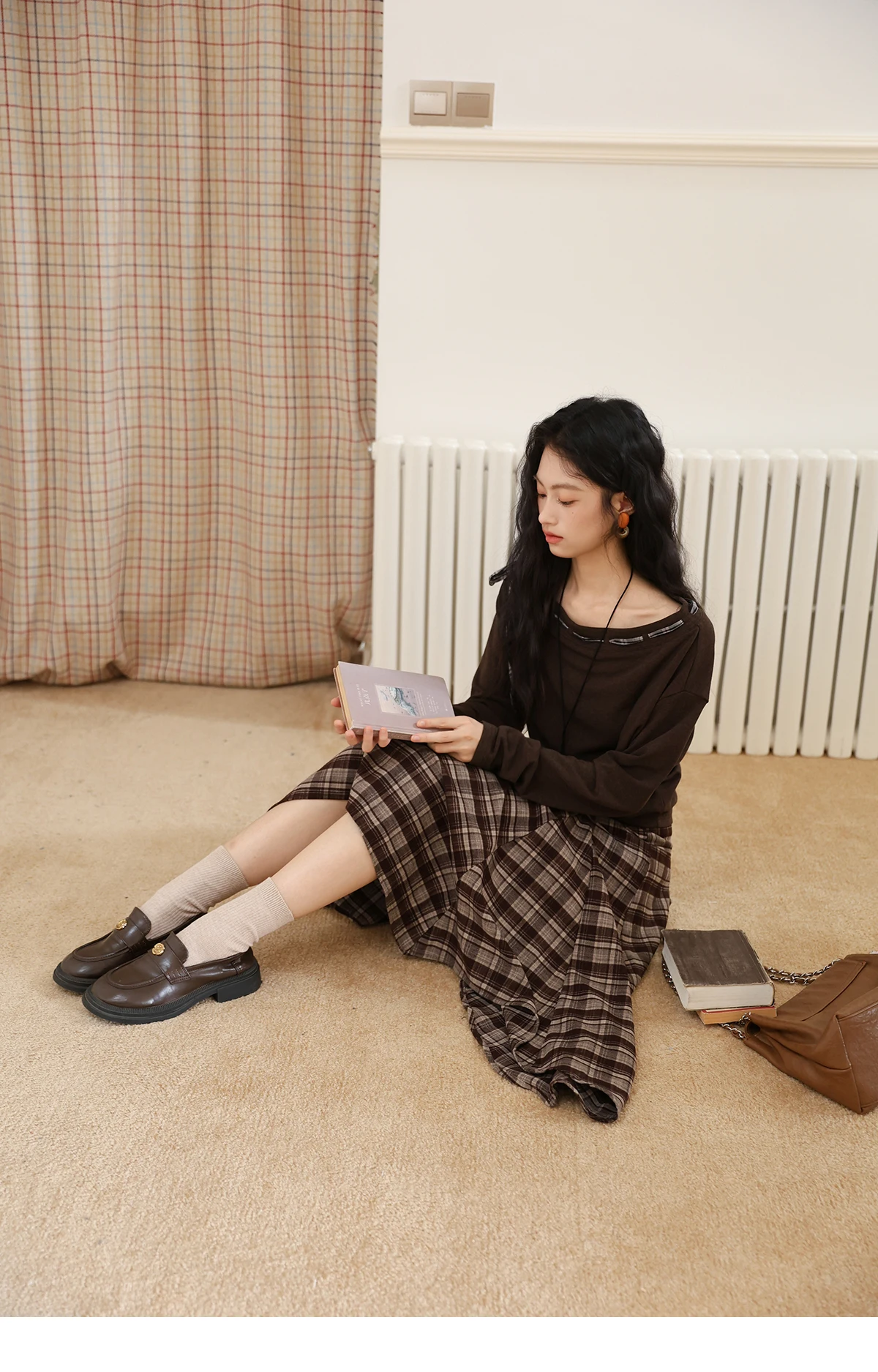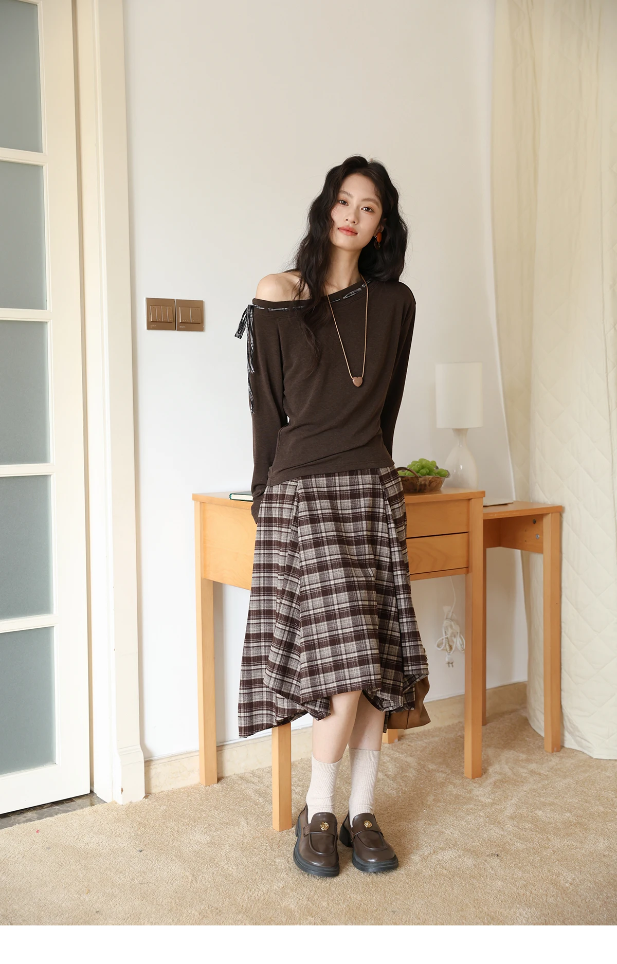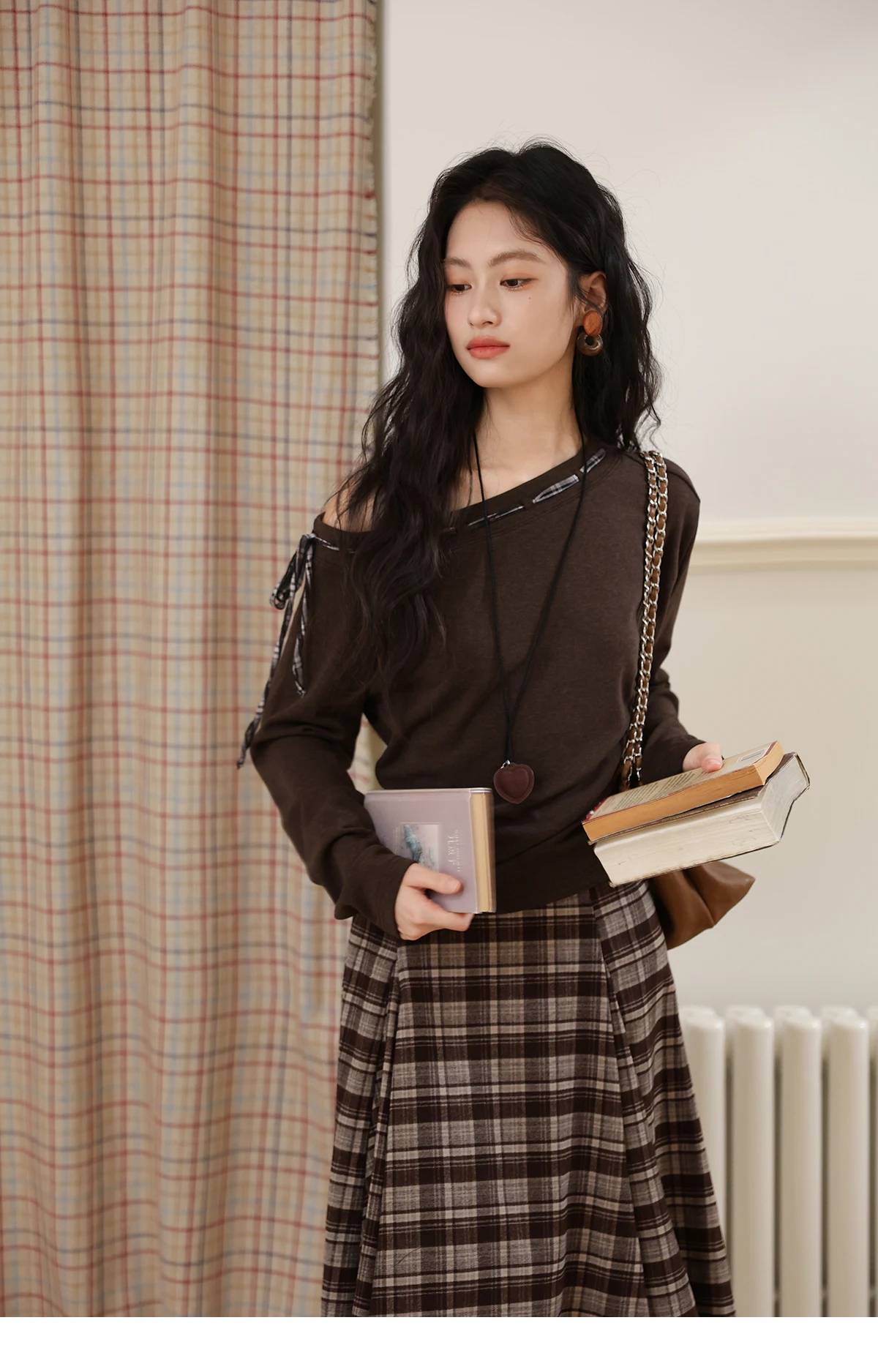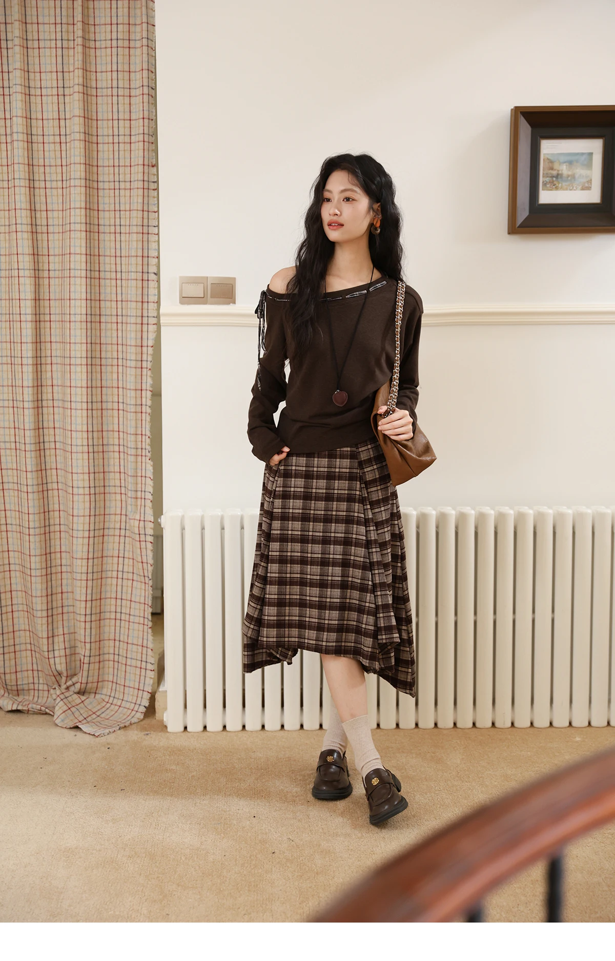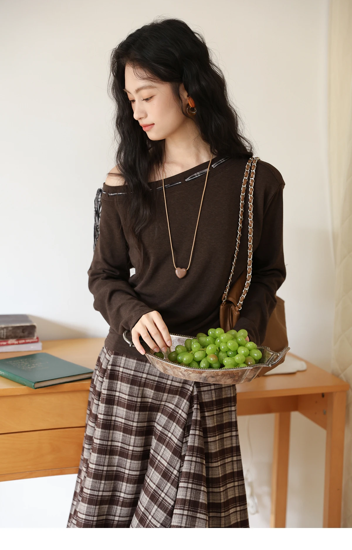 MISHOW Slant Shoulder Knitted Top for Women Autumn 2025 Drak Brown Plaid Strap Design Tops Casual Knitted Base Top MXE45T1402