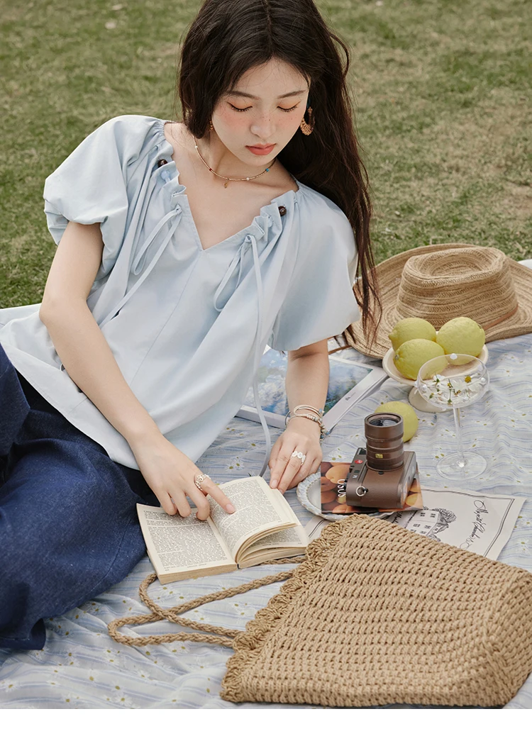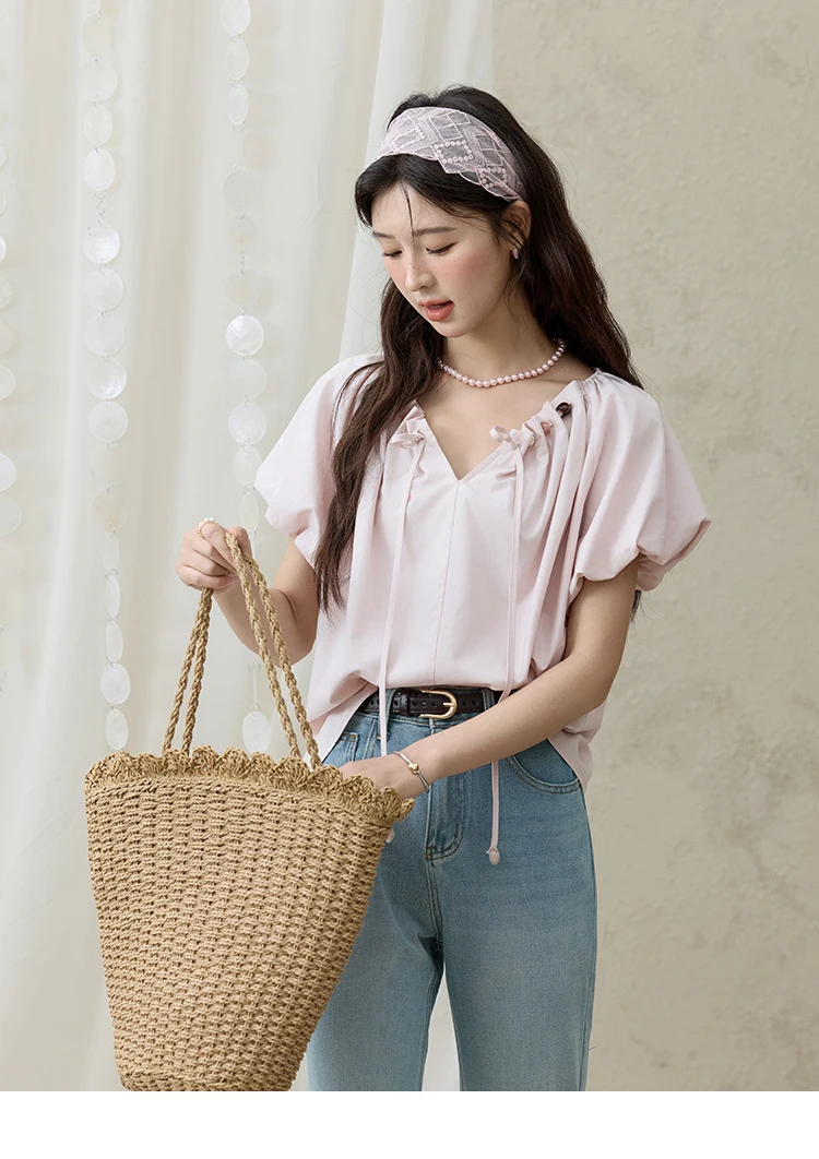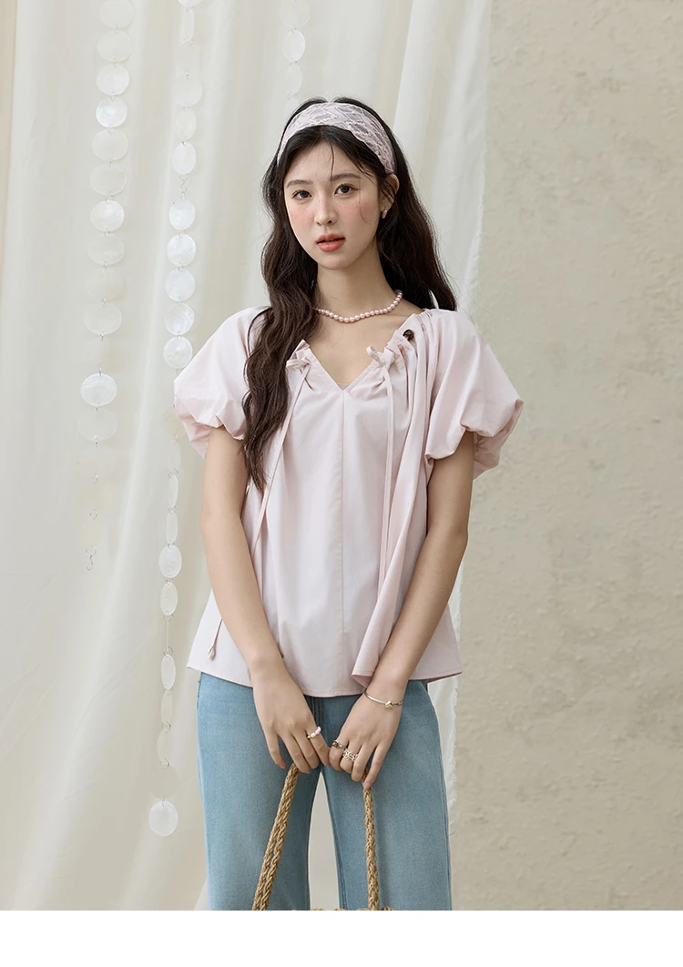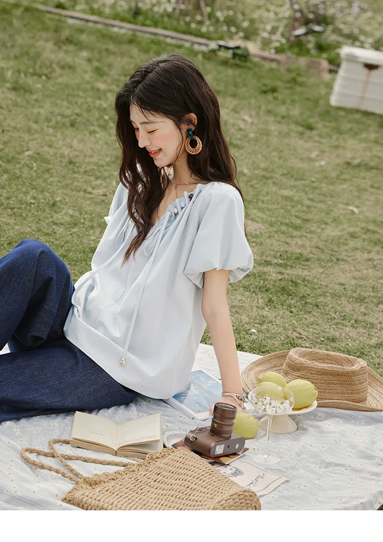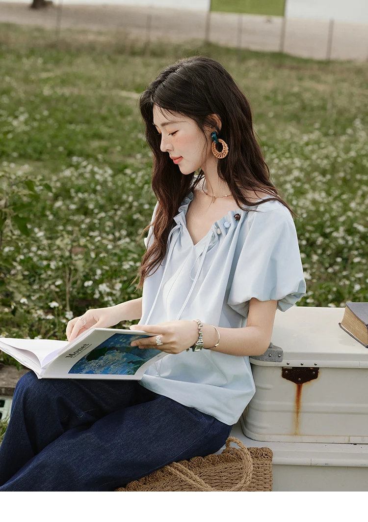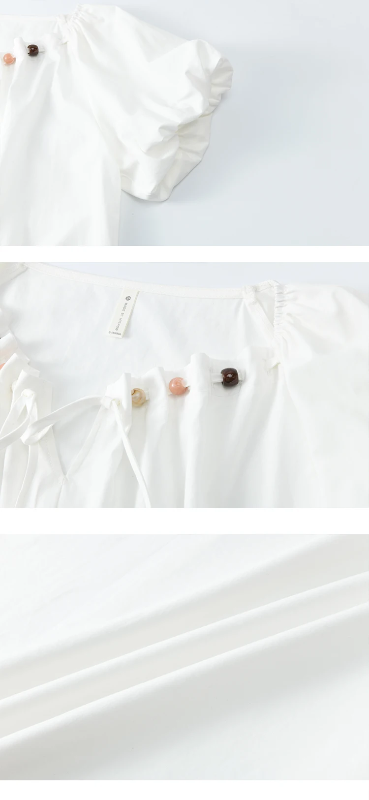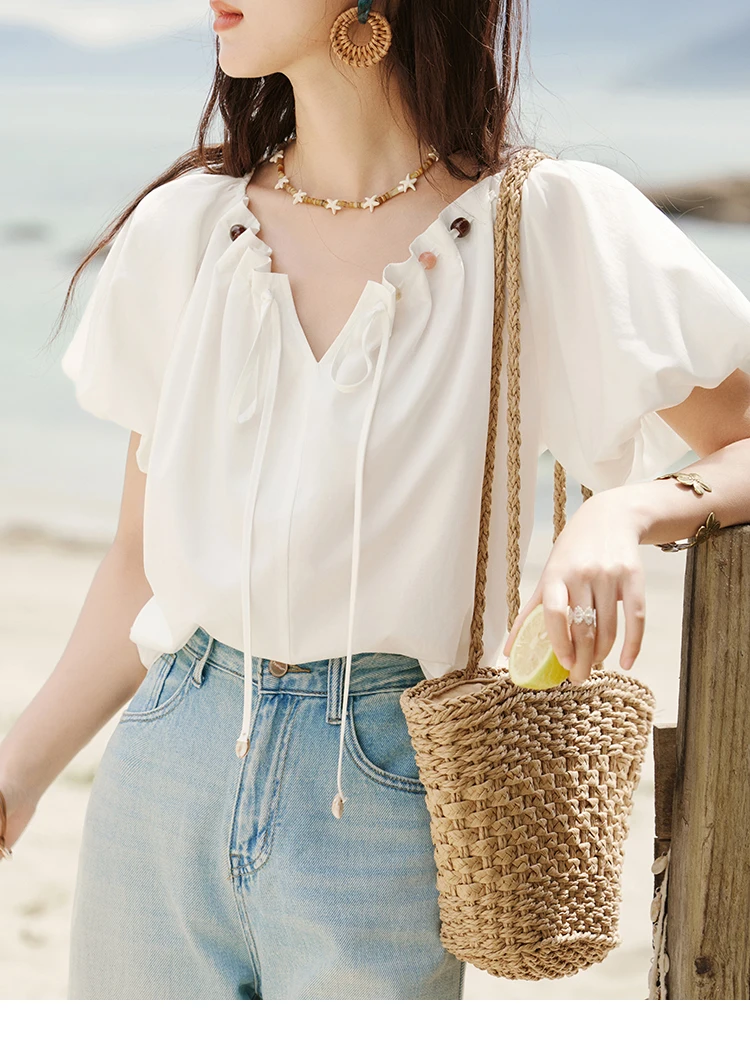 MISHOW Solid French Summer Blouses Woman 2025 New Short Puff Sleeve V-neck Beaded Retro Shirts Women Fashion Tops MXE33X1757