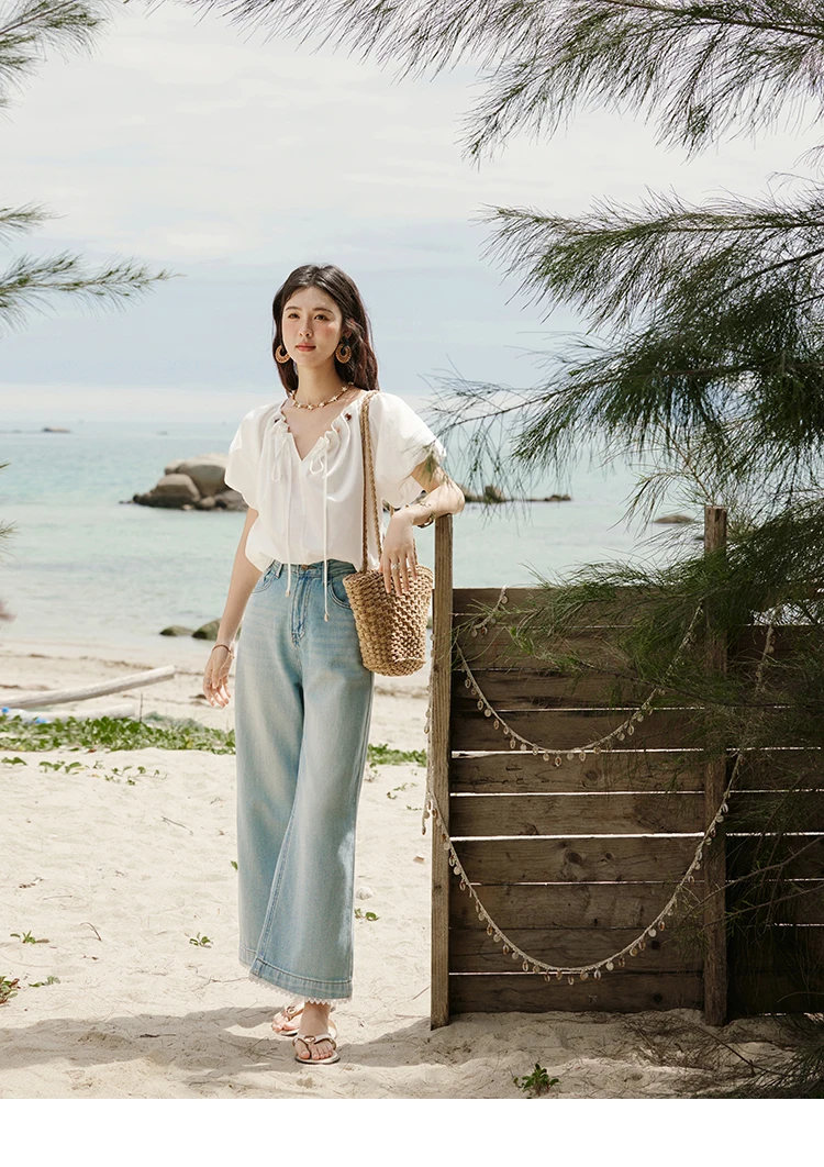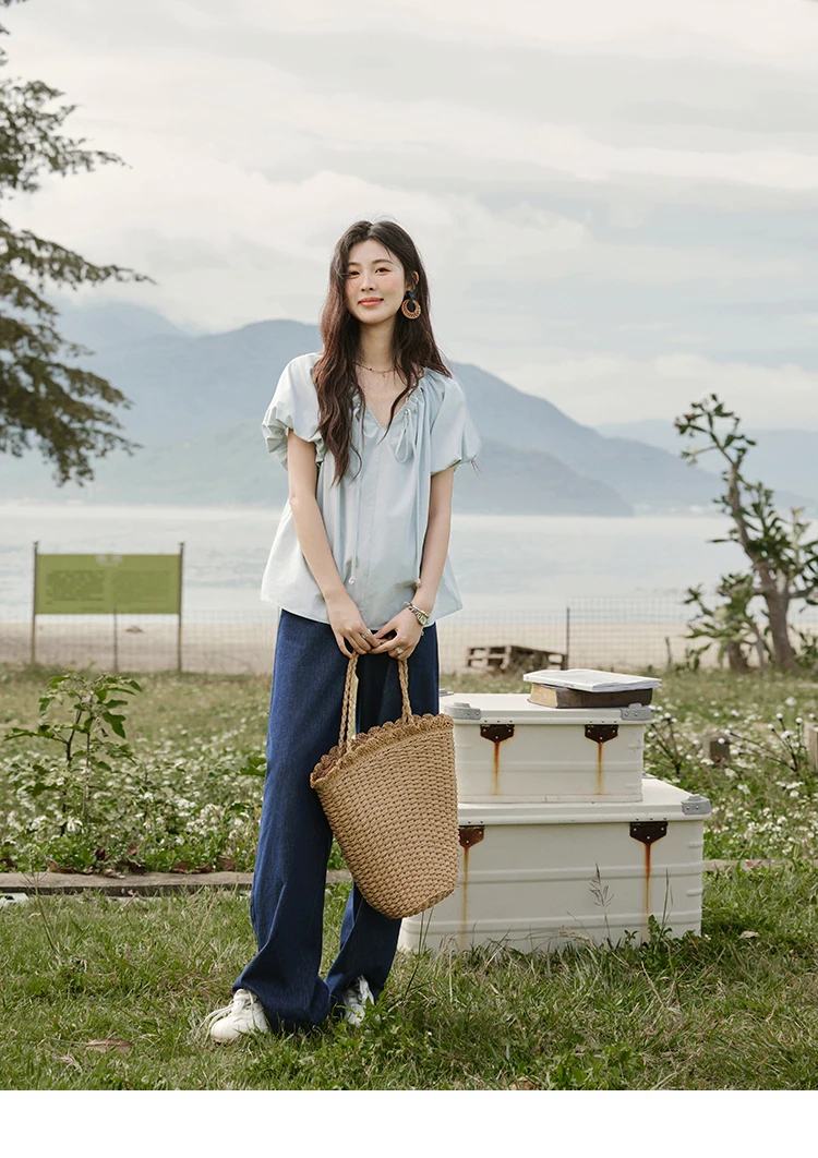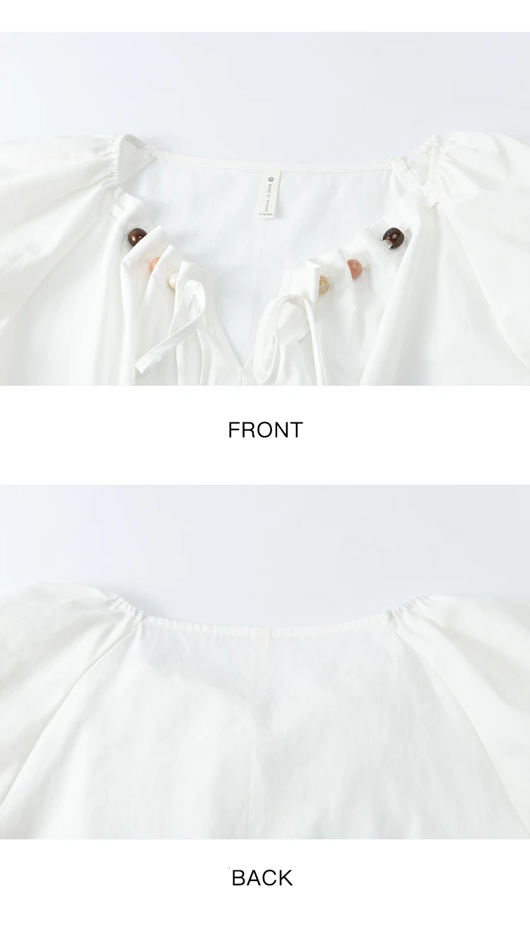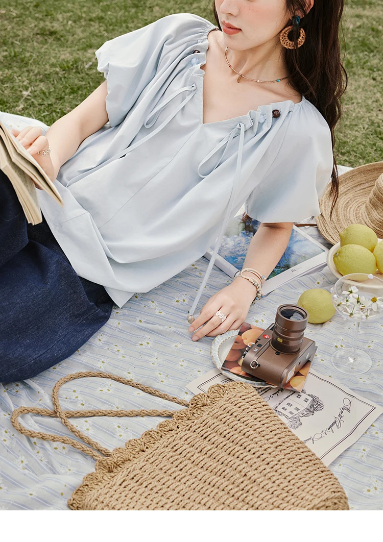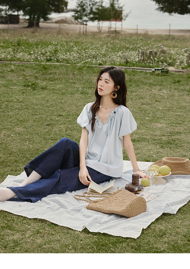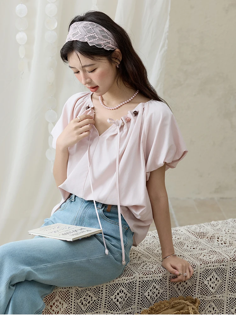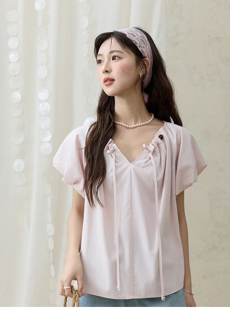 MISHOW Solid French Summer Blouses Woman 2025 New Short Puff Sleeve V-neck Beaded Retro Shirts Women Fashion Tops MXE33X1757