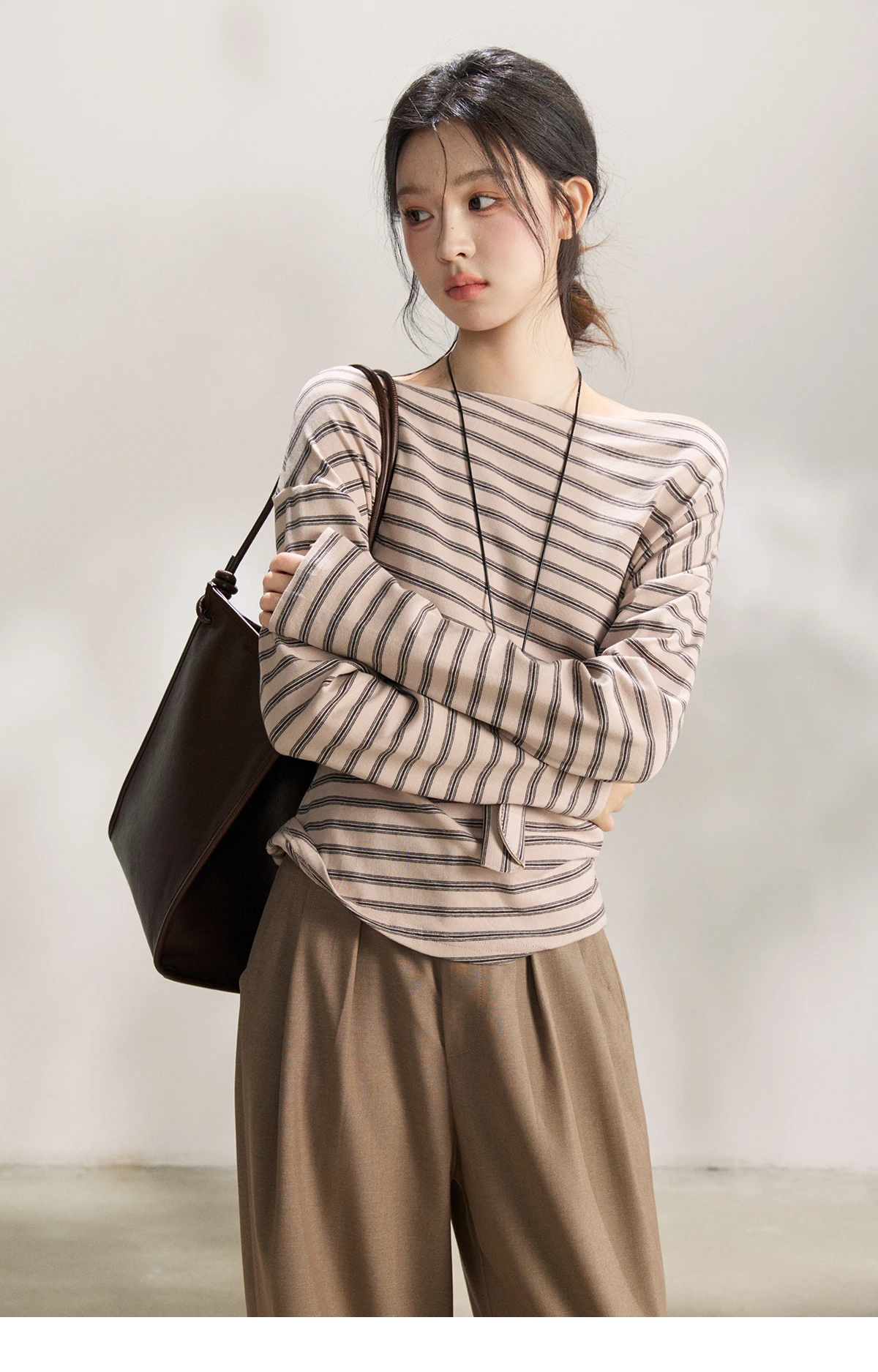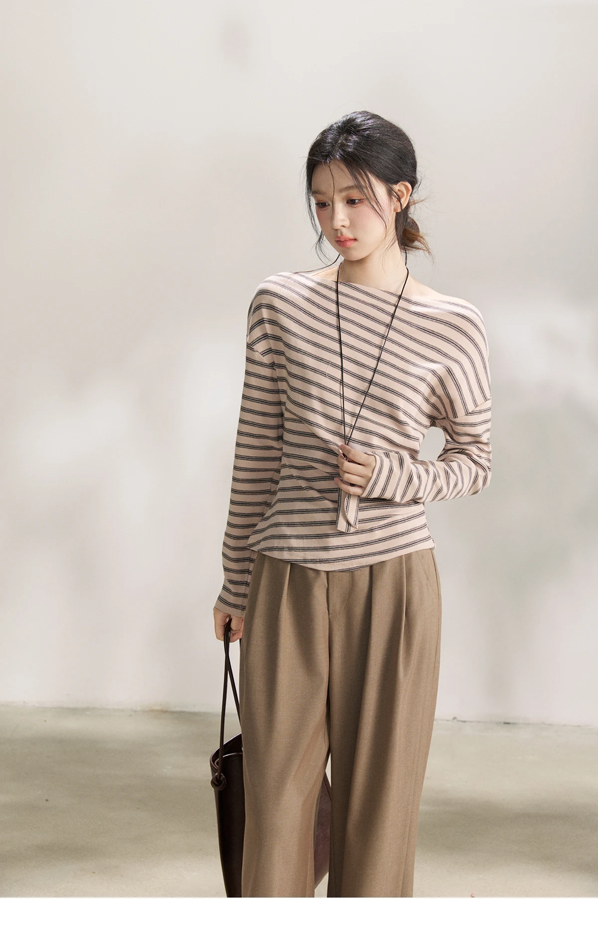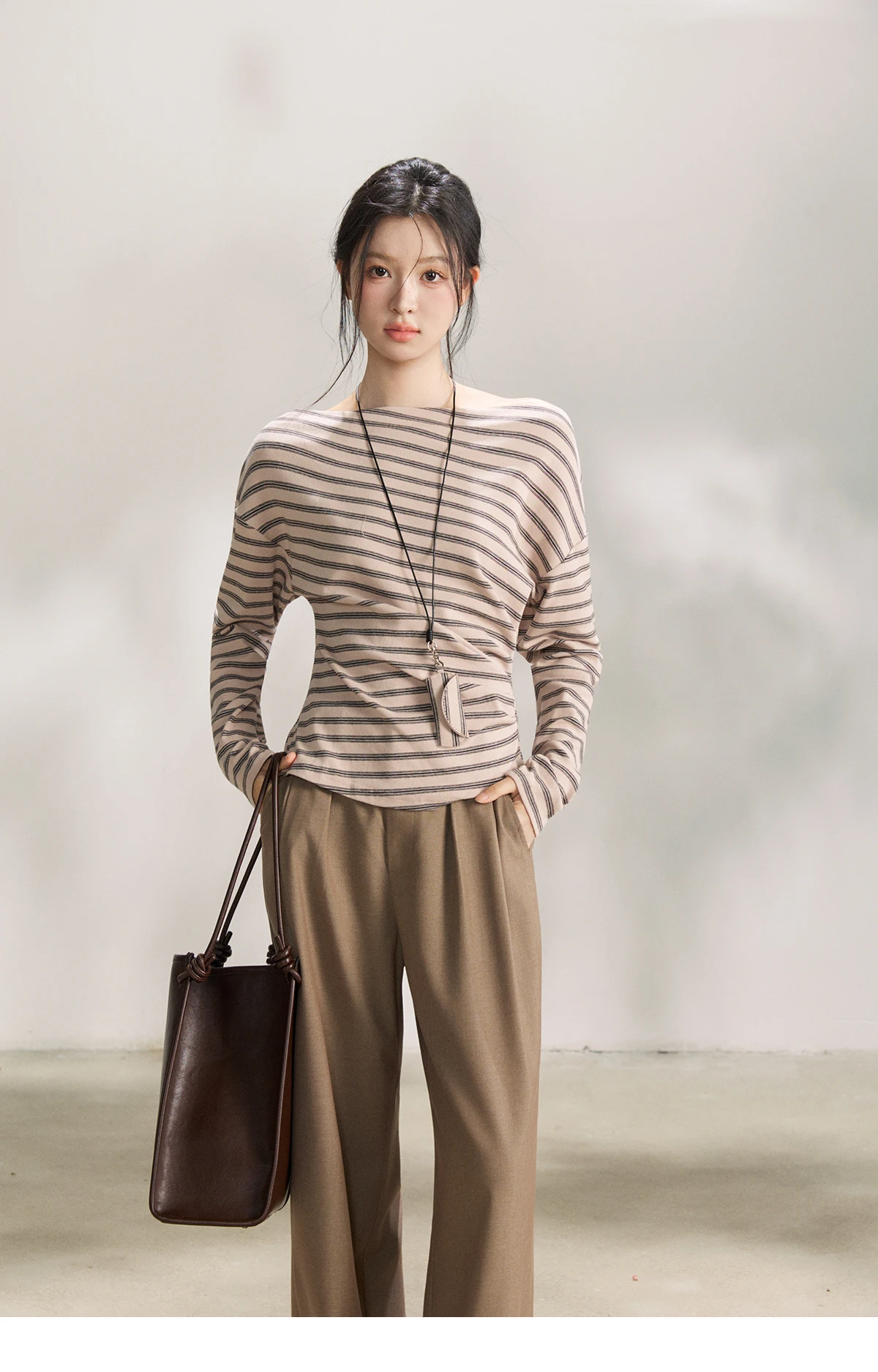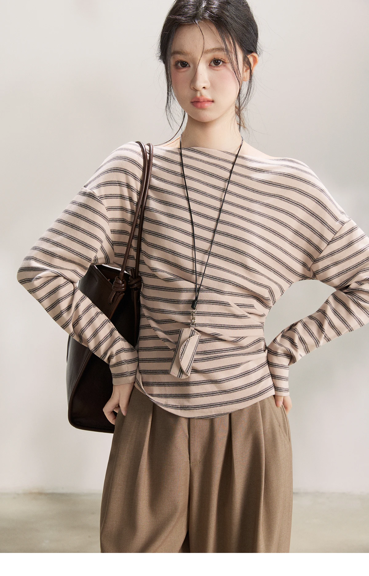 MISHOW Striped Boat Neck Long Sleeve Tops 2026 Spring Ruched Side SlimCasual Soft Breathable T-Shirt with Necklace MXF13T1514