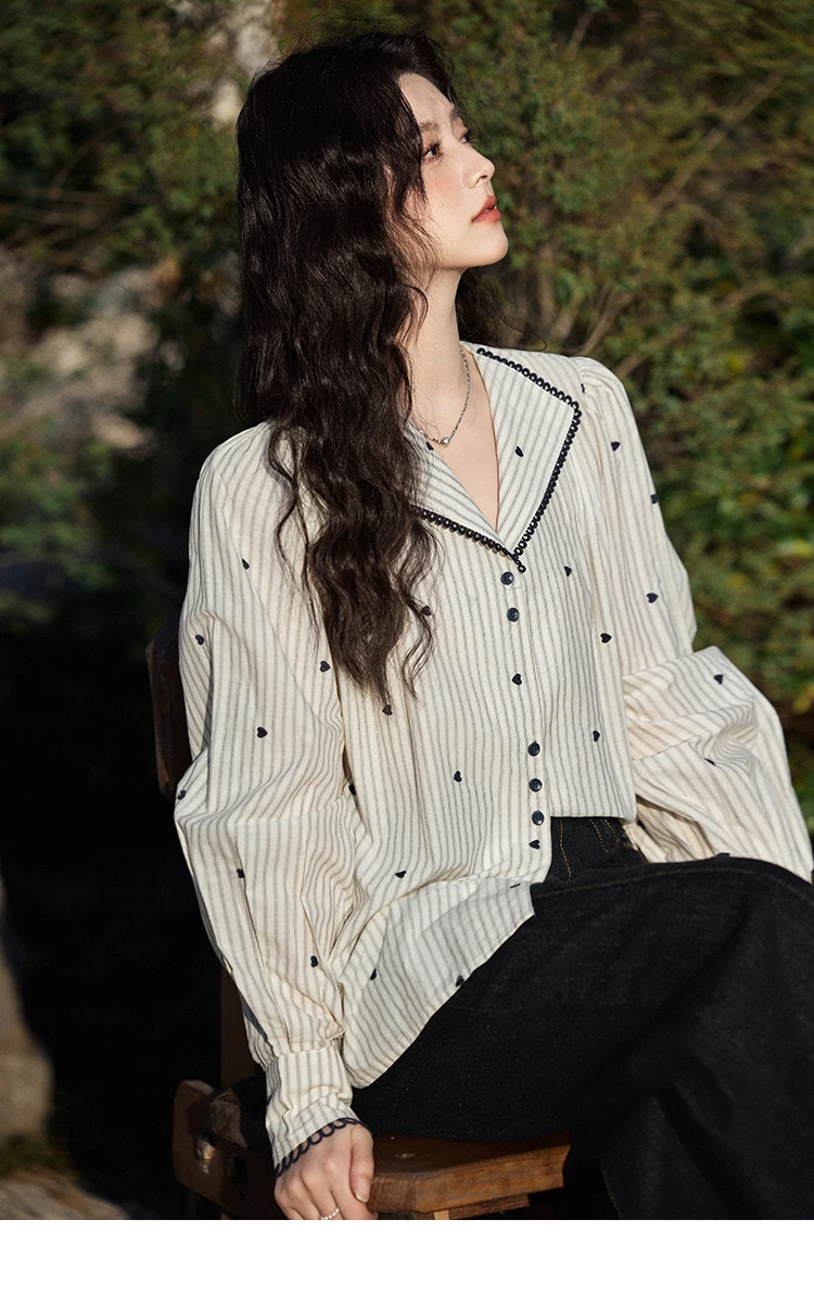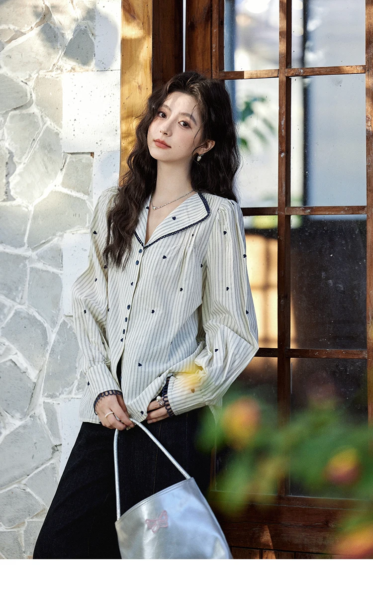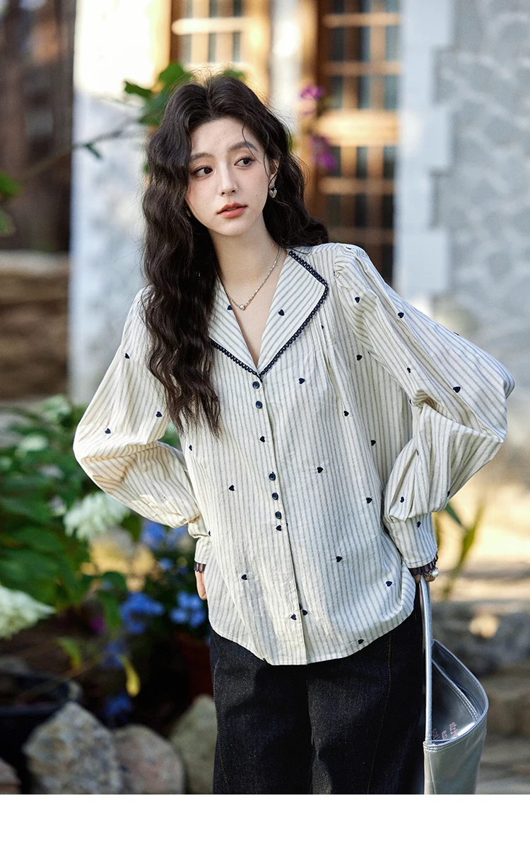 MISHOW Striped Bubble Sleeve Shirt for Women 2025 Spring French Retro Love Embroidered Top 100 Cotton V-neck Shirts MXE12C0390