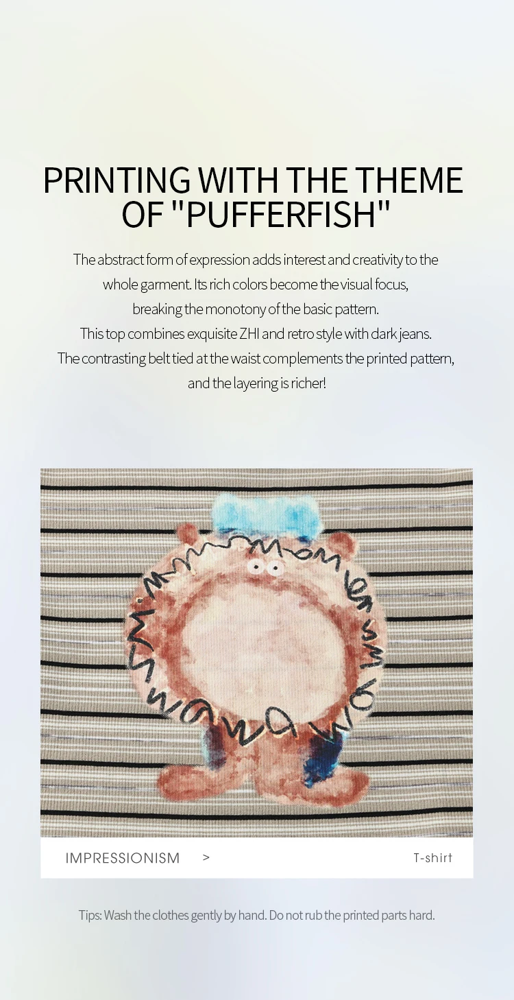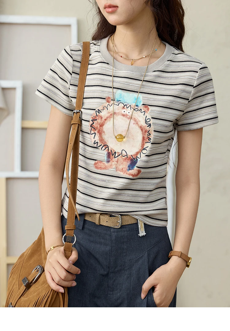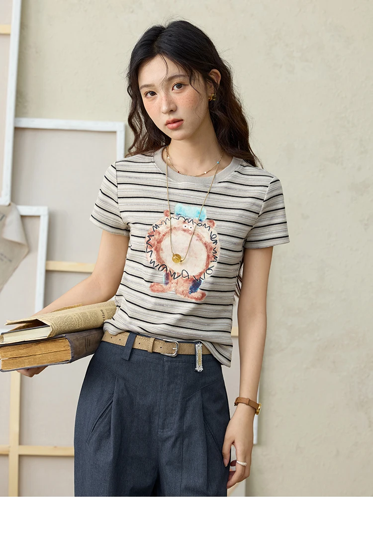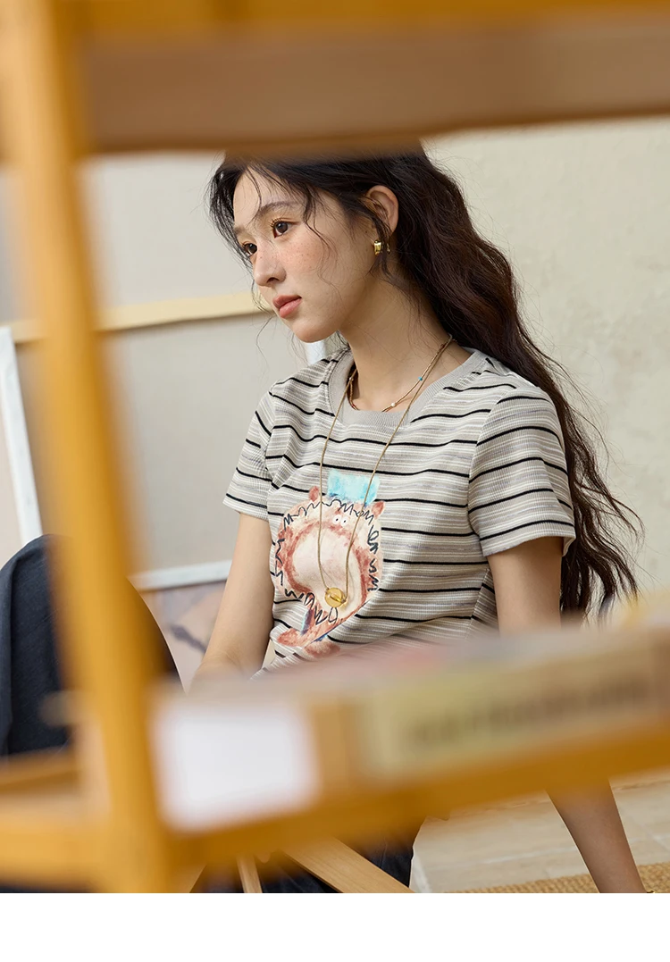 MISHOW Striped Cartoon Pufferfish Printed T-shirt for Women Summer 2025 Slim Shoulders Cotton Tees Short Sleeved Top MXE32T0538