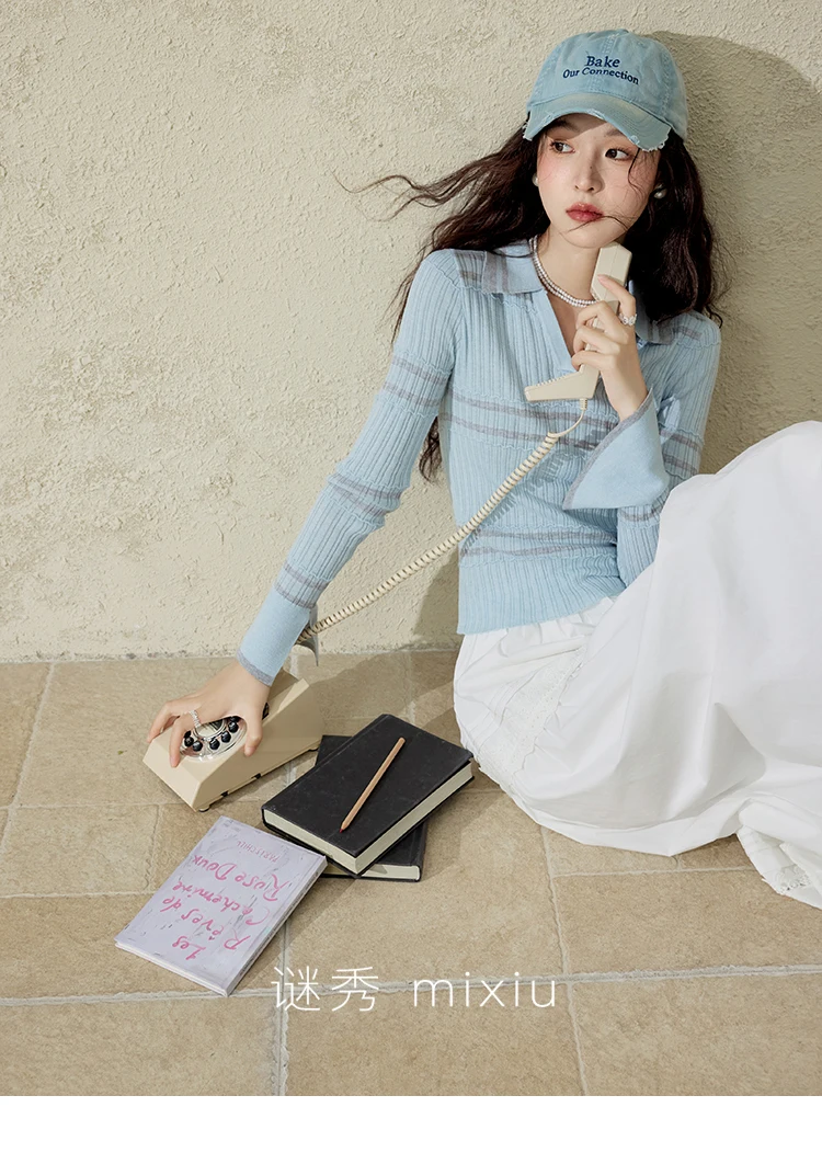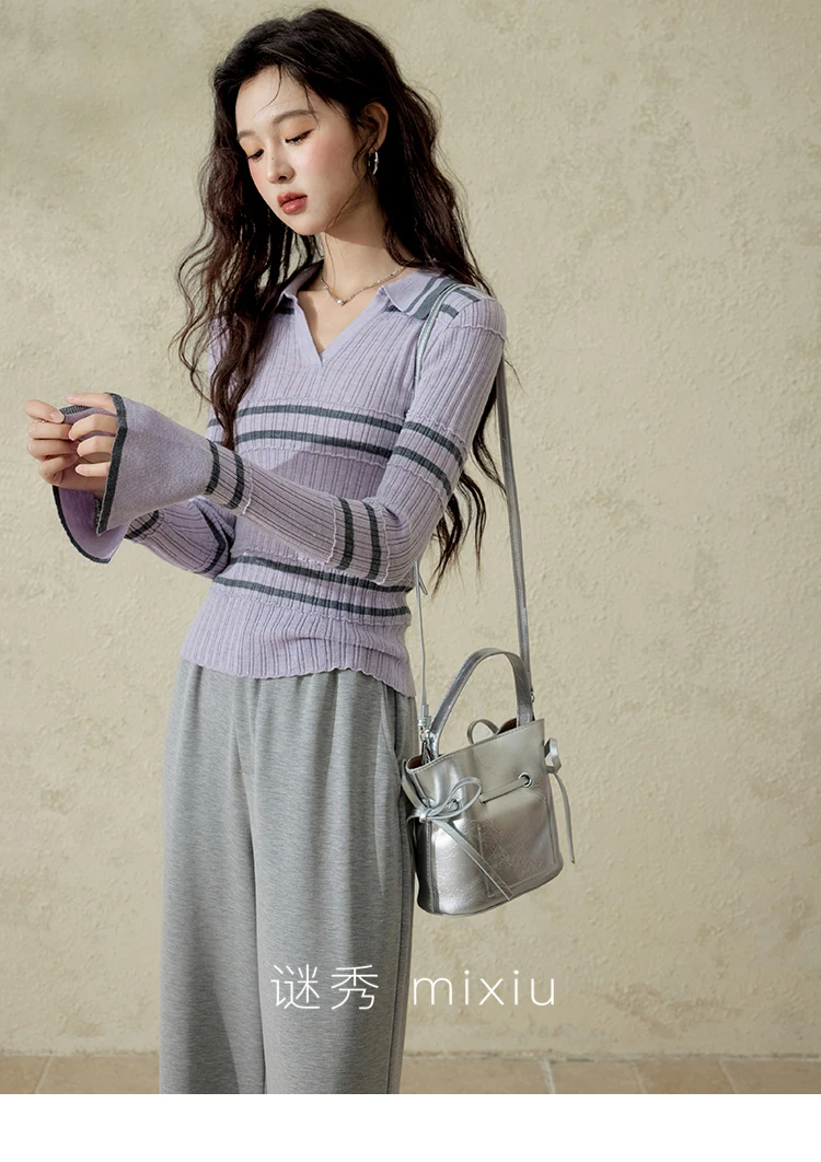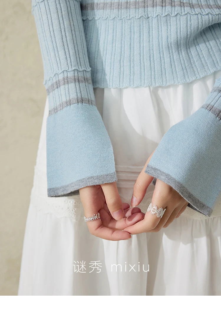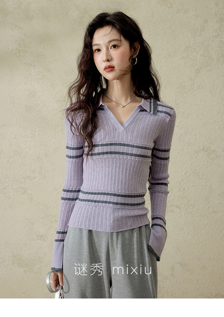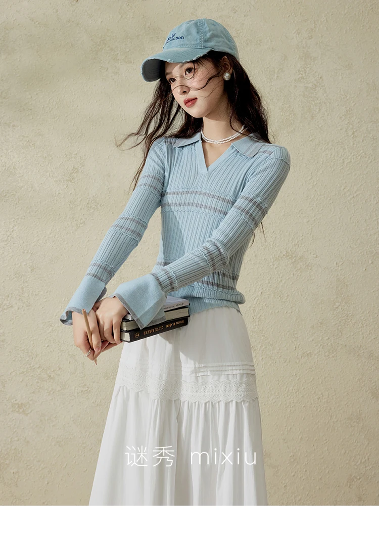 MISHOW Striped Knitted Tops for Women Spring 2025 Contrast Color Striped Slim V-neck Trumpet Sleeves Commuter Outfit MXE13Z1141