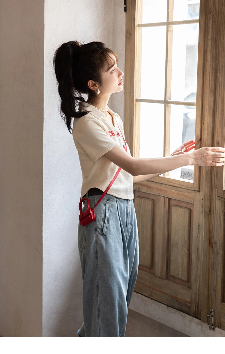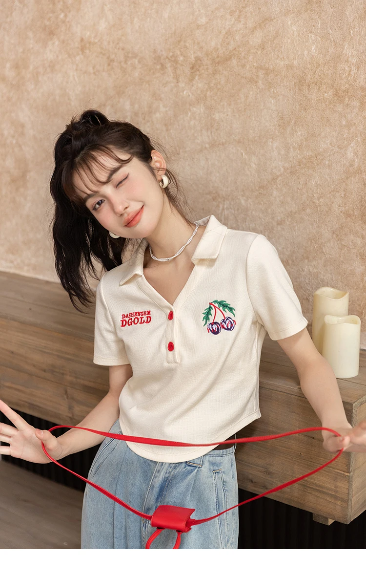 MISHOW Summer T-shirts for Women Korean Fashion Polo Collar Embroidery Letter Short Tops Harajuku Casual Solid Tees MXB32T0477
