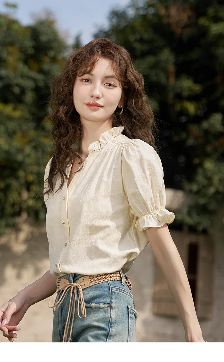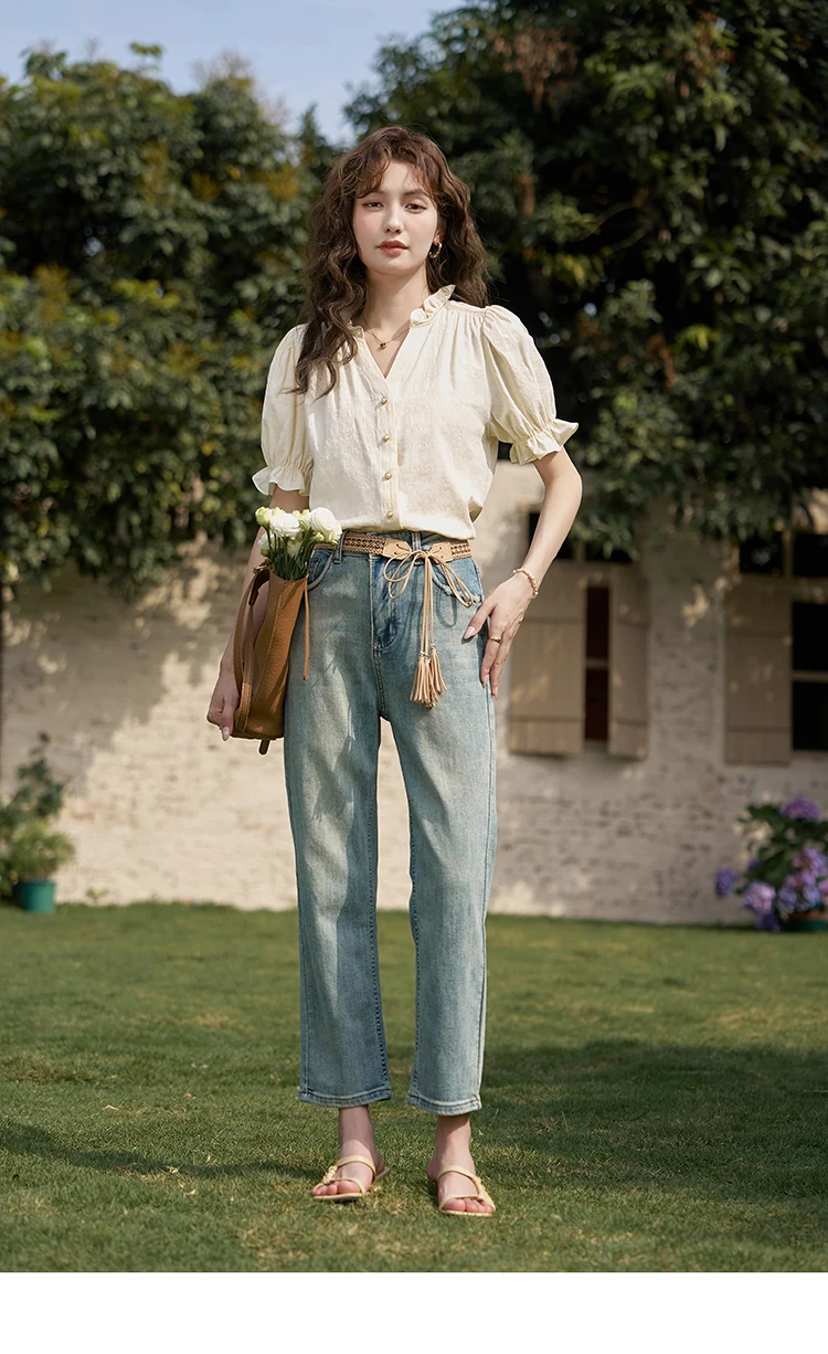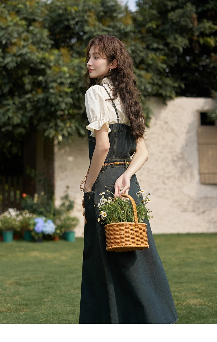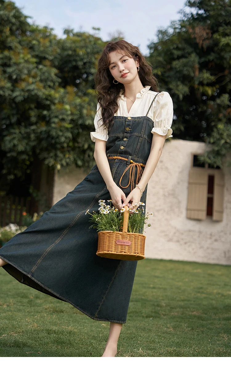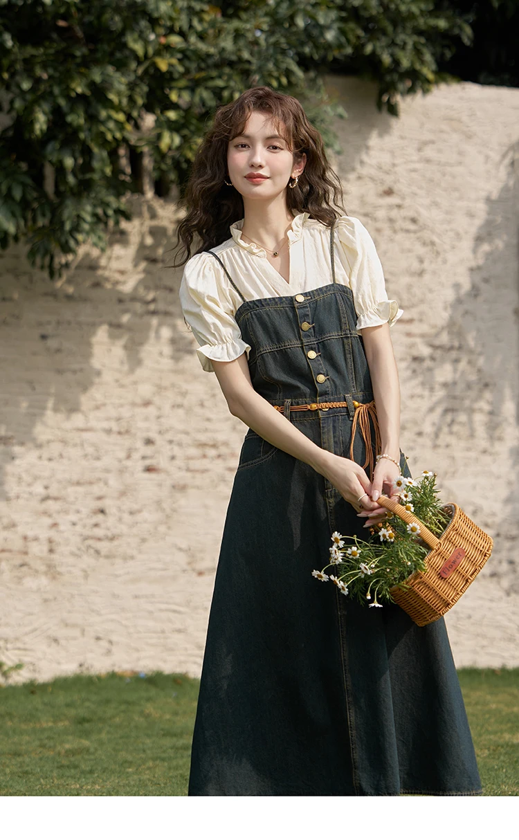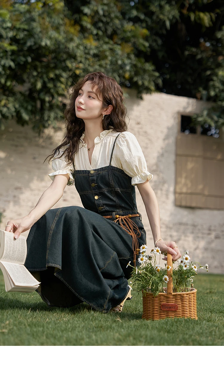 MISHOW Suspender Denim Dress Paired Blouse Separately 2024 Summer V Neck Puff Sleeve Top Back Elastic Waist Dress MXD21L1664