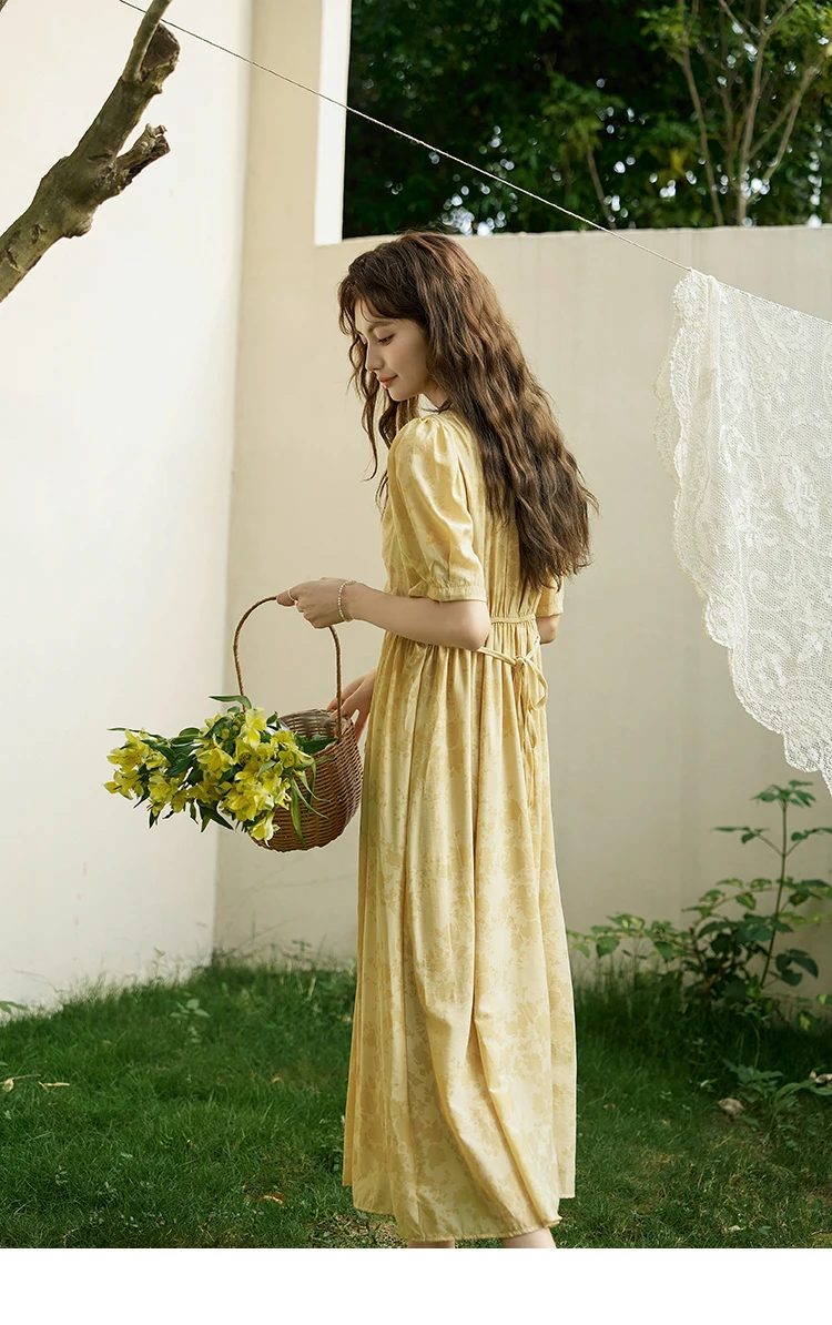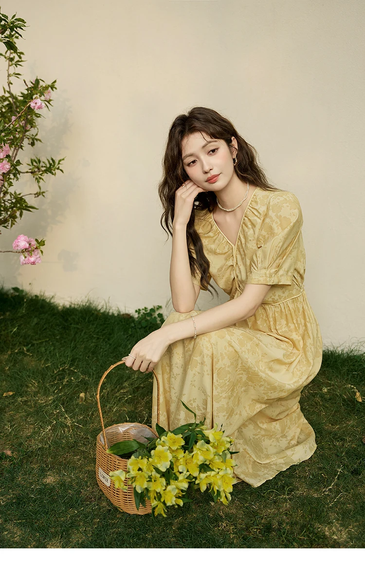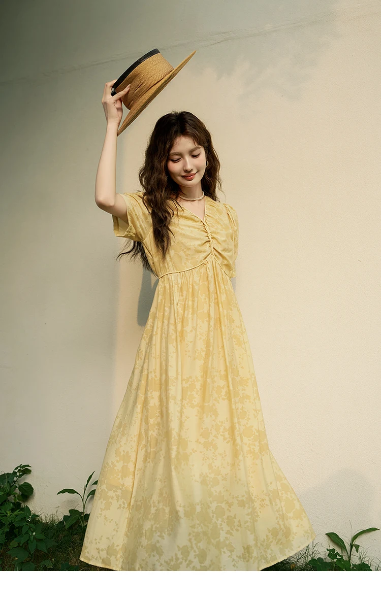 MISHOW Tea Break V-neck Dress for Women 2024 Summer French Temperament Chiffon Floral Puff Sleeve Waist Long Dresses MXD23L1878