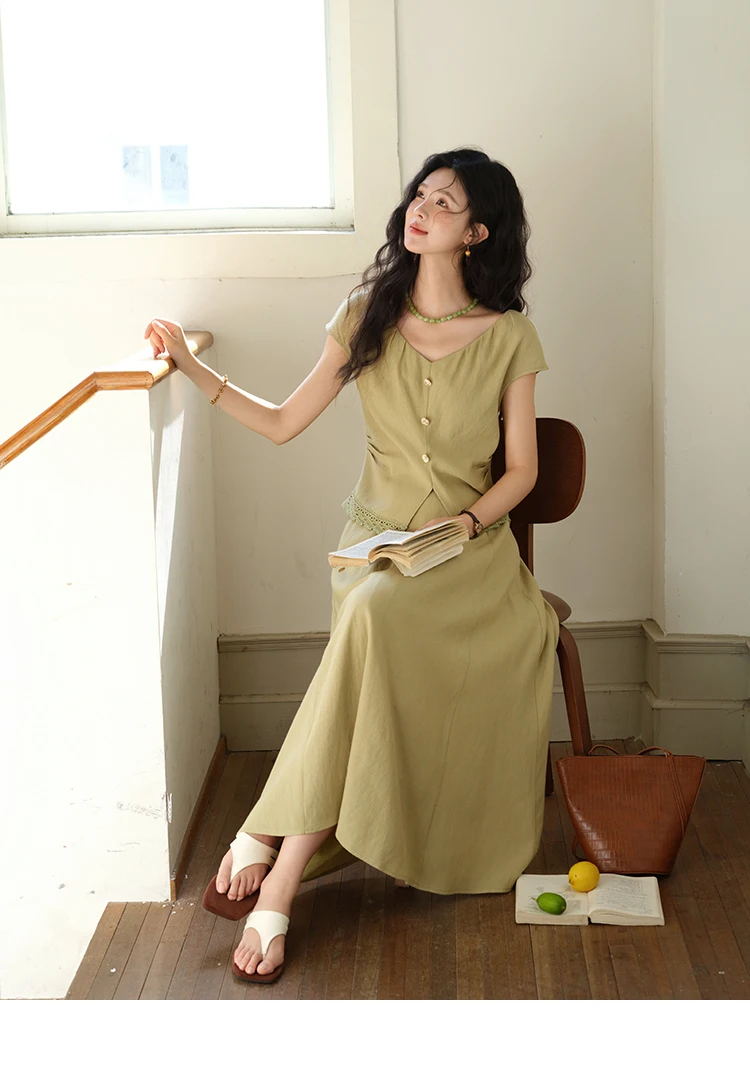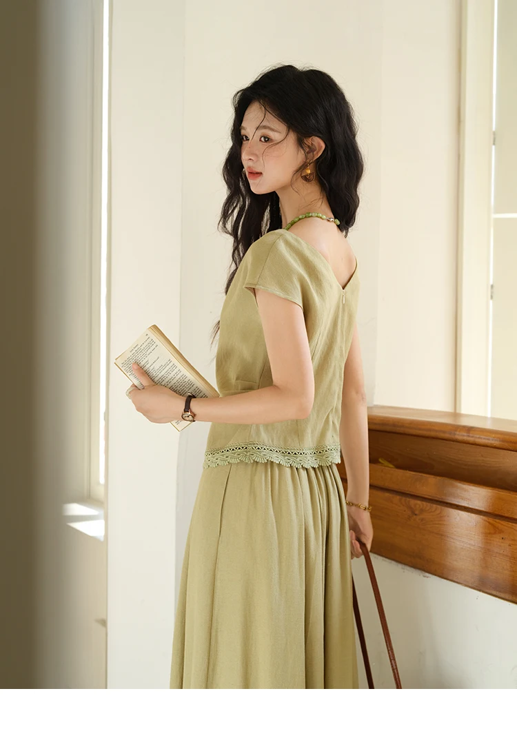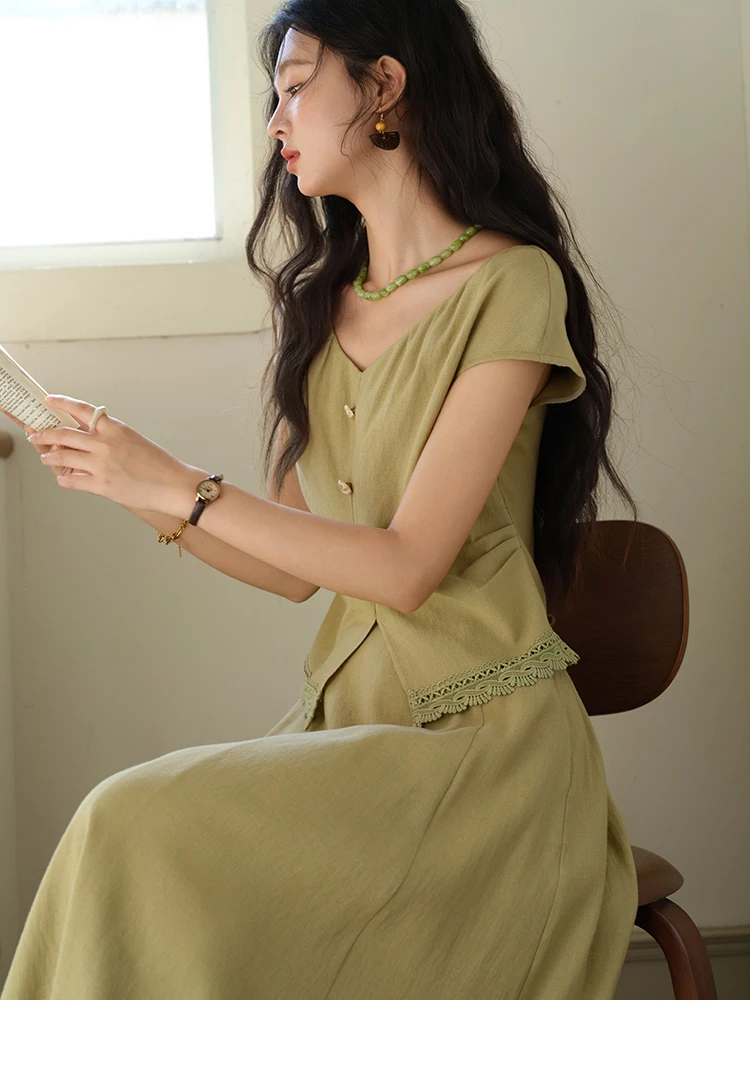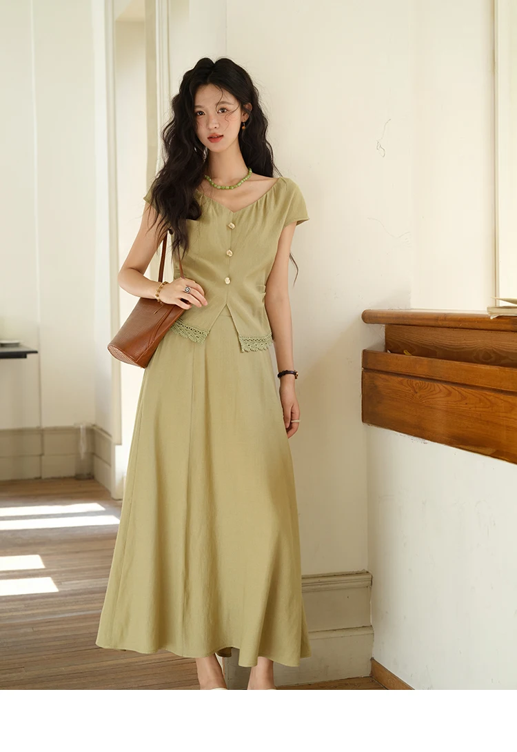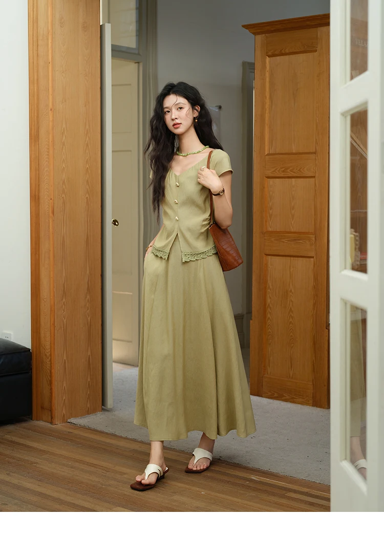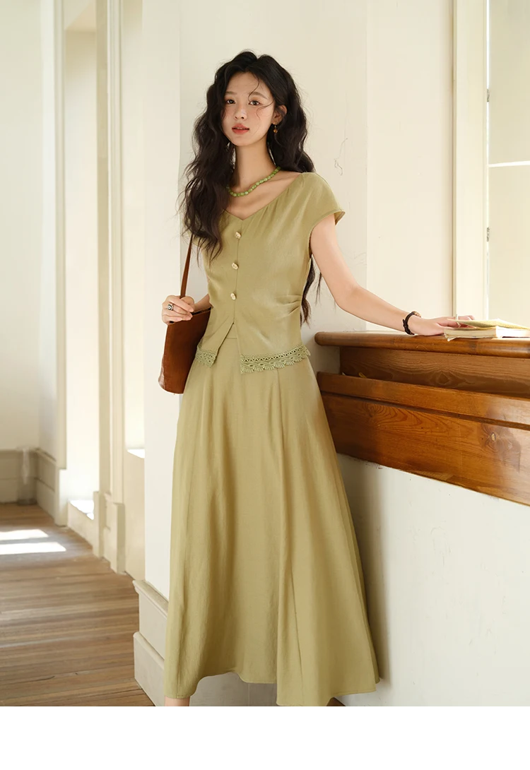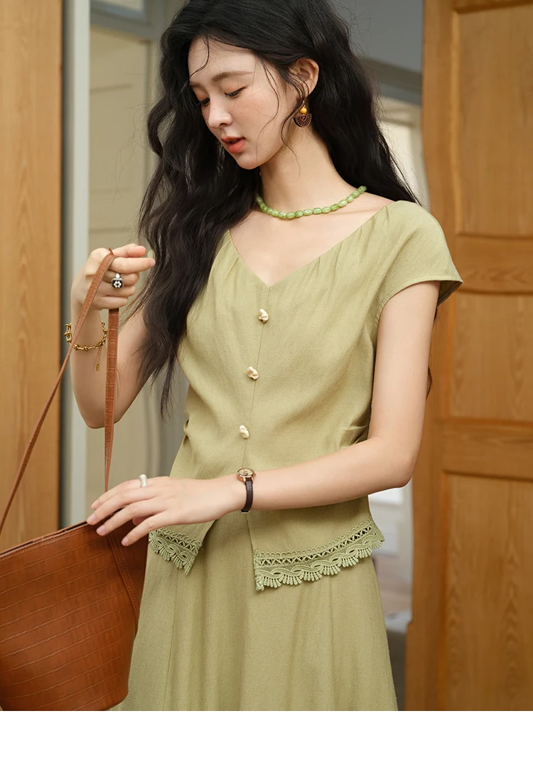 MISHOW Two-Piece Ladies Set 2025 Summer New Fashion V-neck Button Lace Hollow Out Spliced Top Pocket A-line Skirt Set MXE39T0665