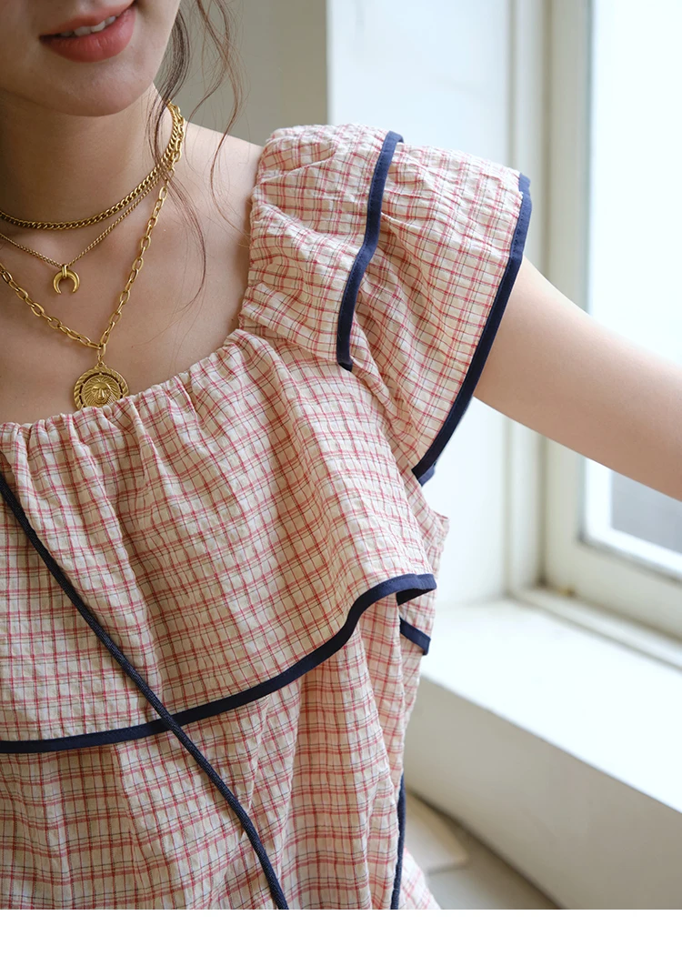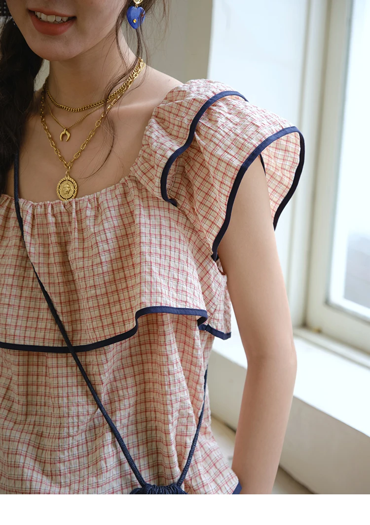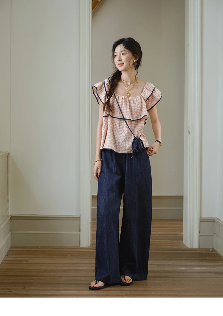 MISHOW Two-Piece Ladies Set Square Neck Ruffles Plaid Blouse High Waist Slim Wide Leg Casual Pants Set 2025 Summer MXE36T0636