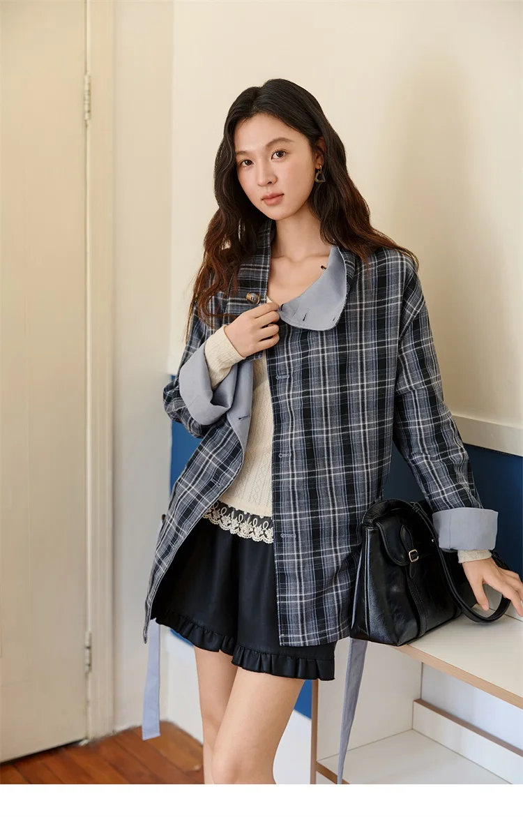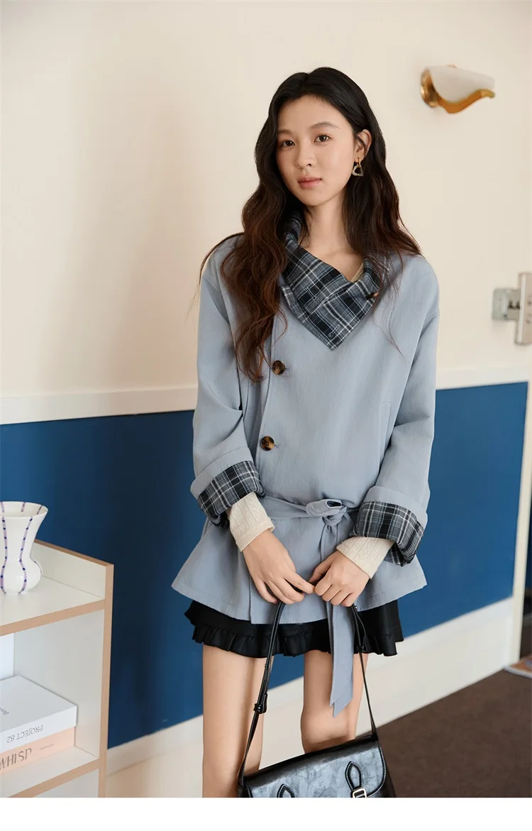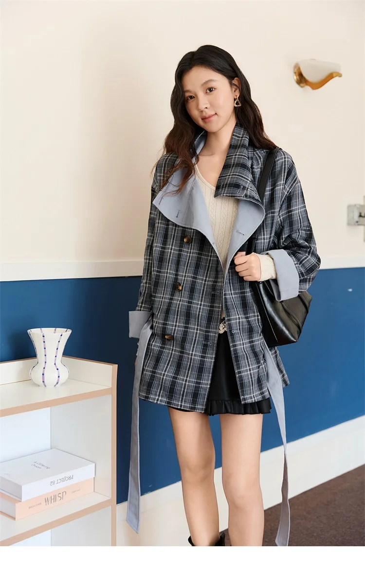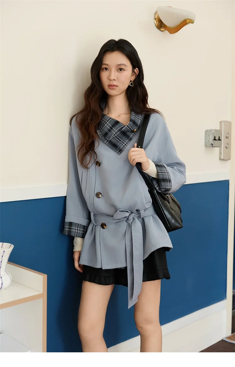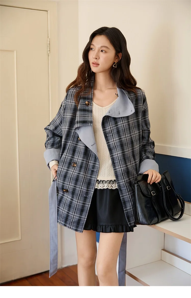 MISHOW Two Sided Outerwear Trench for Women Autumn Winter 2025 Blue Plaid Patchwork Diagonal Placket Belt Trench MXE48W0871