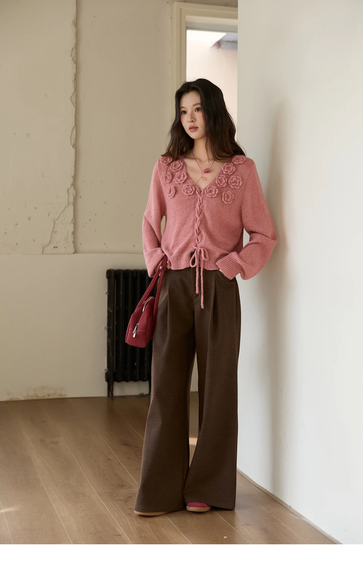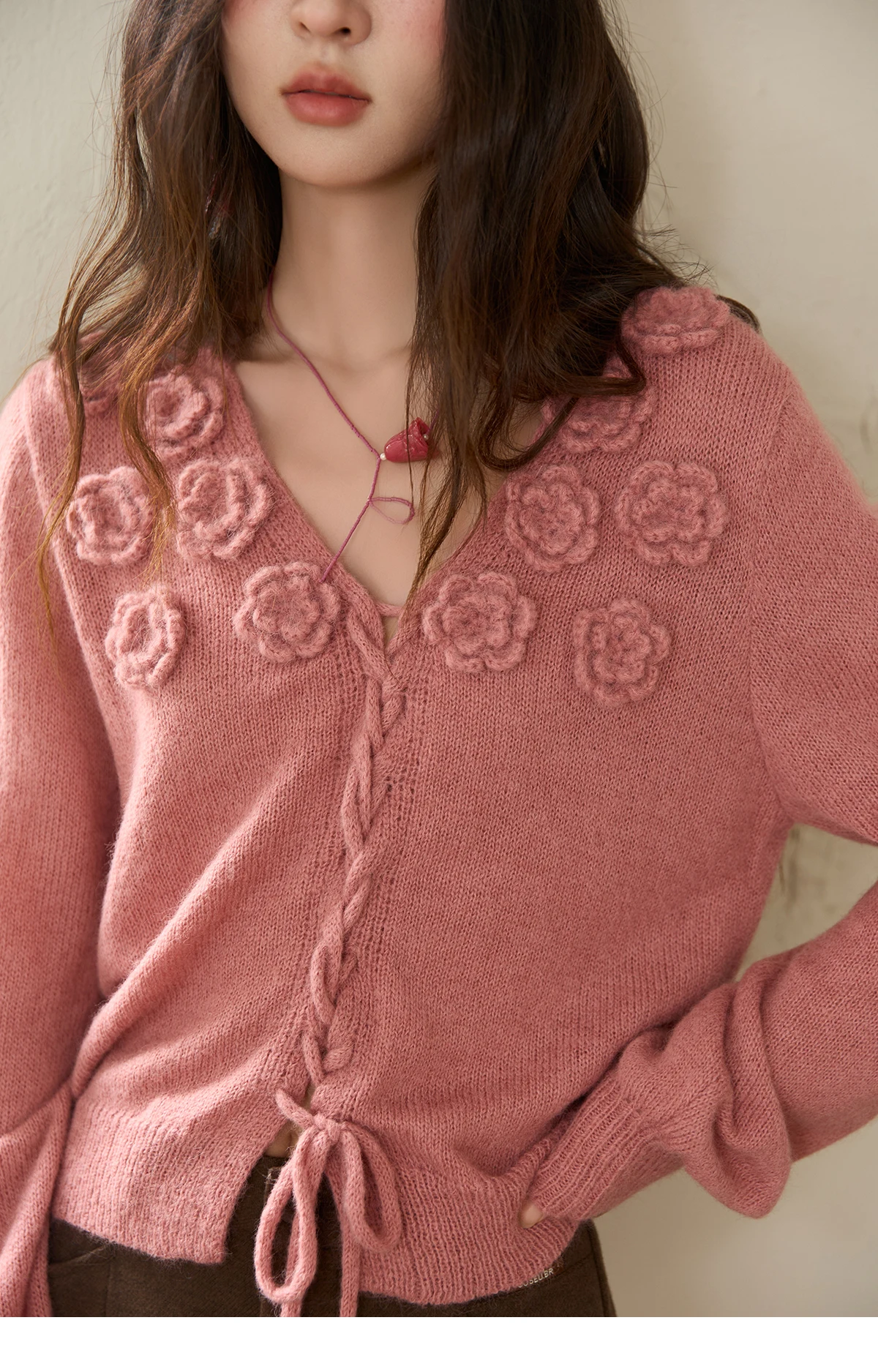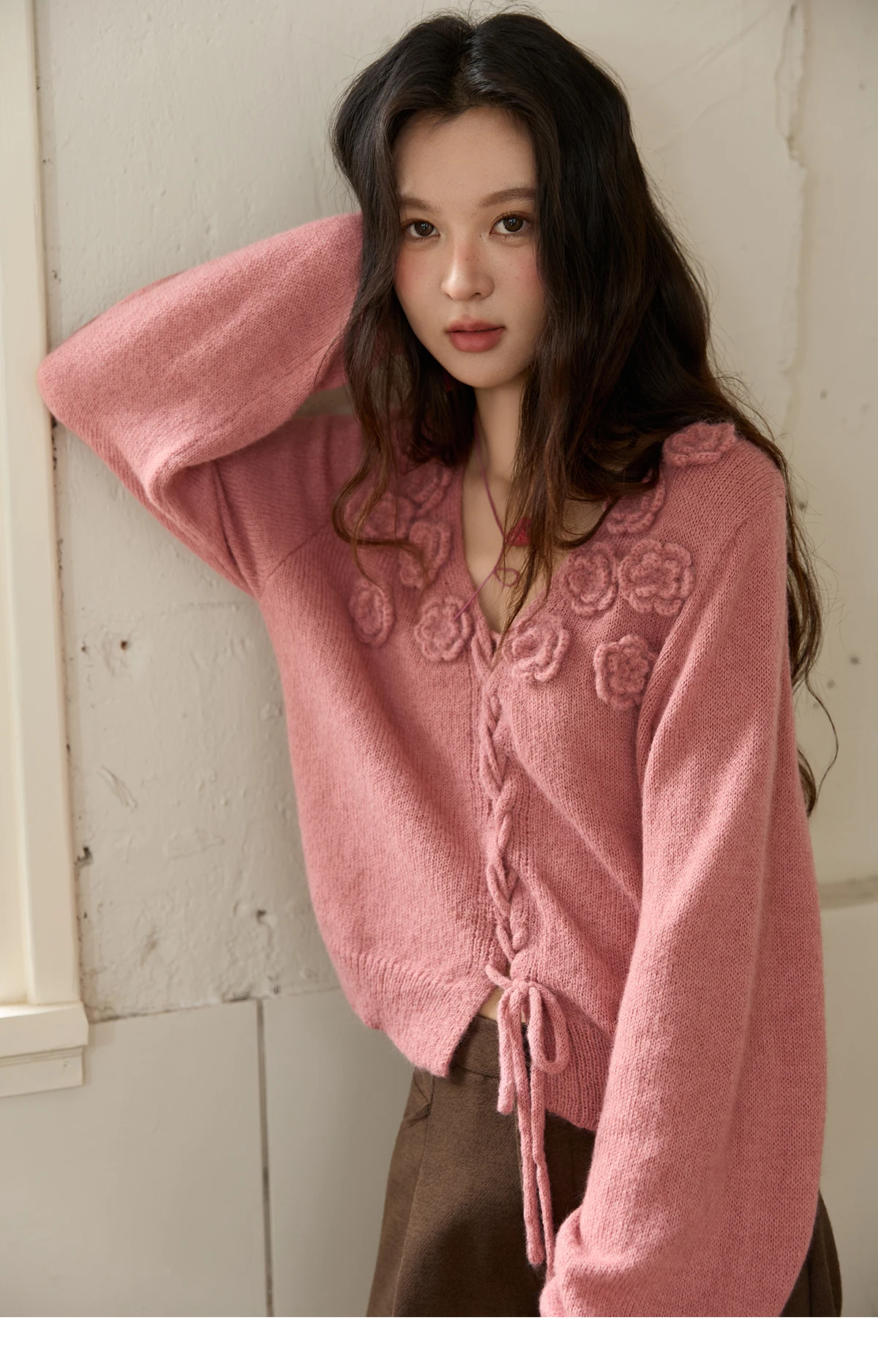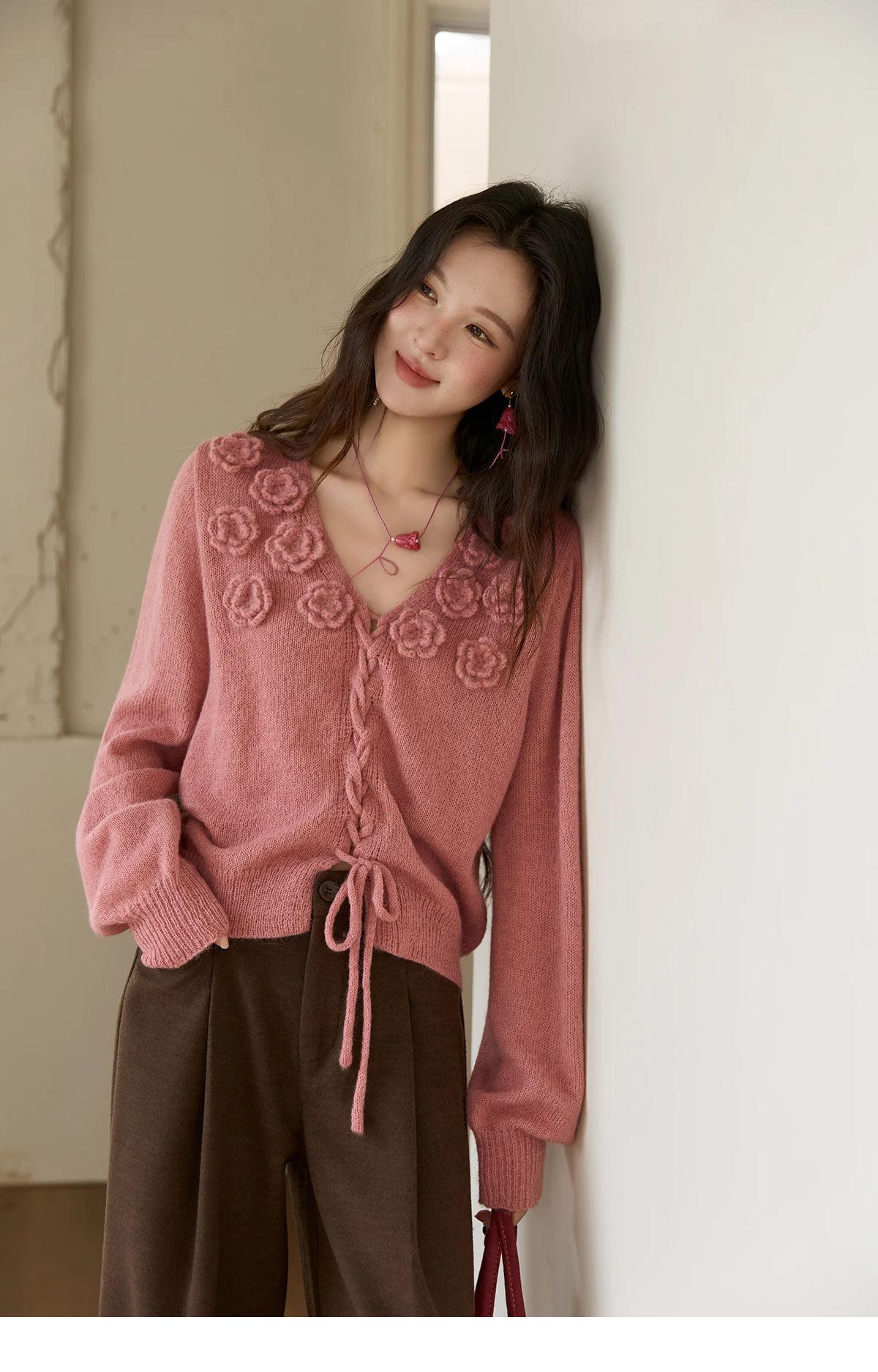 MISHOW V-Neck Sweater 2025 Autumn Winter French Loose Pink Three-Dimensional Rose Knitted Pullovers Long-sleeved Tops MXE88Z2708