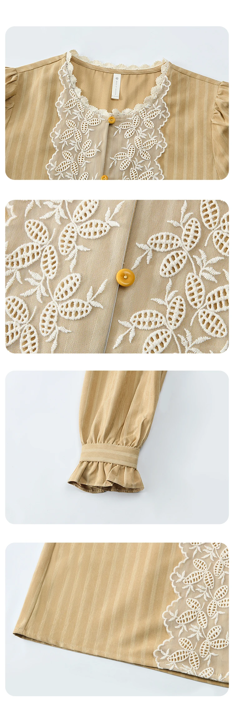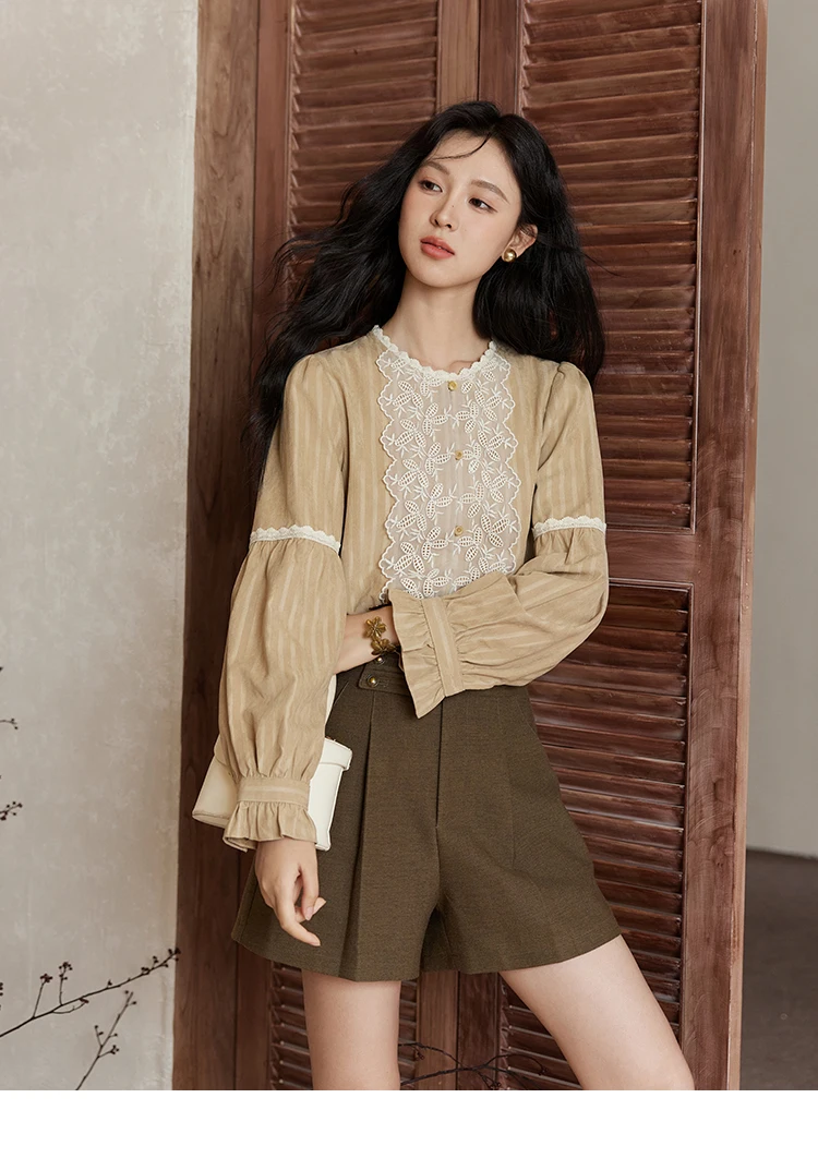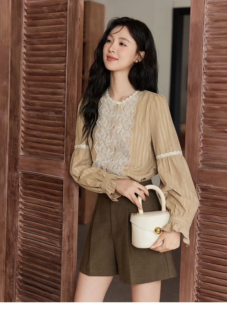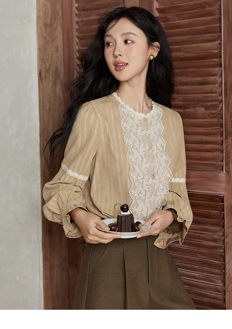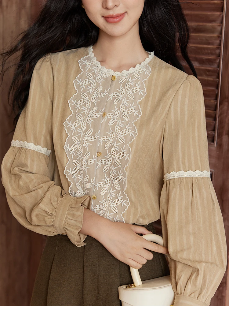 MISHOW Vintage Mesh Embroidery Blouse Women Lace Striped Lace Collar Long Sleeve Top French Lantern Sleeve Outwear MXD47X1664