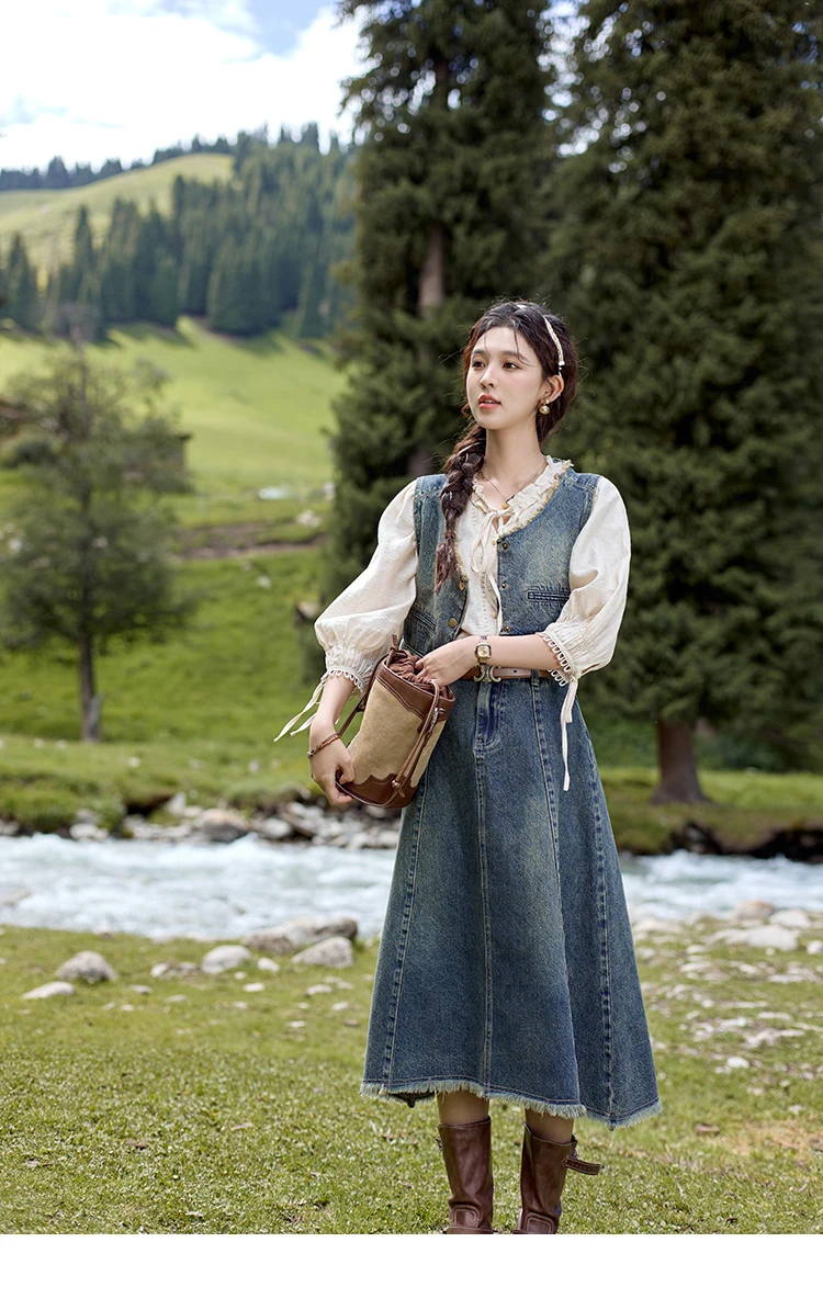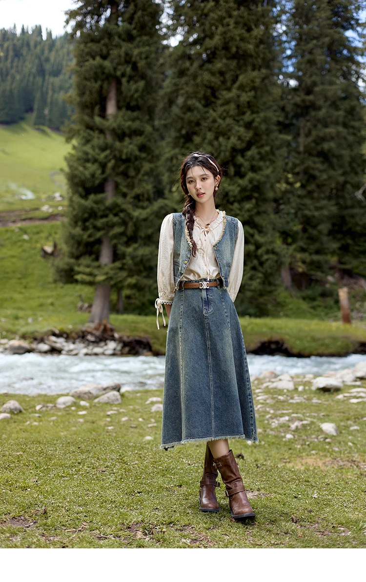 MISHOW Washed Hem Fringed Denim Midi Skirt 2024 Autumn Commuting Versatile A-line Long Skirt Retro Blue Casual Skirts MXD41B0453