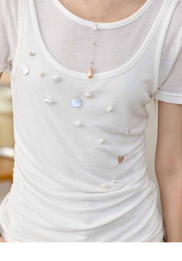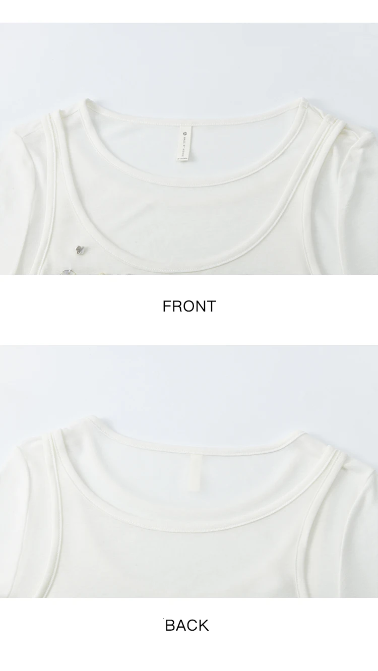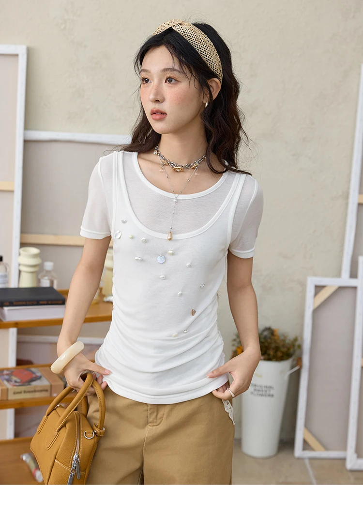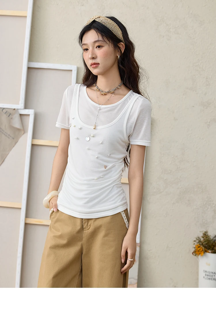 MISHOW White Fake Two Piece Bead Embroidered T-shirt for Women 2025 100 Cotton Tees Round Neck Knitted Breathable Top MXE35T0566