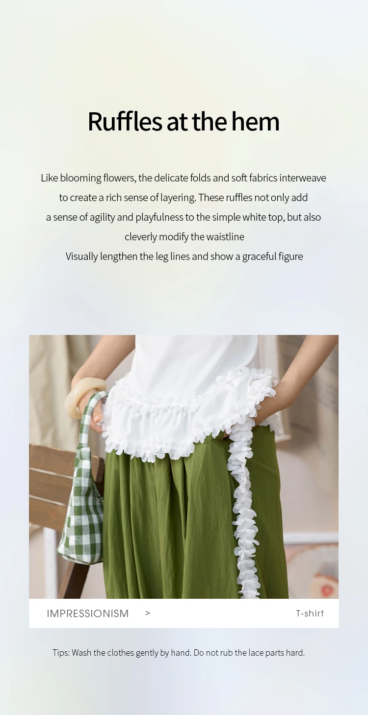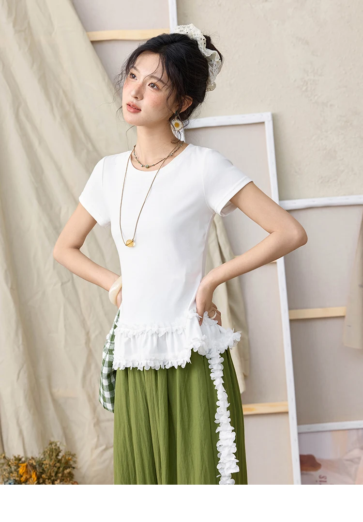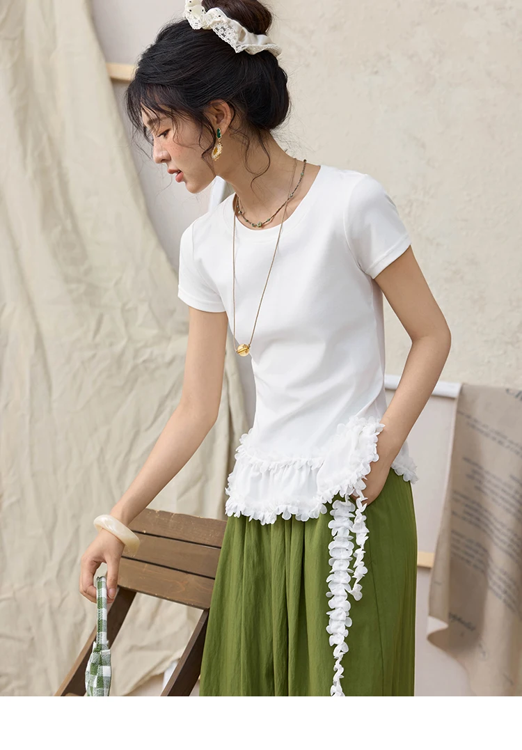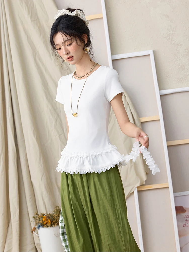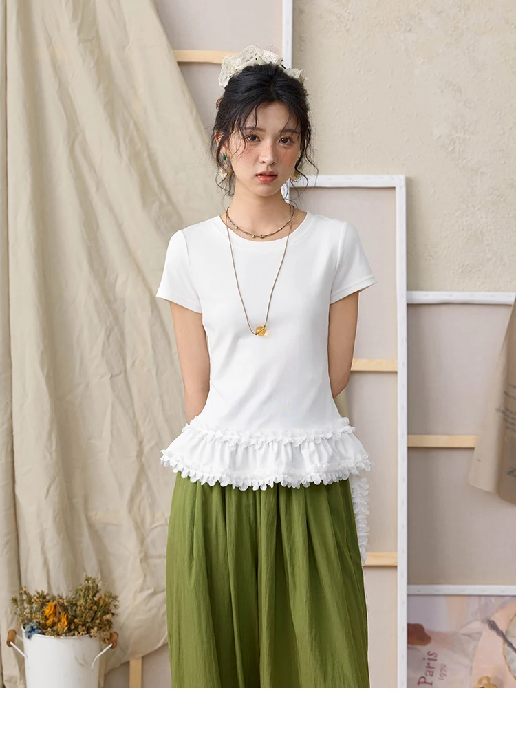 MISHOW White Ruffled T-shirt for Women Summer 2025 Round Neck Loose Slim Cotton Casual Tees with Red Lanyard Necklace MXE34T0557