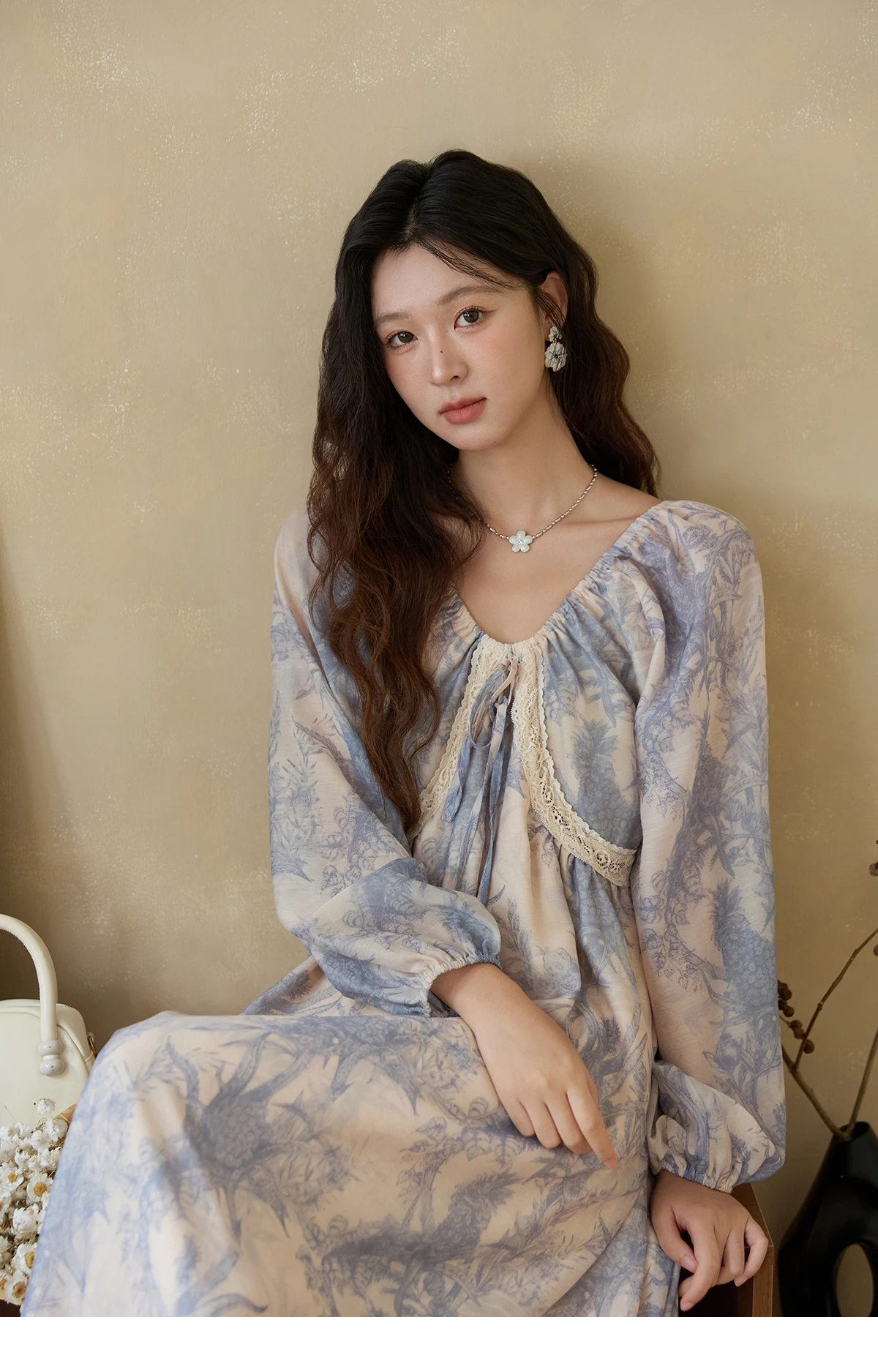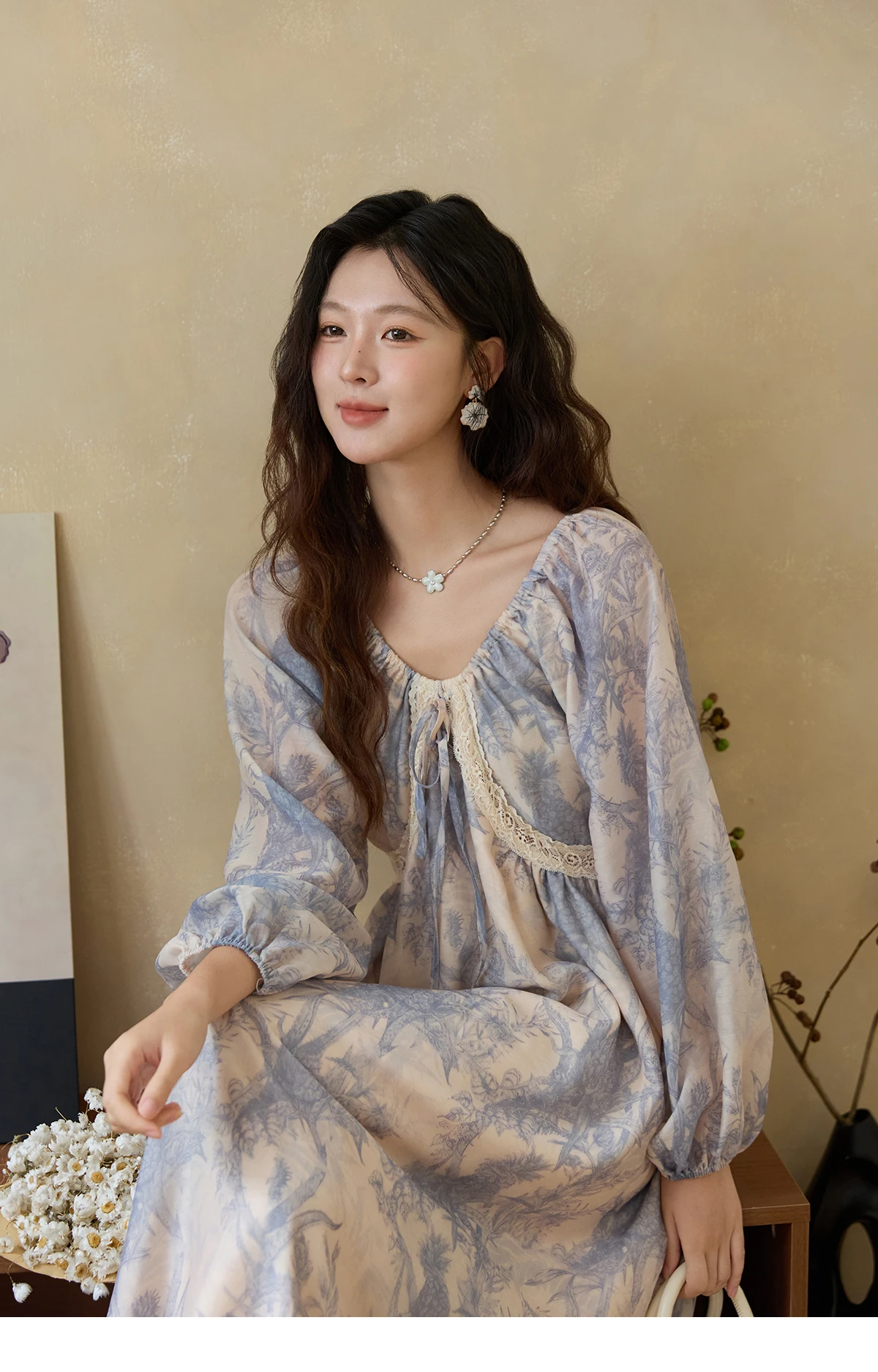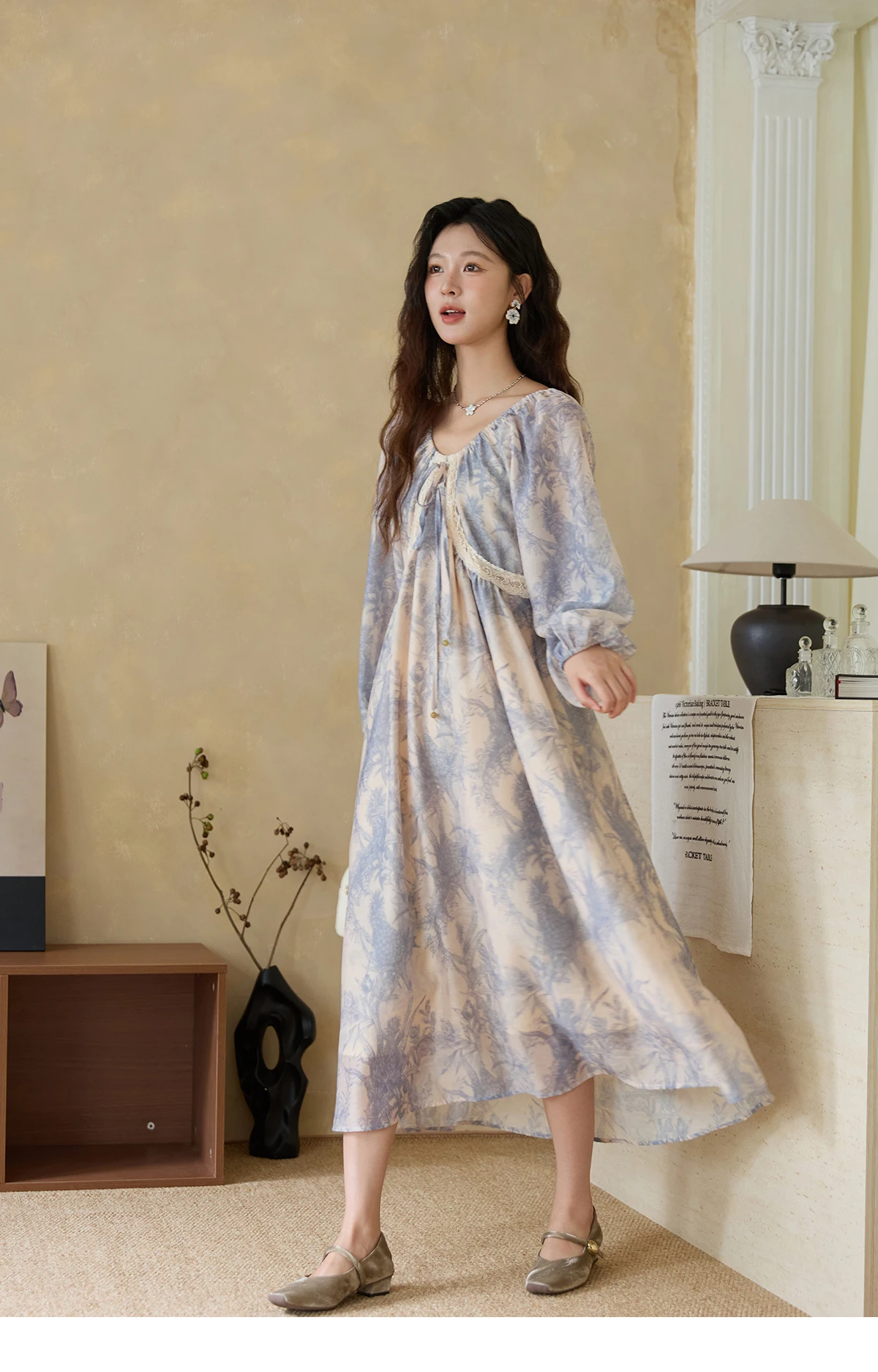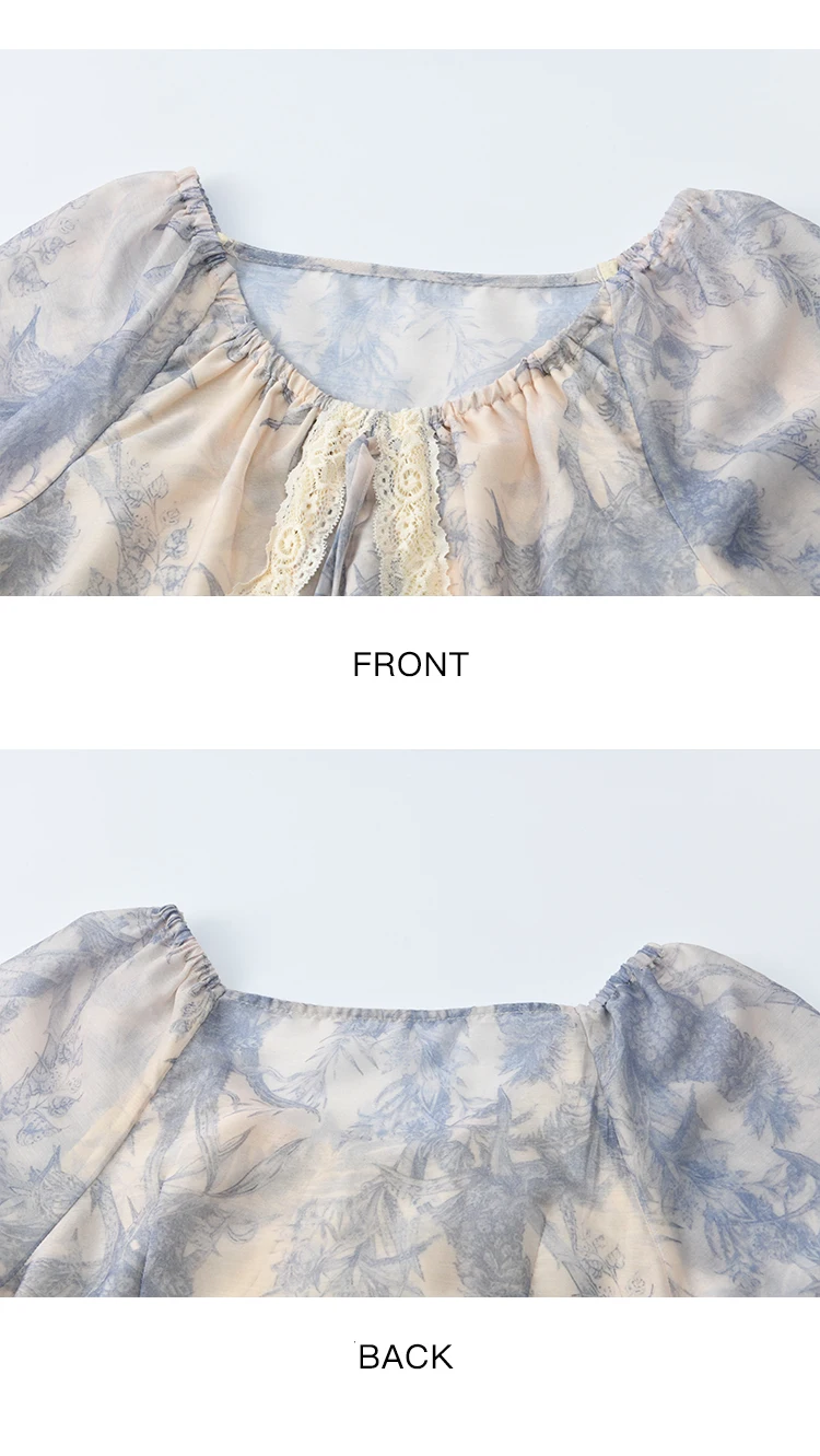 MISHOW Woman Elegant Dress 2025 Autumn Romantic Blue Floral Dress Lace Panel Drawstring A-line Long Dress Autumn MXE45L2507