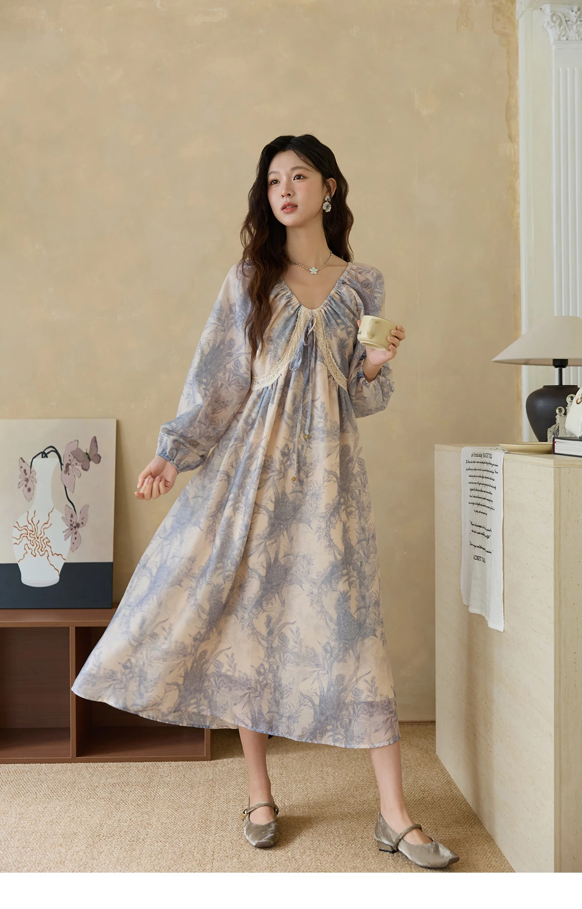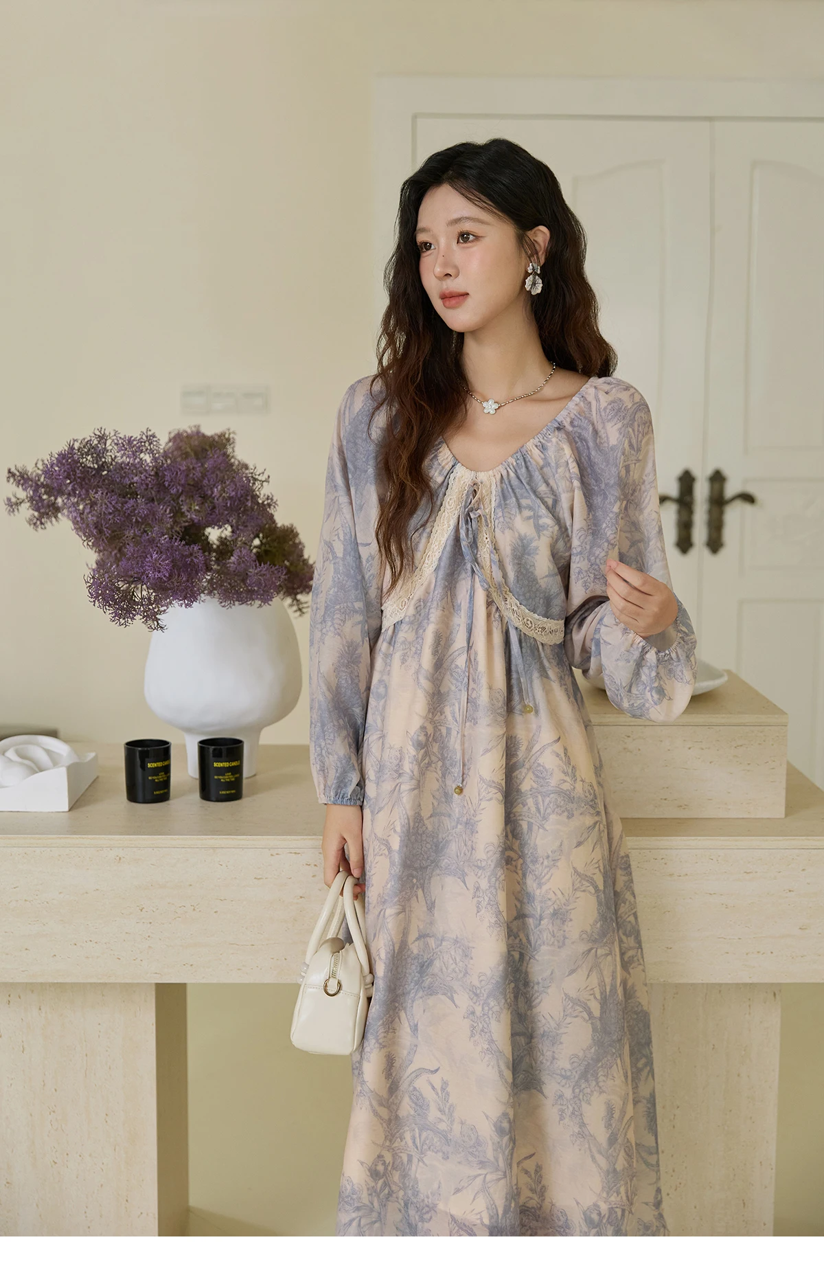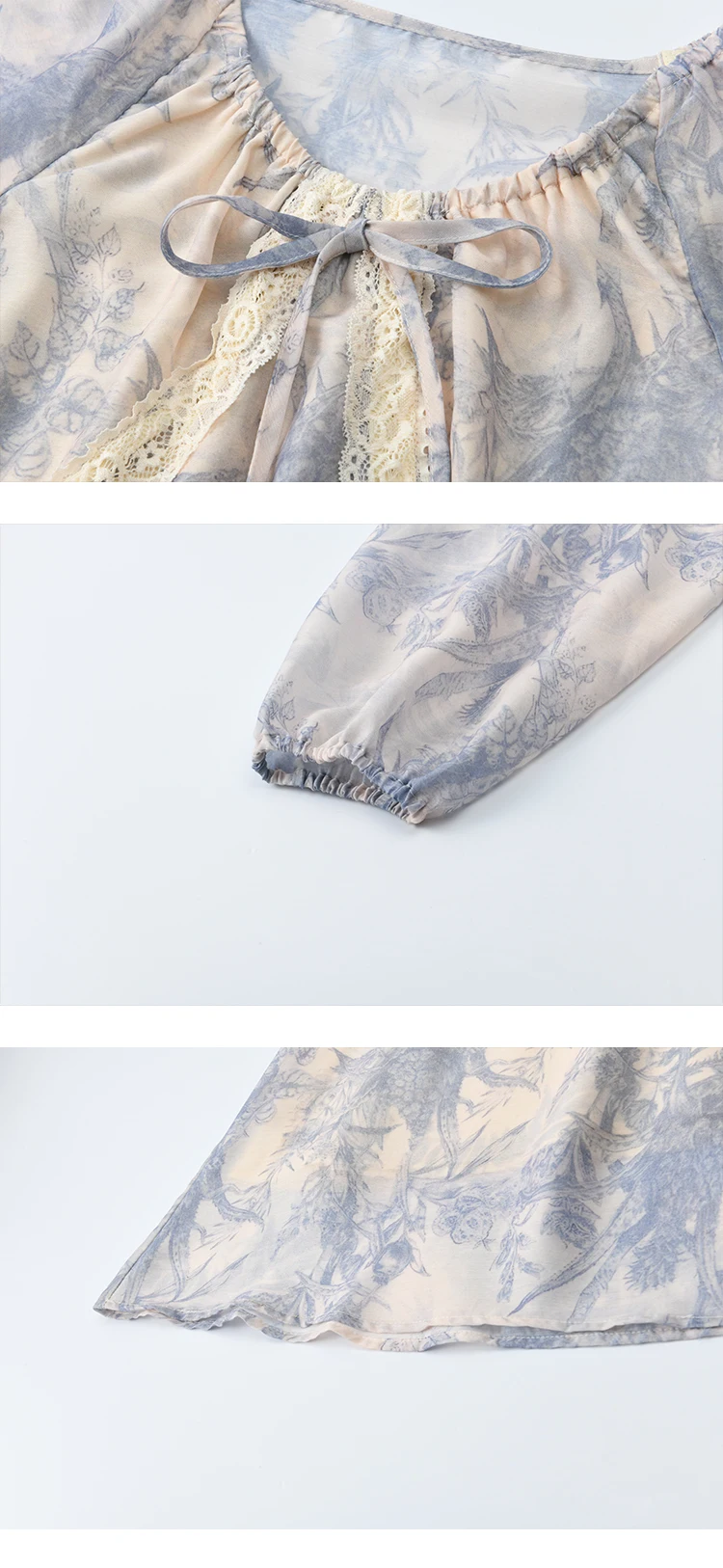 MISHOW Woman Elegant Dress 2025 Autumn Romantic Blue Floral Dress Lace Panel Drawstring A-line Long Dress Autumn MXE45L2507
