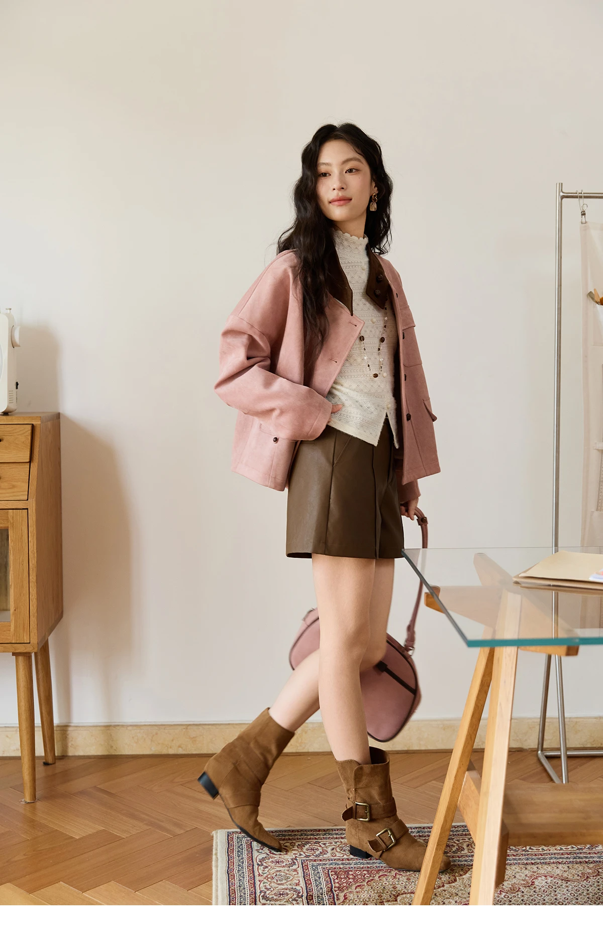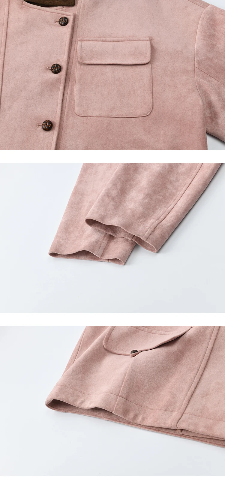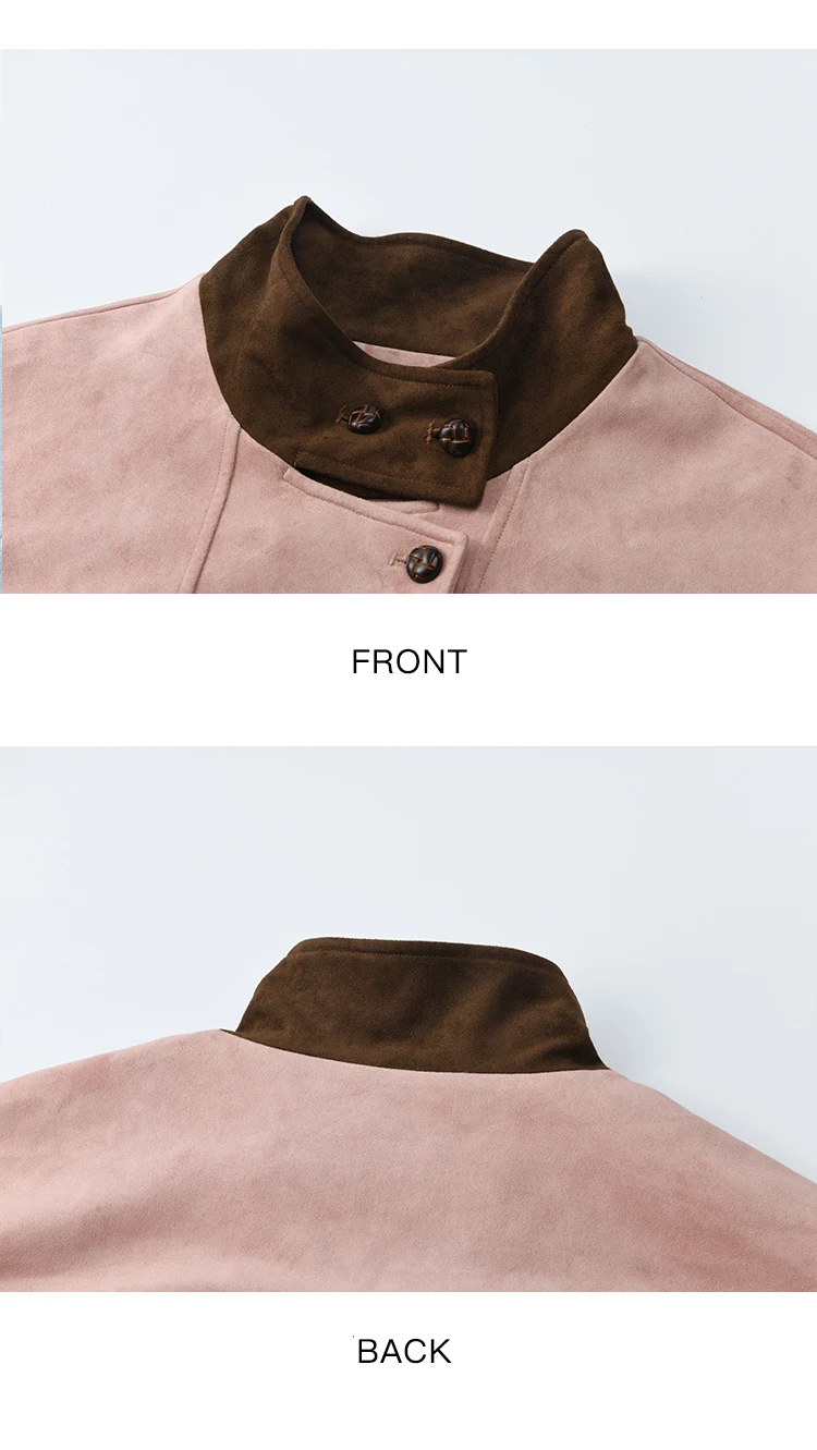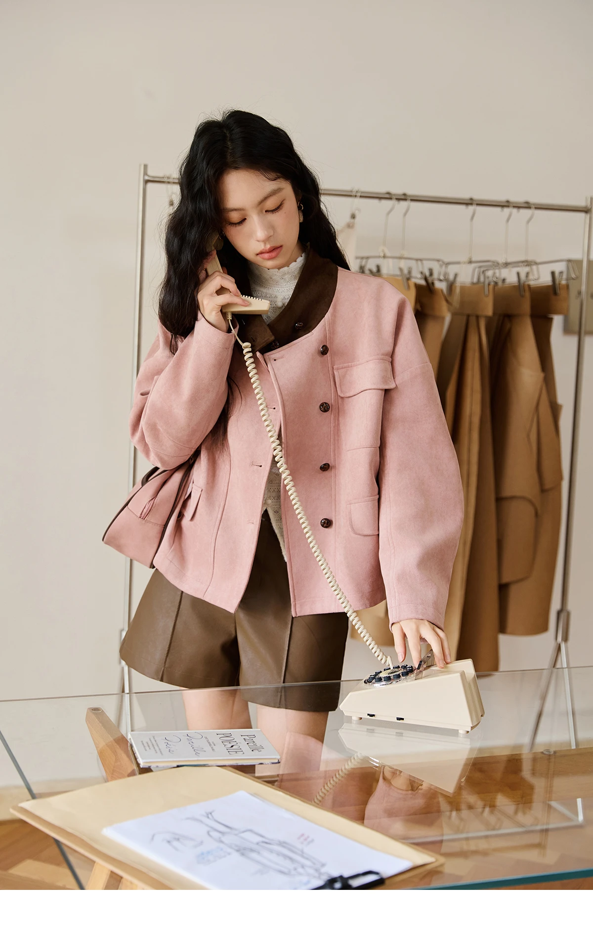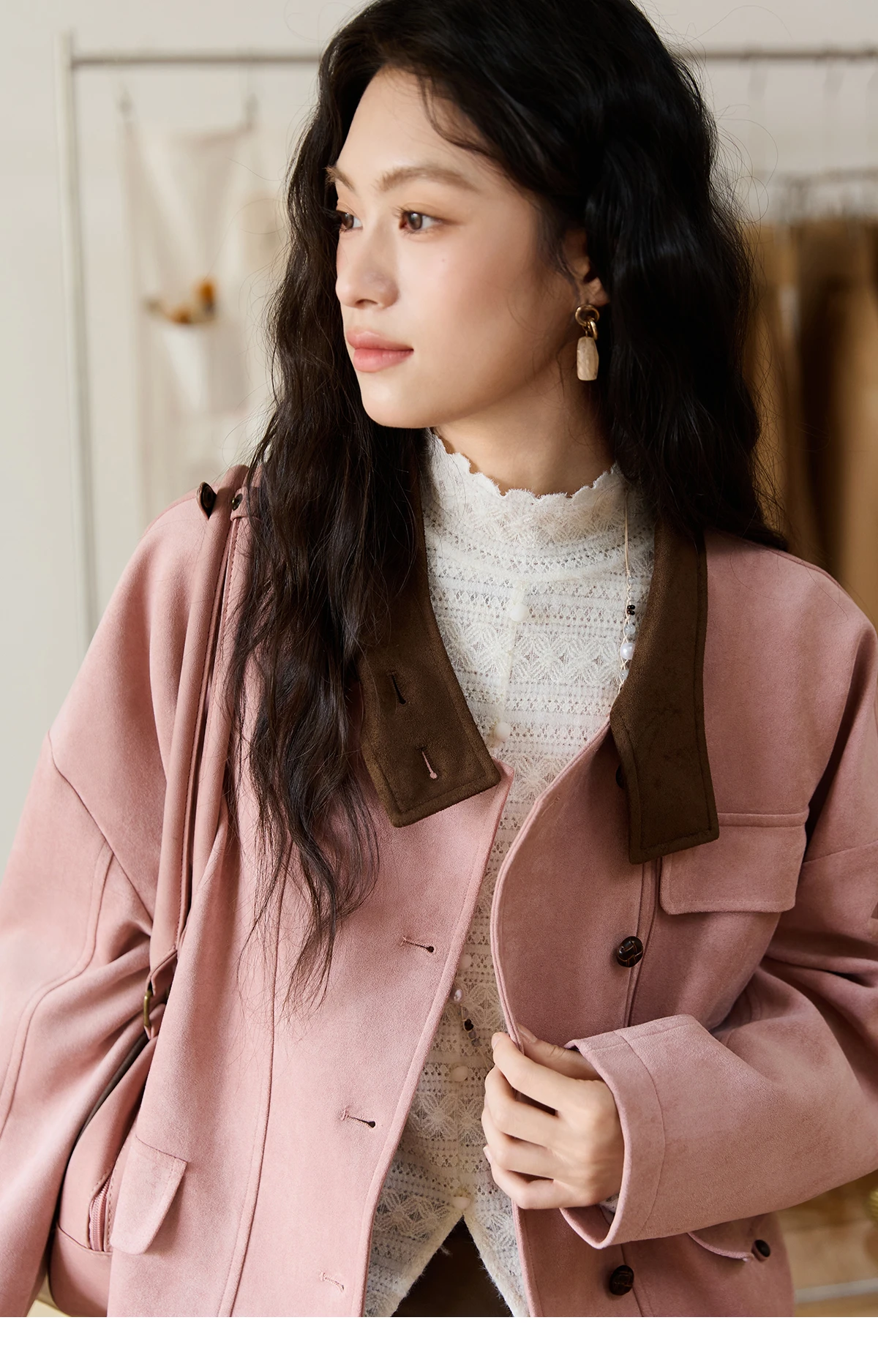 MISHOW Woman Jacket 2025 Autumn French Style Pink Coffee Suede Jacket Contrast Color Stand Collar Loose Short Coat MXE48W0851