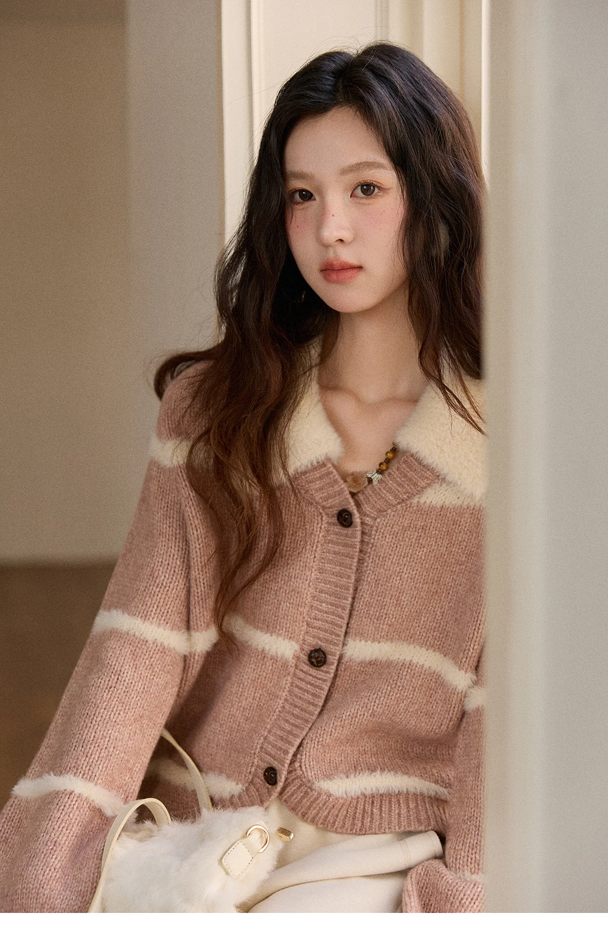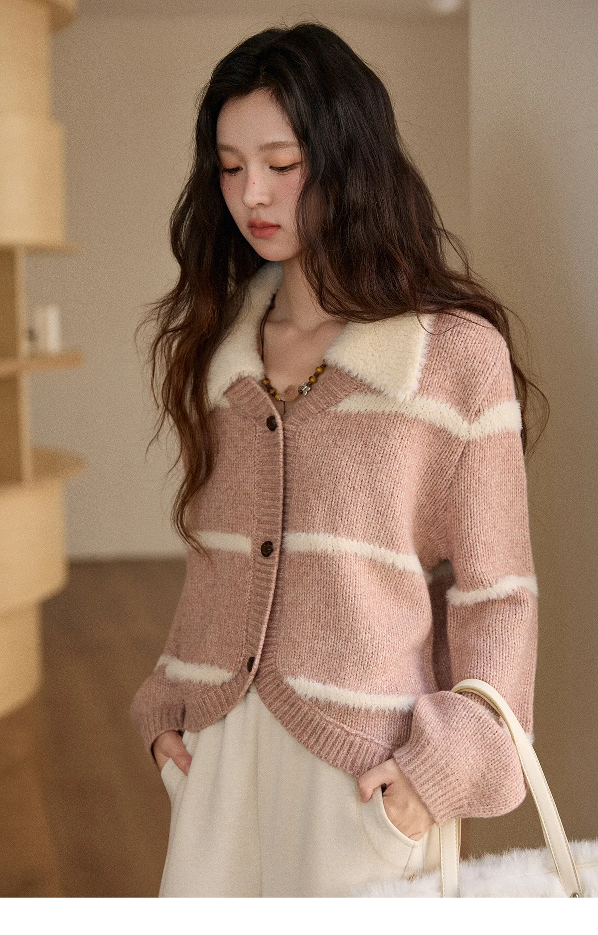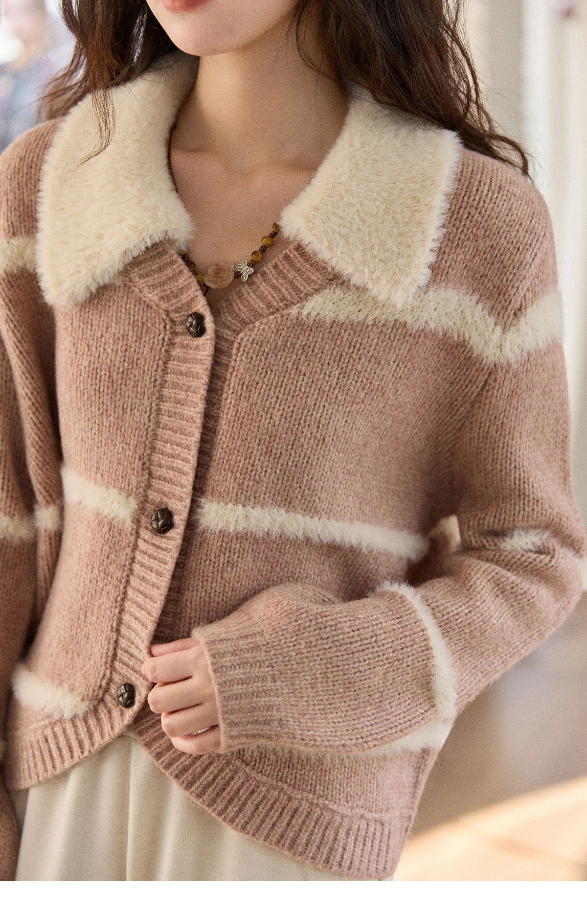 MISHOW Woman Knitted Cardigan 2025 Winter Sweet Style Faux Mink Turn-down Collar Striped Stitching Sweater Commute MXE89Z2668