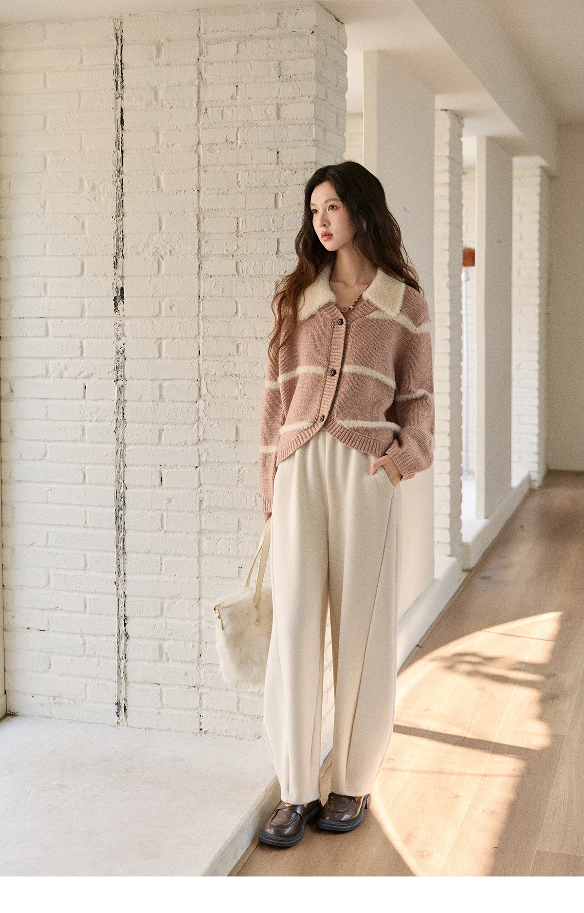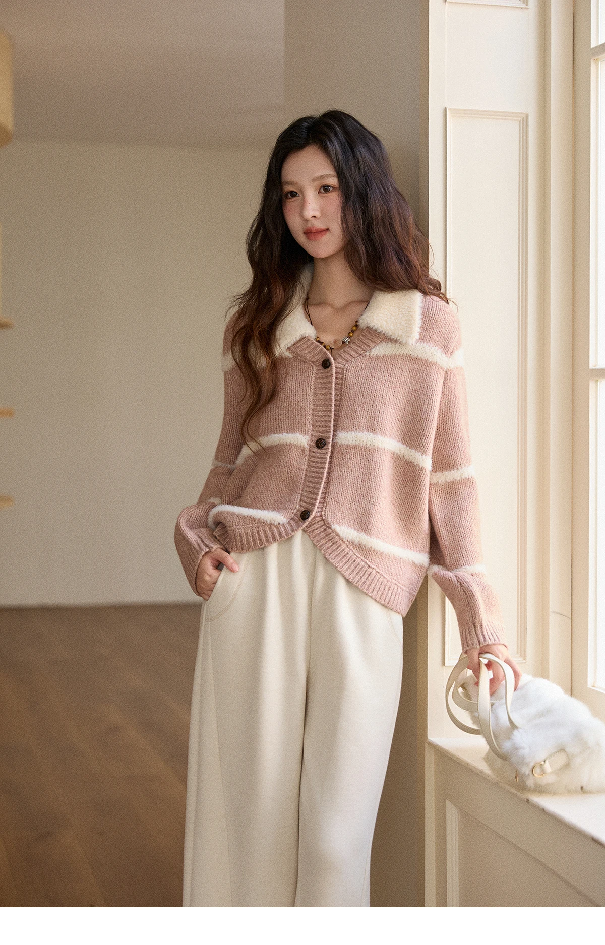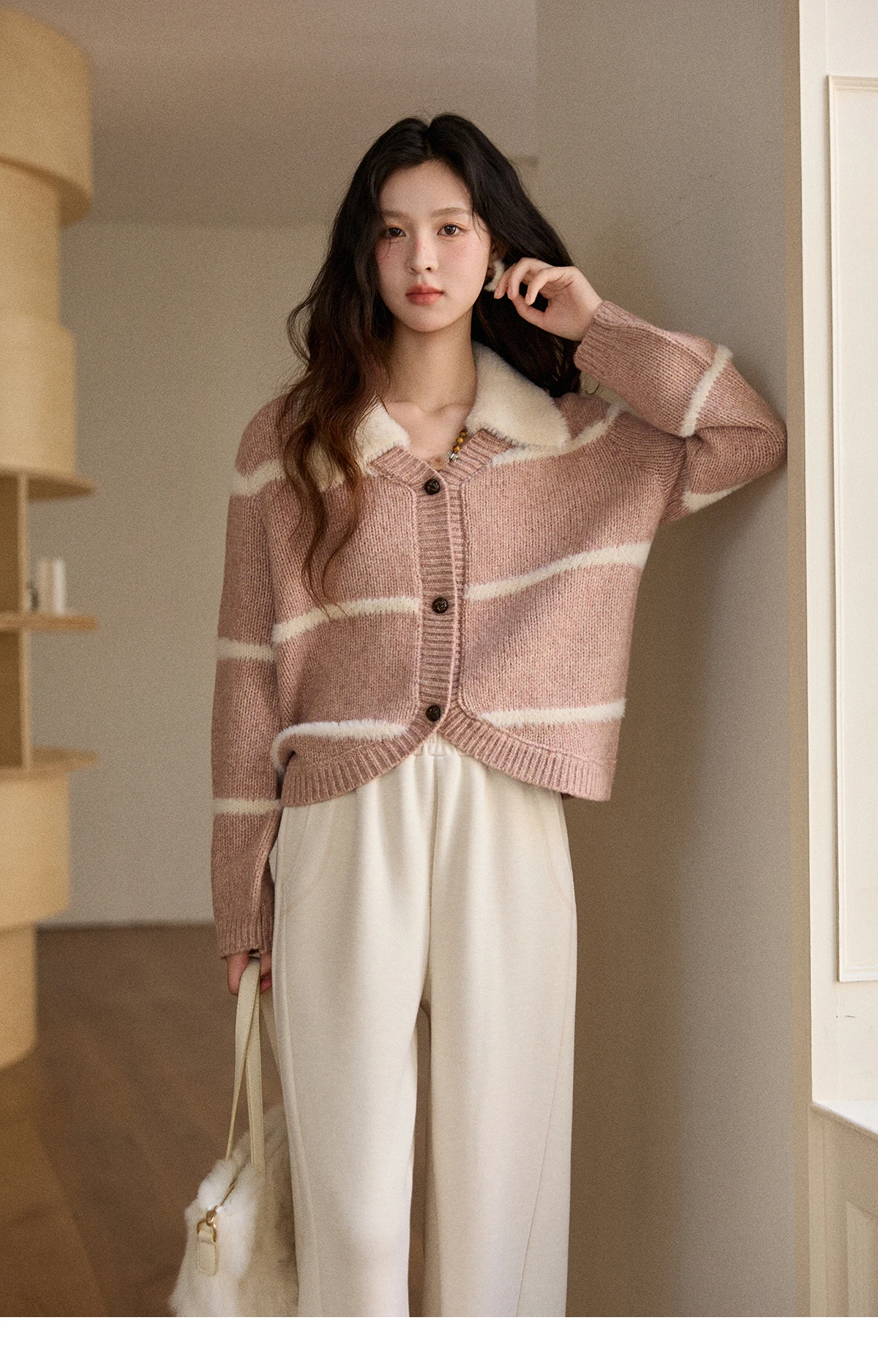 MISHOW Woman Knitted Cardigan 2025 Winter Sweet Style Faux Mink Turn-down Collar Striped Stitching Sweater Commute MXE89Z2668
