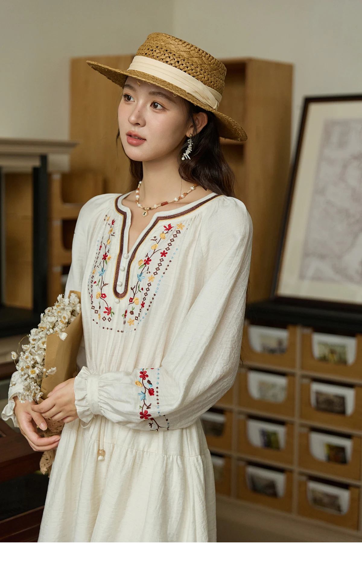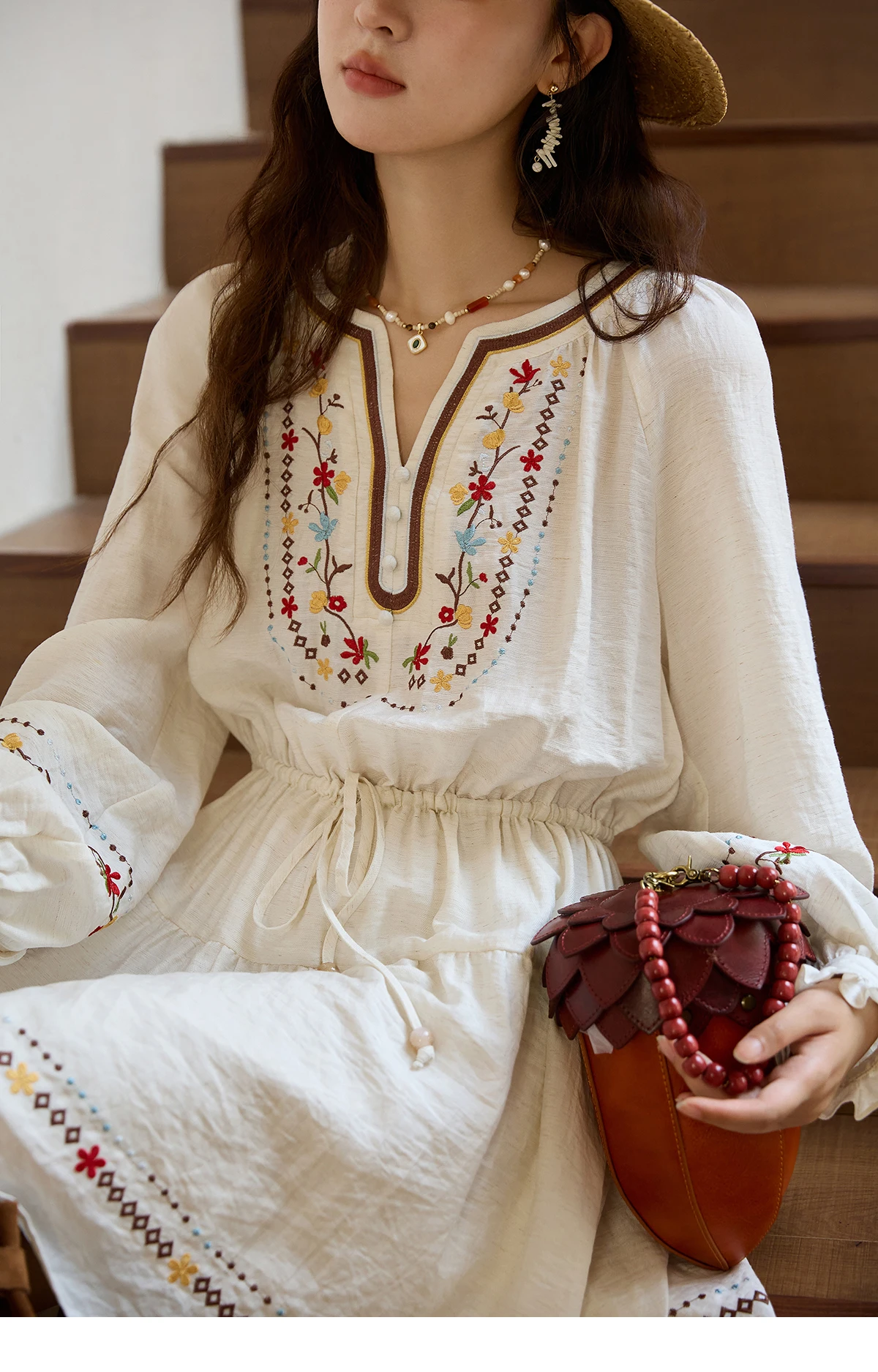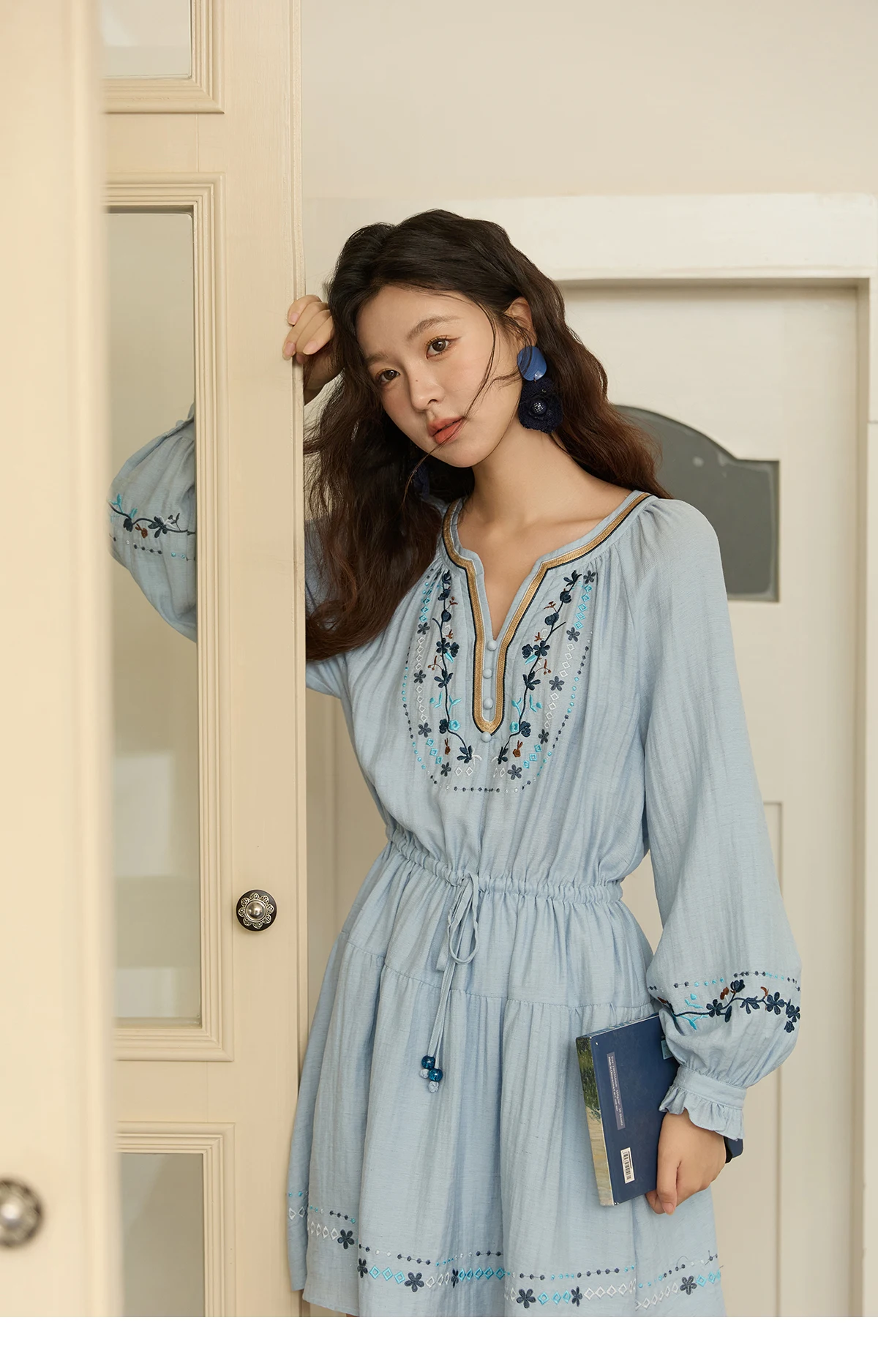 MISHOW Woman Long Sleeve Dress Autumn Elegant V-neck Embroidered Drawstring Waist Dress A-line Bohemian Midi Dresses MXE44L2489
