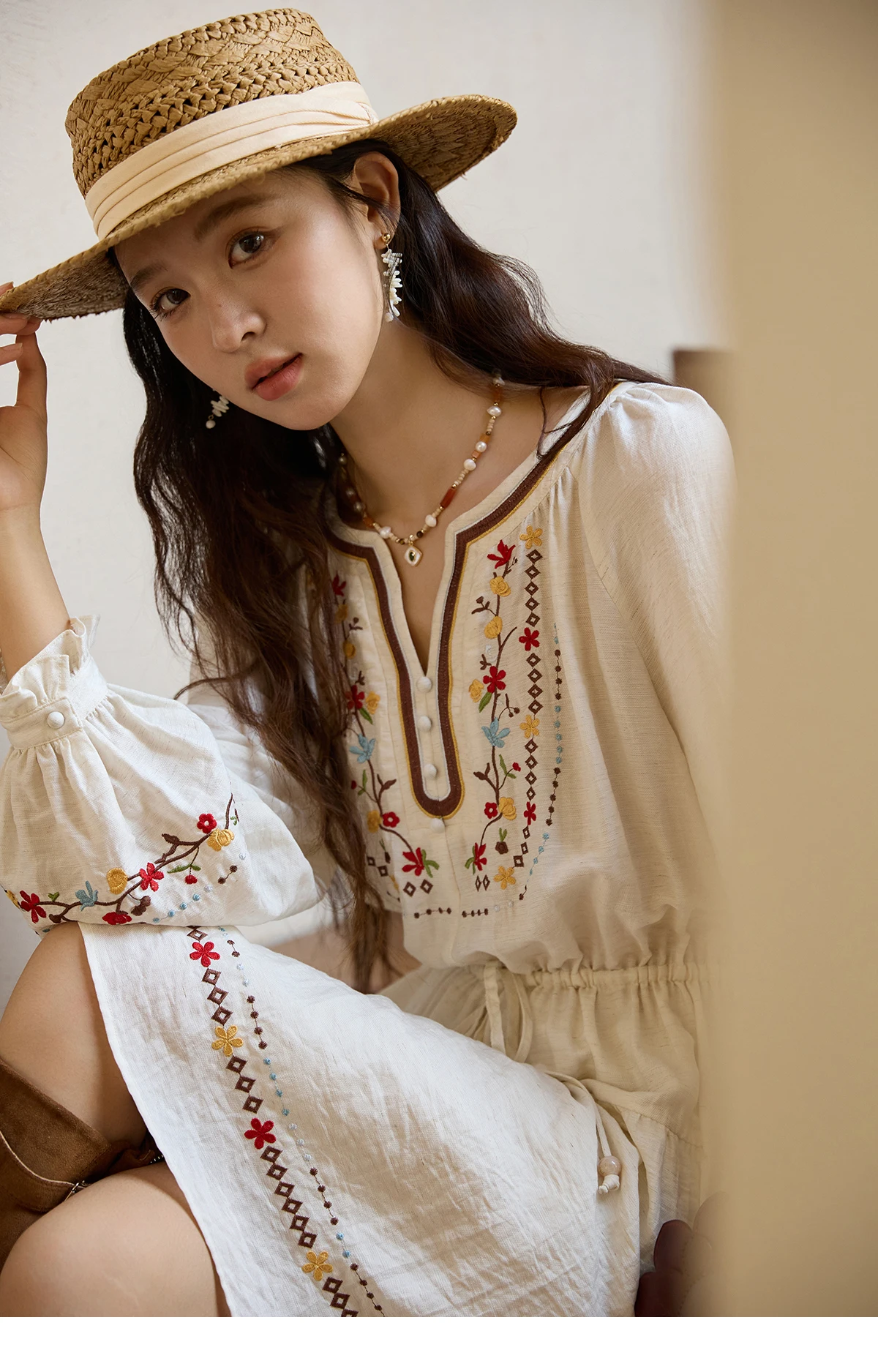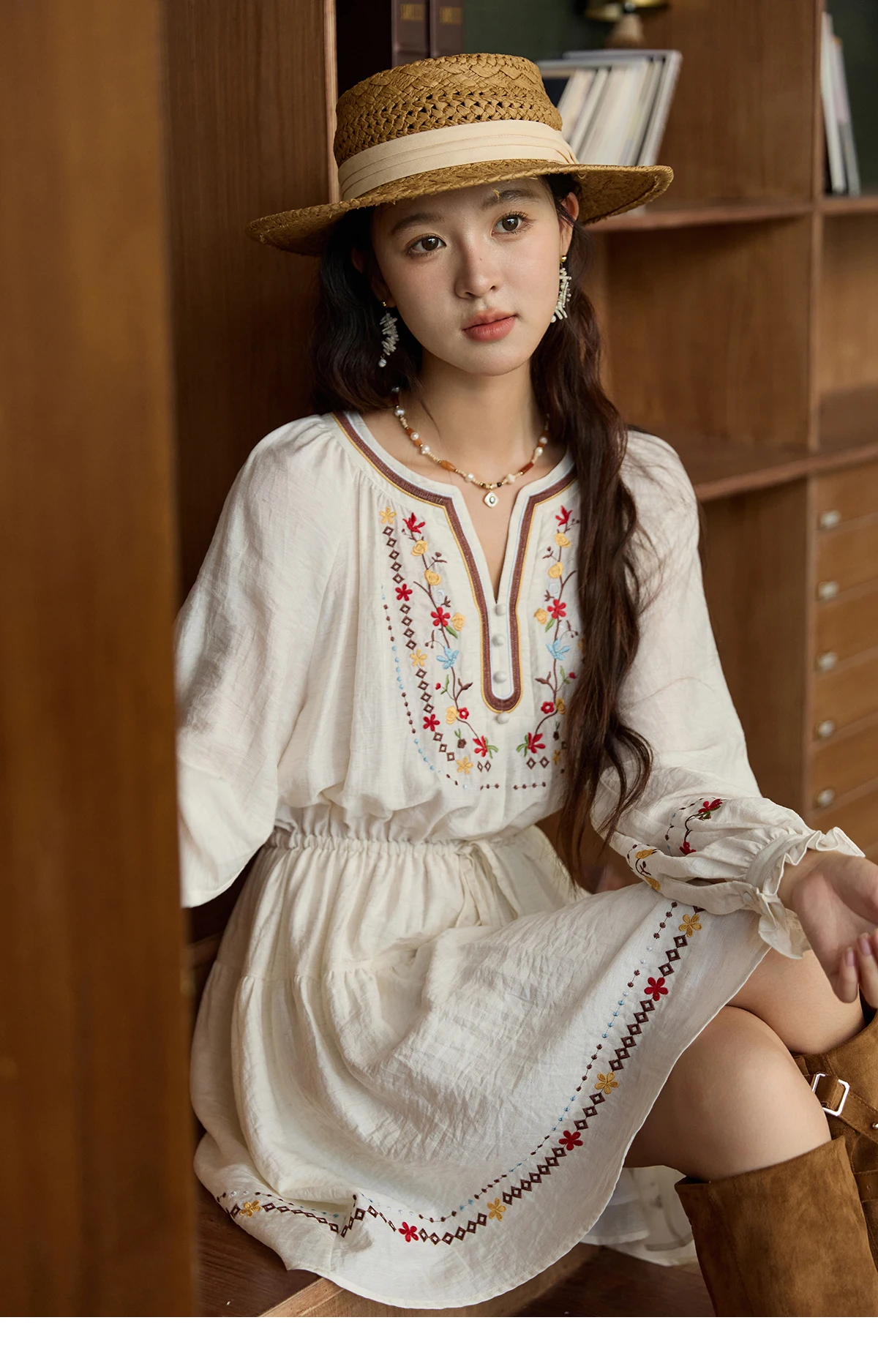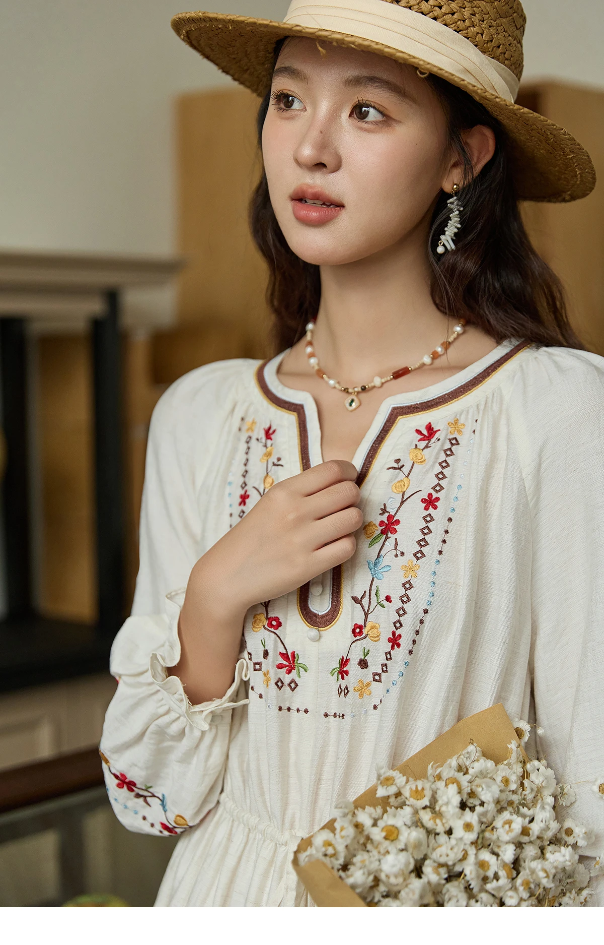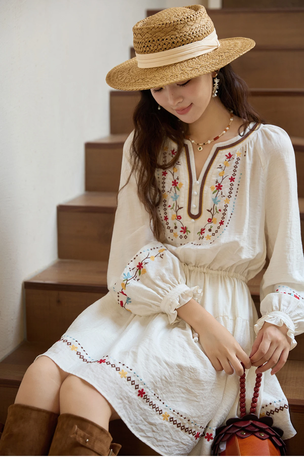 MISHOW Woman Long Sleeve Dress Autumn Elegant V-neck Embroidered Drawstring Waist Dress A-line Bohemian Midi Dresses MXE44L2489