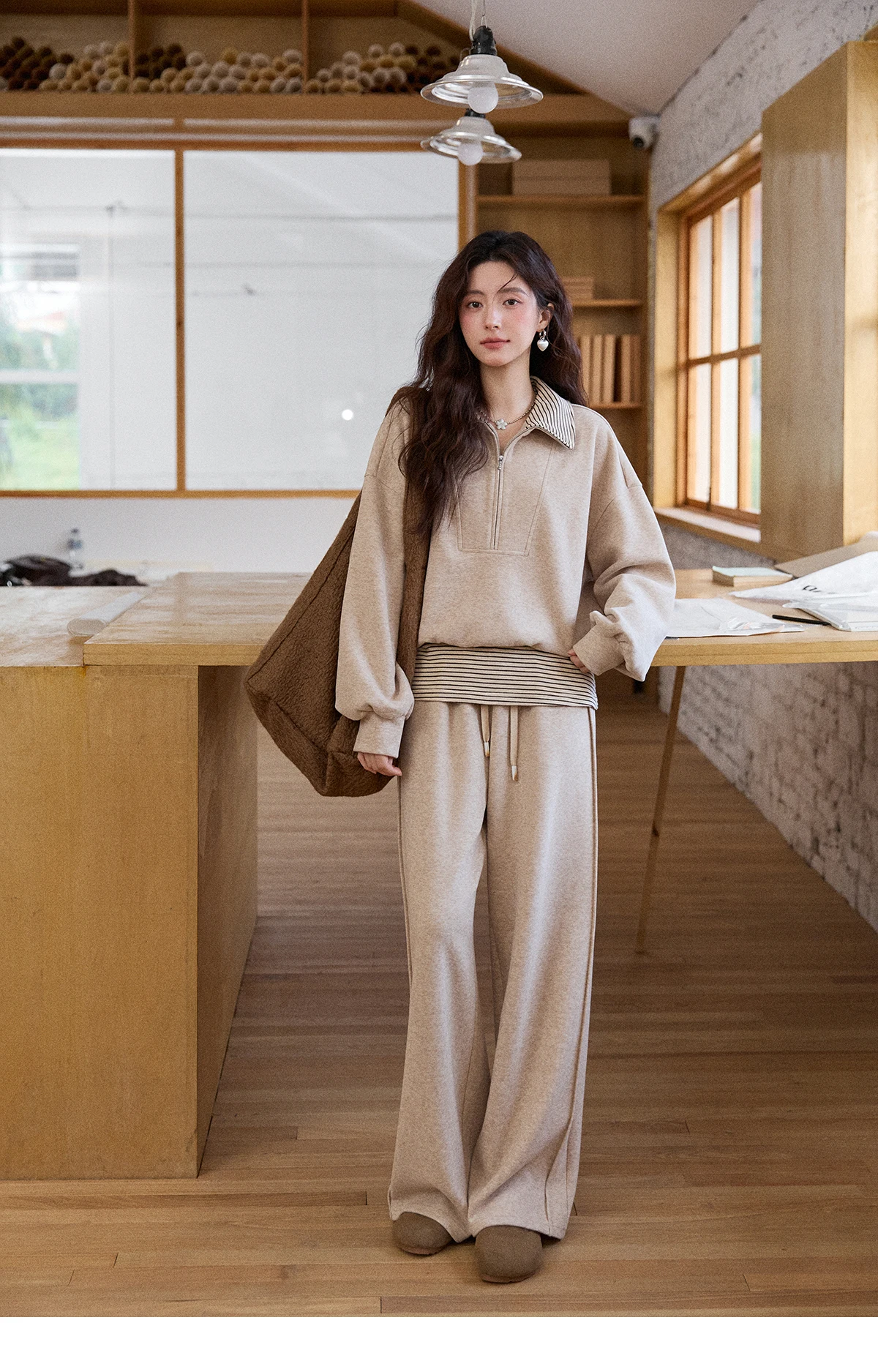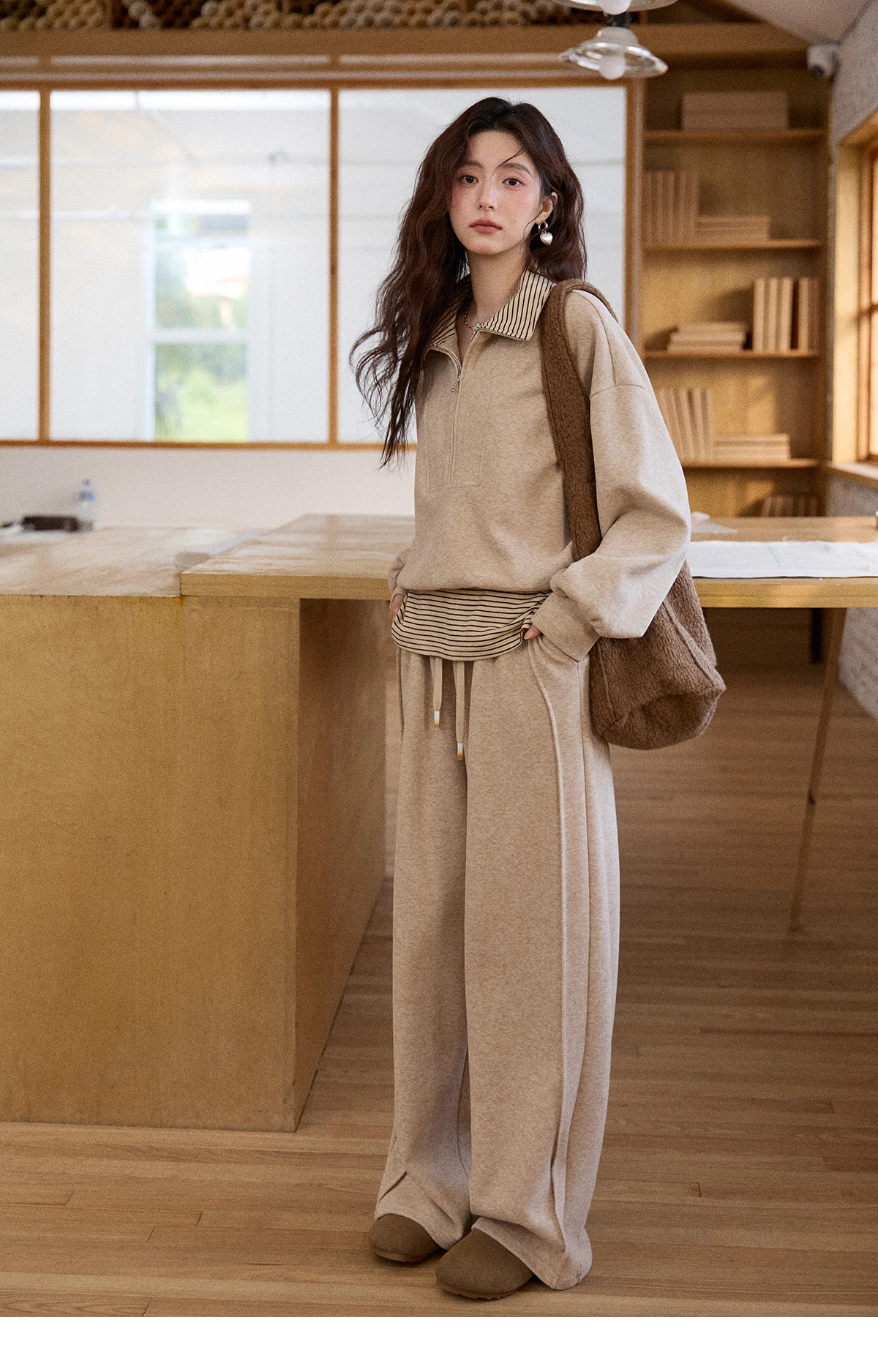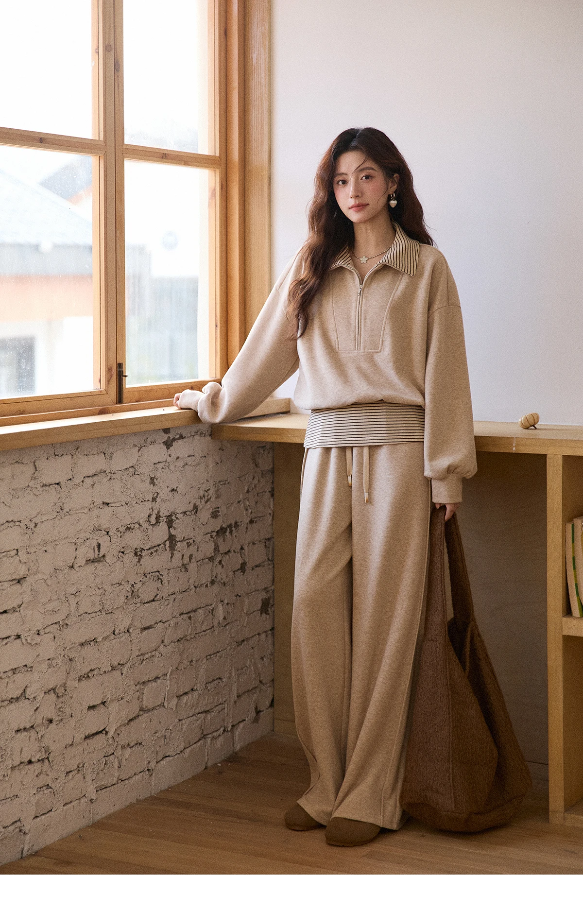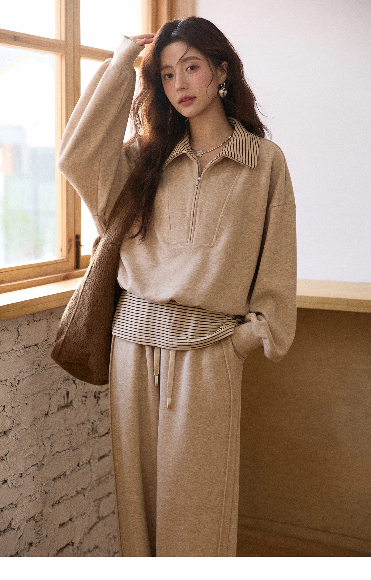 MISHOW Woman Pants Set 2025 Winter Casual Retro Sweatshirt Set Striped Lapel Half-Zip Sweatshirt Wide Leg Pants MXE87T1425