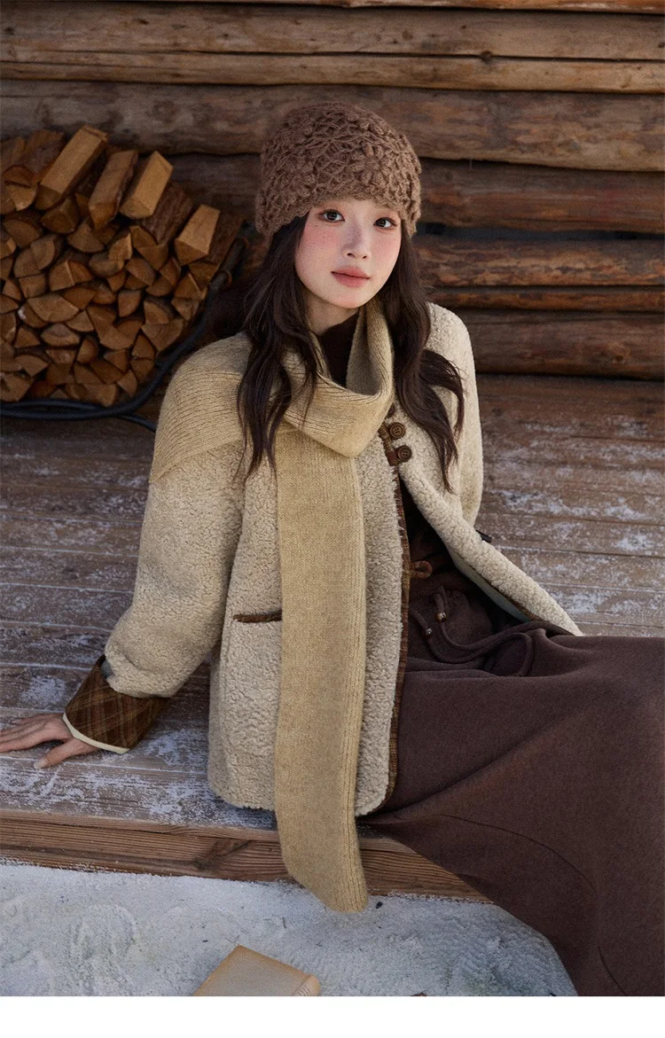 MISHOW Woman Plaid Patchwork Lamb Wool Coat 2025 Winter Round Neck Coat Commute Warm Loose Jacket (Without A Scarf)MXE90W0923