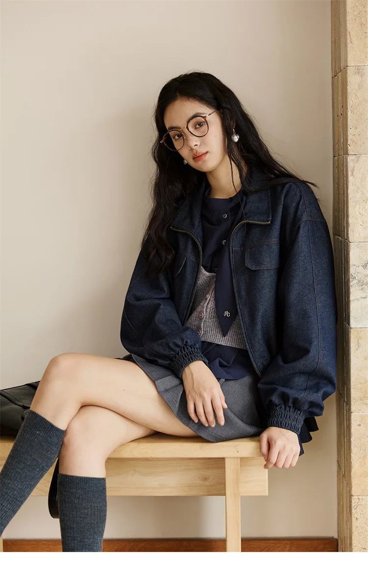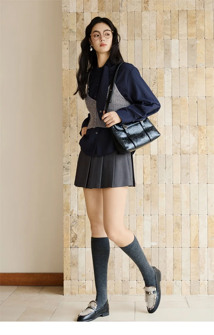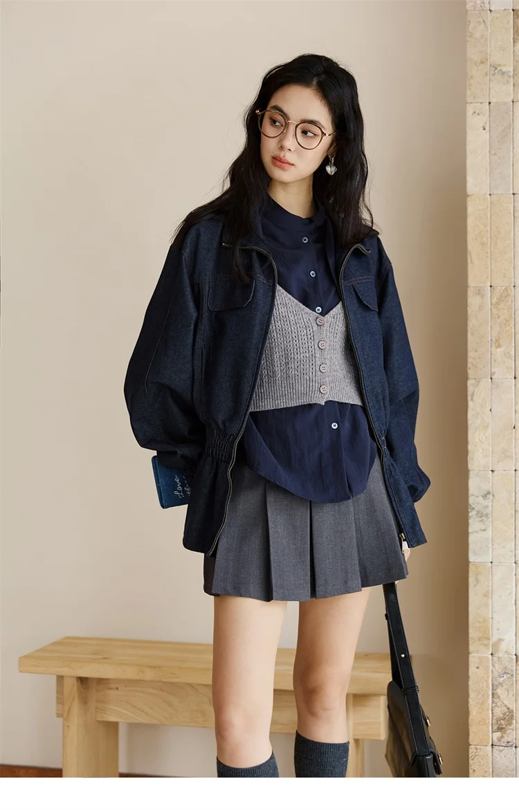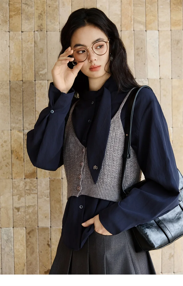 MISHOW Woman Shirt Set 2025 Autumn Fashion New Navy Blue Ribbon Design Layered Shirt Knit Camisole Two-piece Suit MXE47T1412