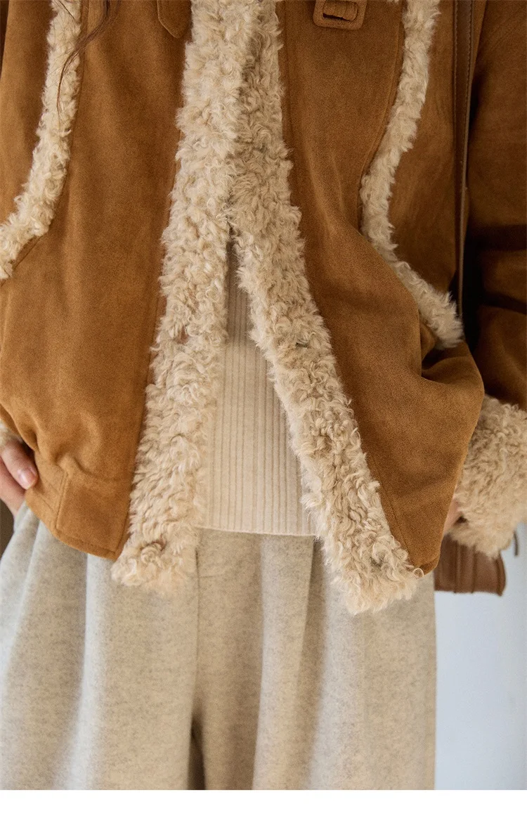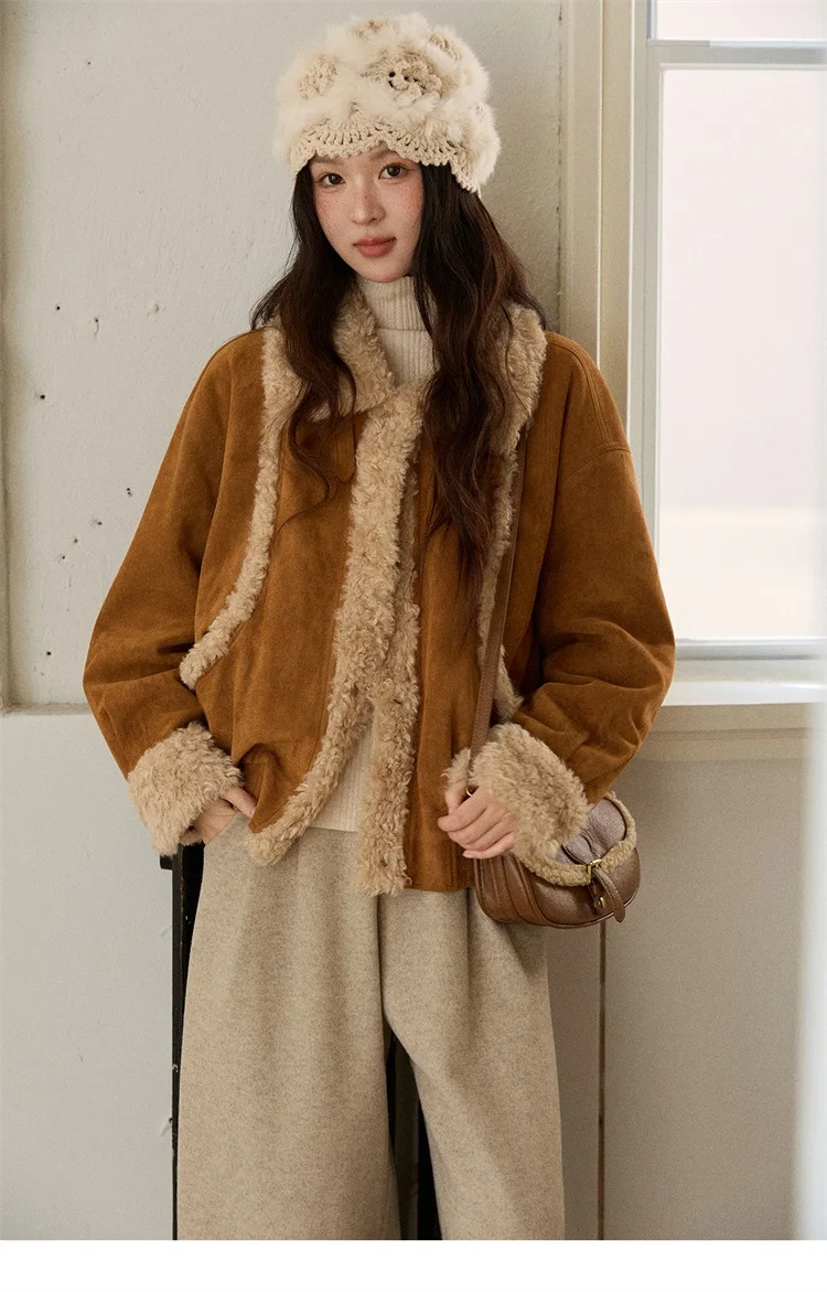 MISHOW Woman Short Jacket 2025 Winter Retro Brown Suede Patchwork Fur Coat Loose Faux Lambswool Turn Down Collar Coat MXE89W0895