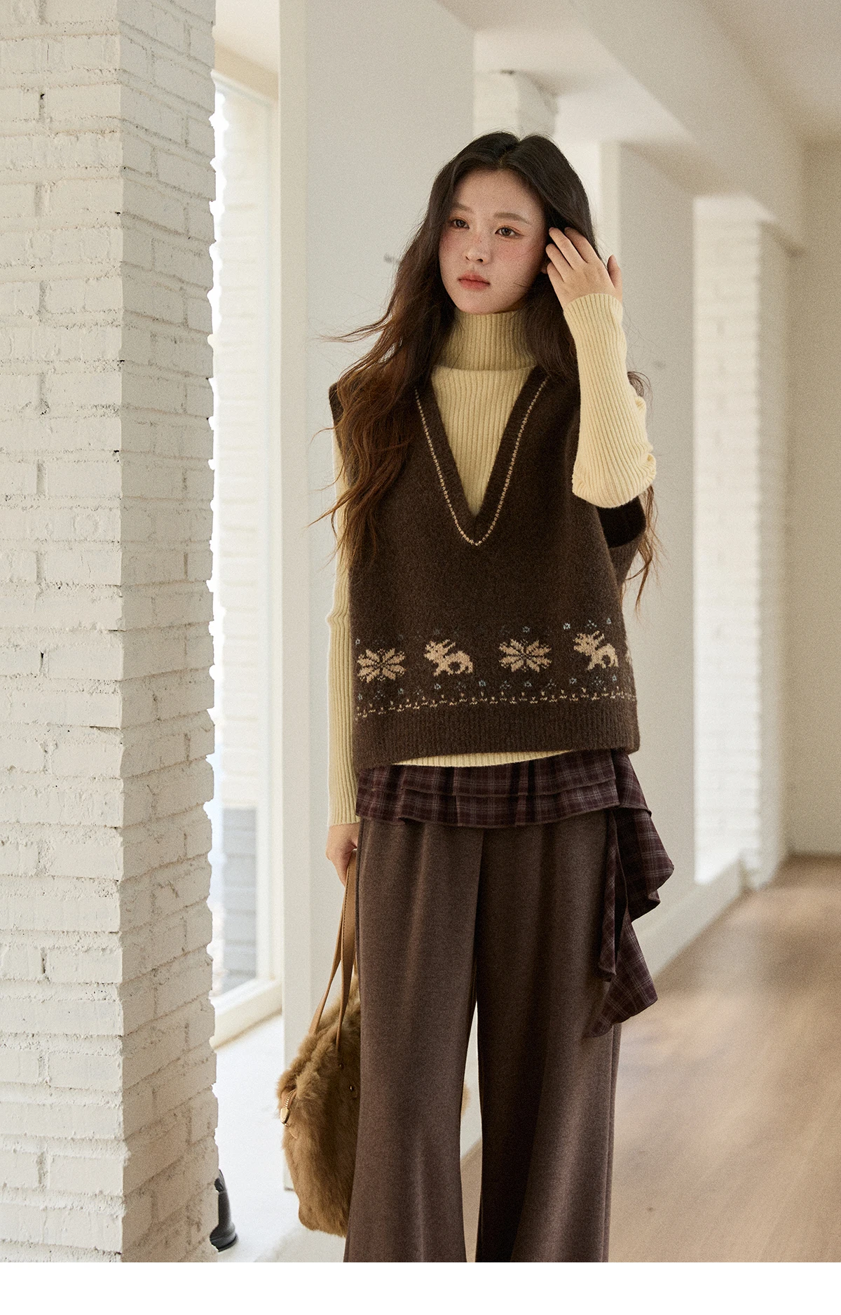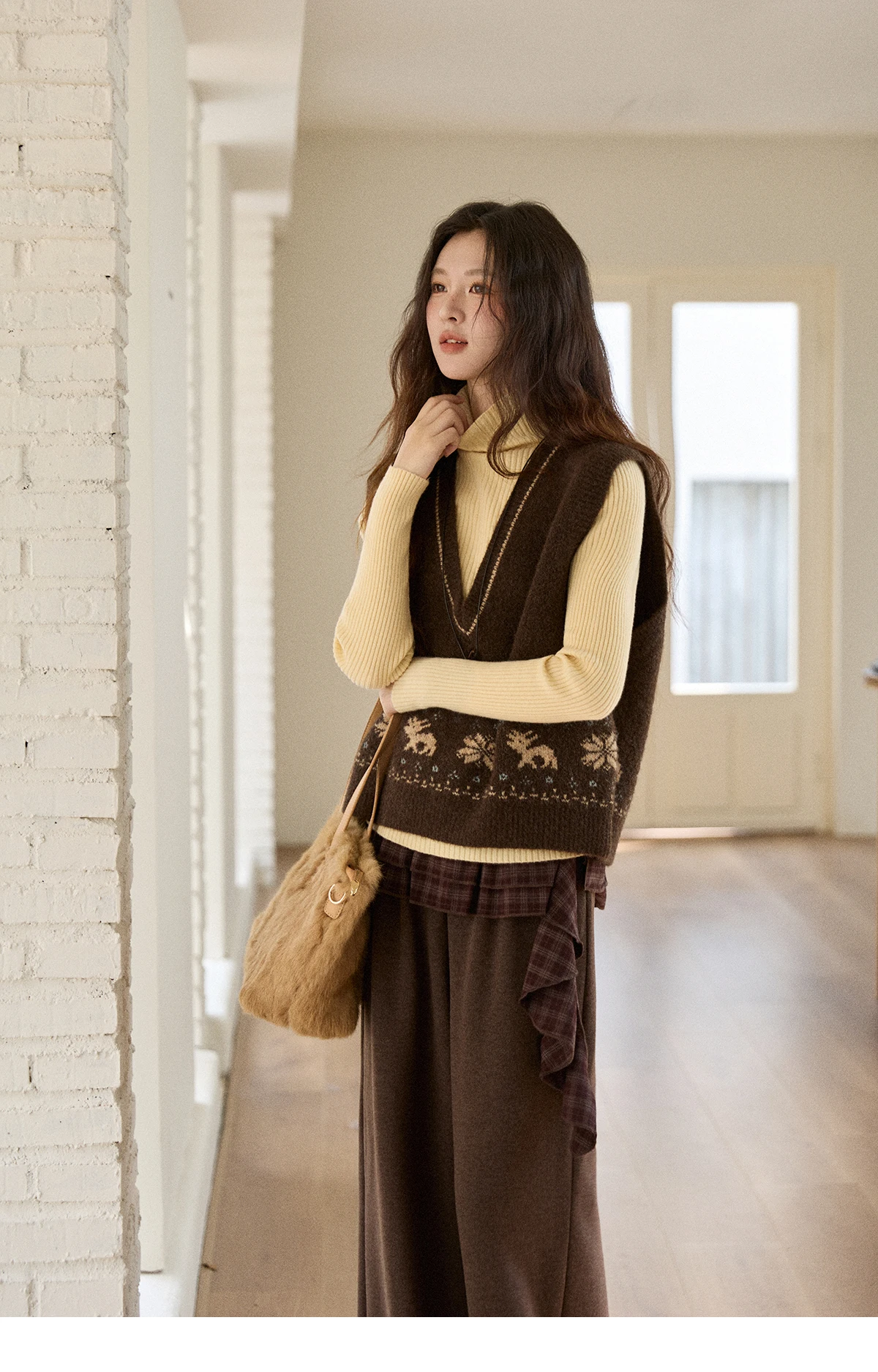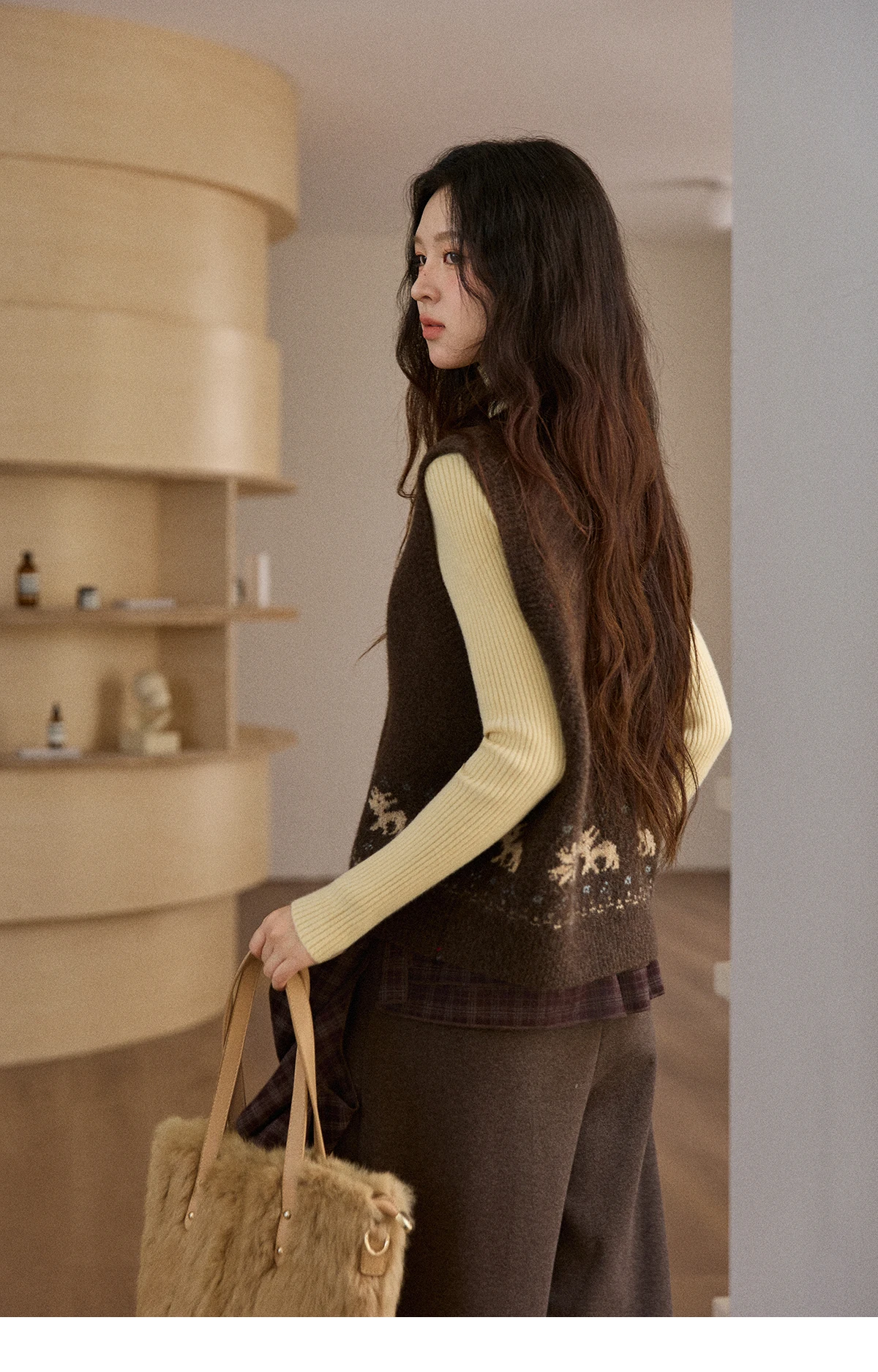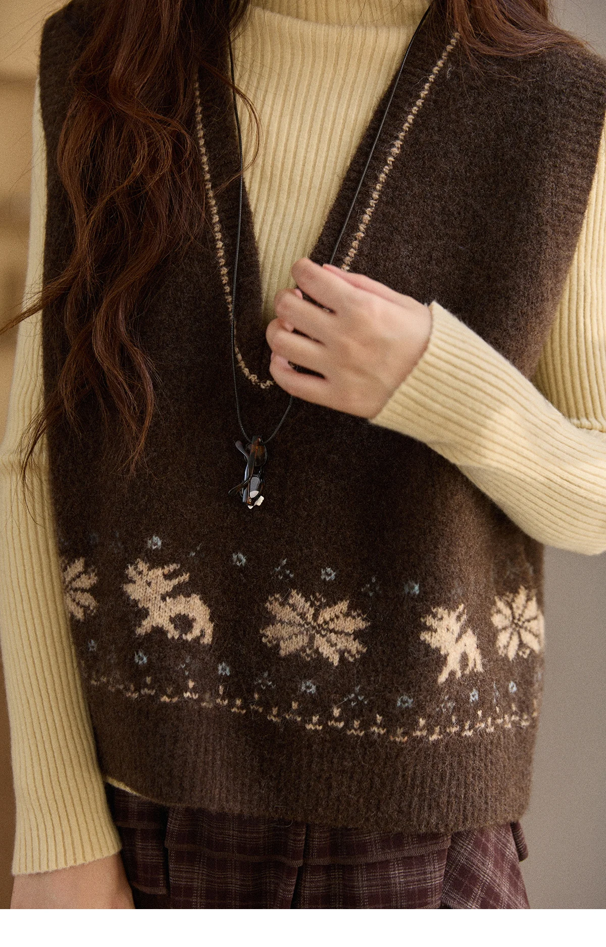 MISHOW Woman Sweater Vest 2025 Winter Retro Brown Jacquard V-neck Knitted Vest Loose Commute Versatile Pullover MXE86Z2659