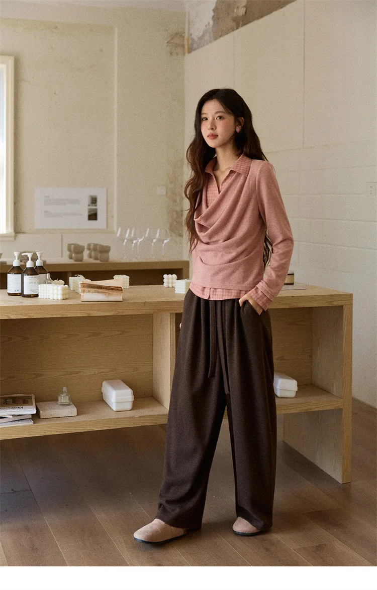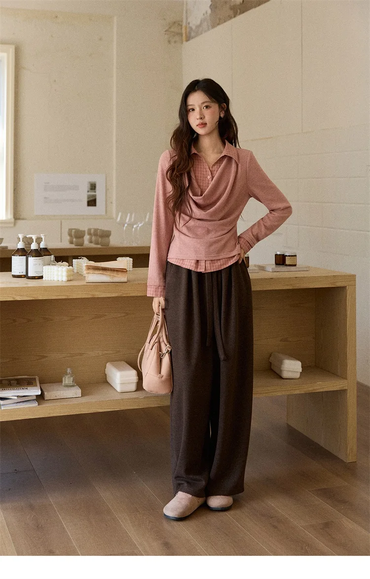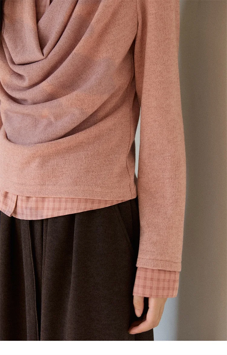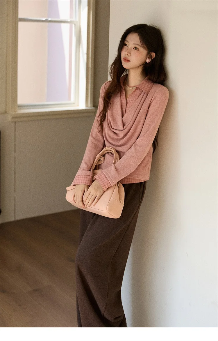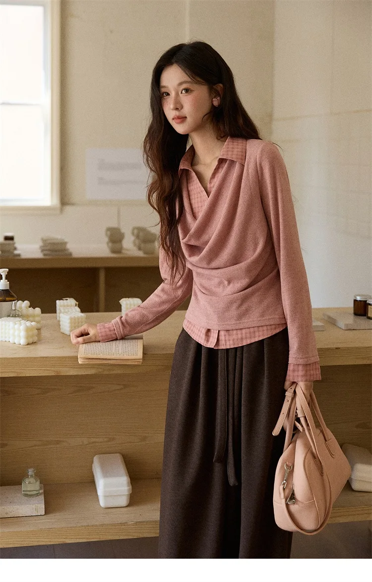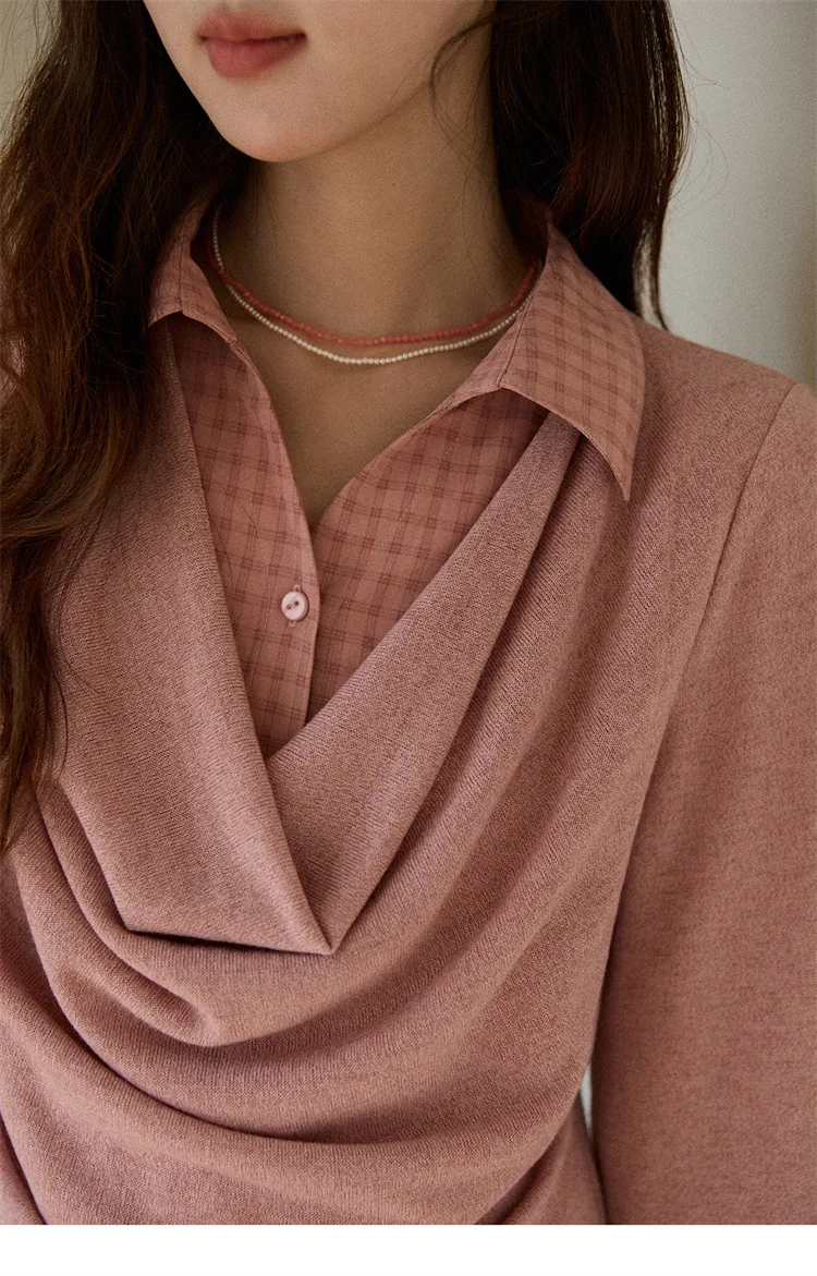 MISHOW Women Knit Top 2025 Winter Faux Two-piece Pullovers Retro Plaid Patchwork Draped Collar Luxury Design Pink Top MXE87Z2747