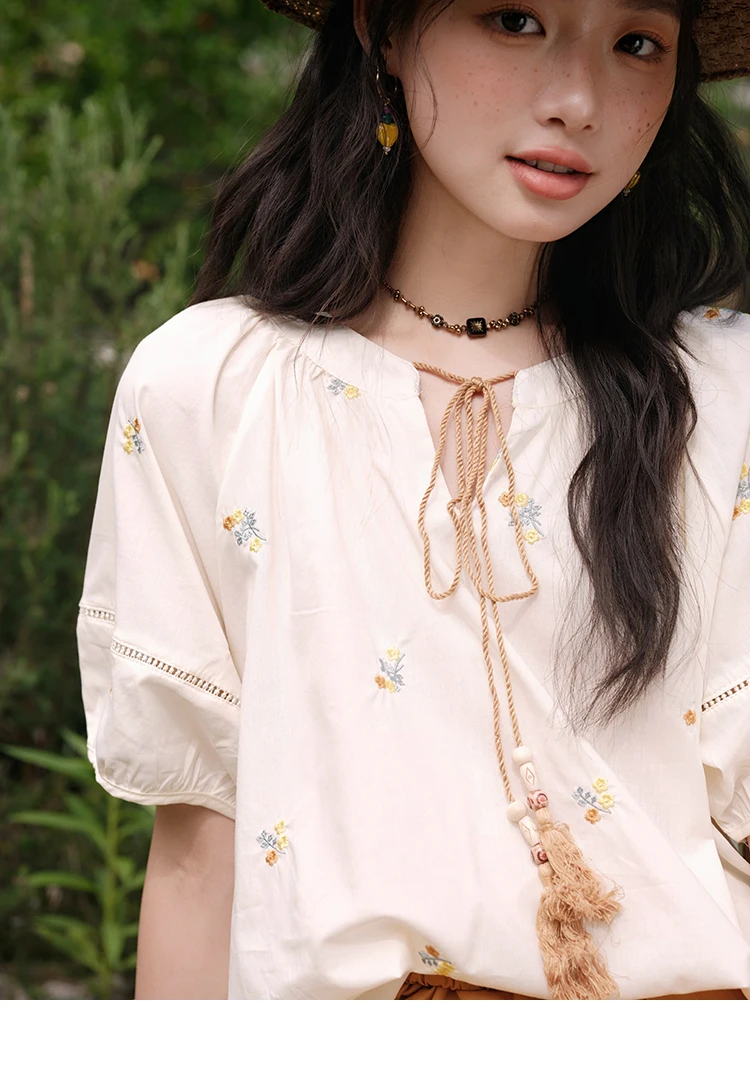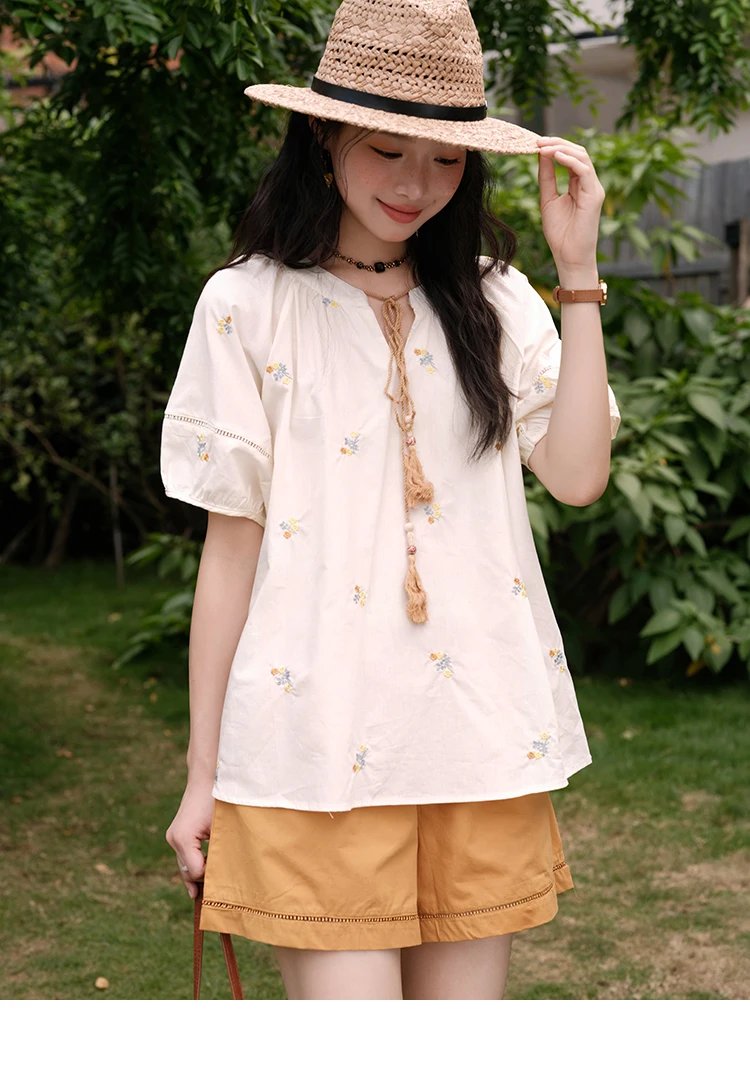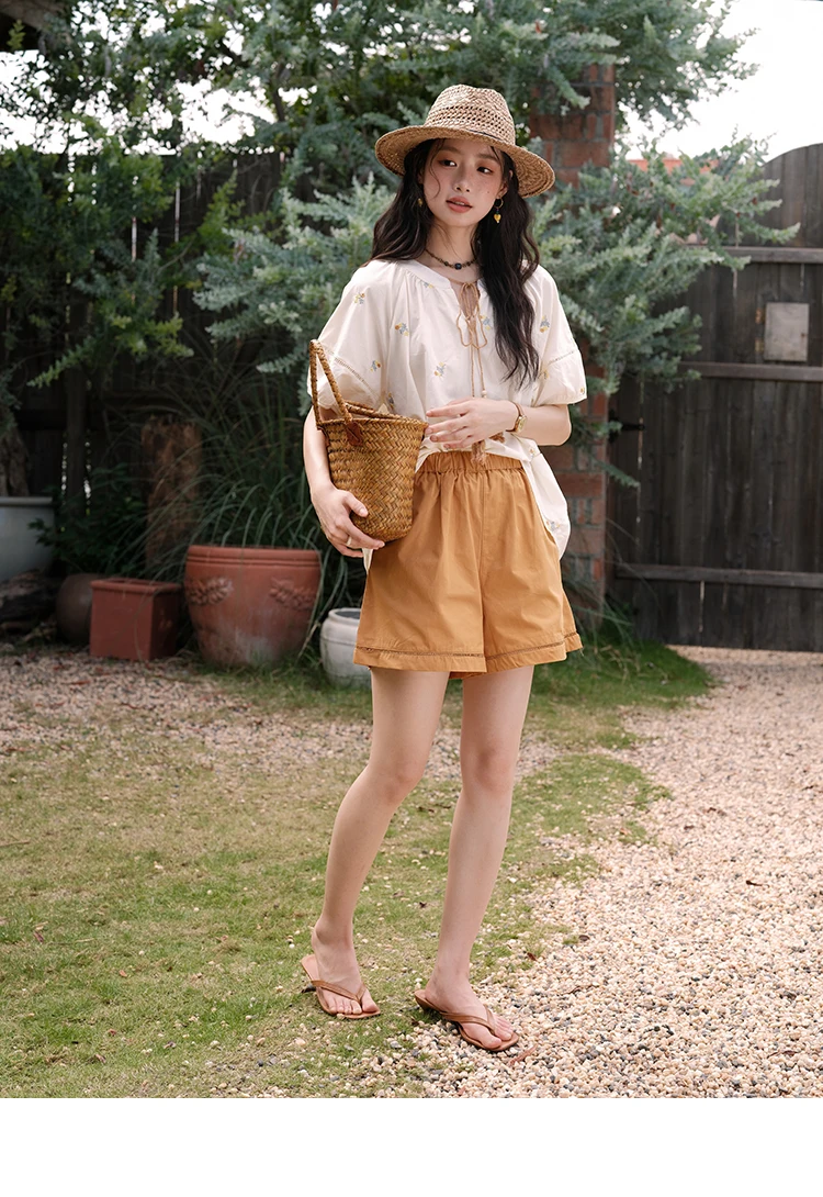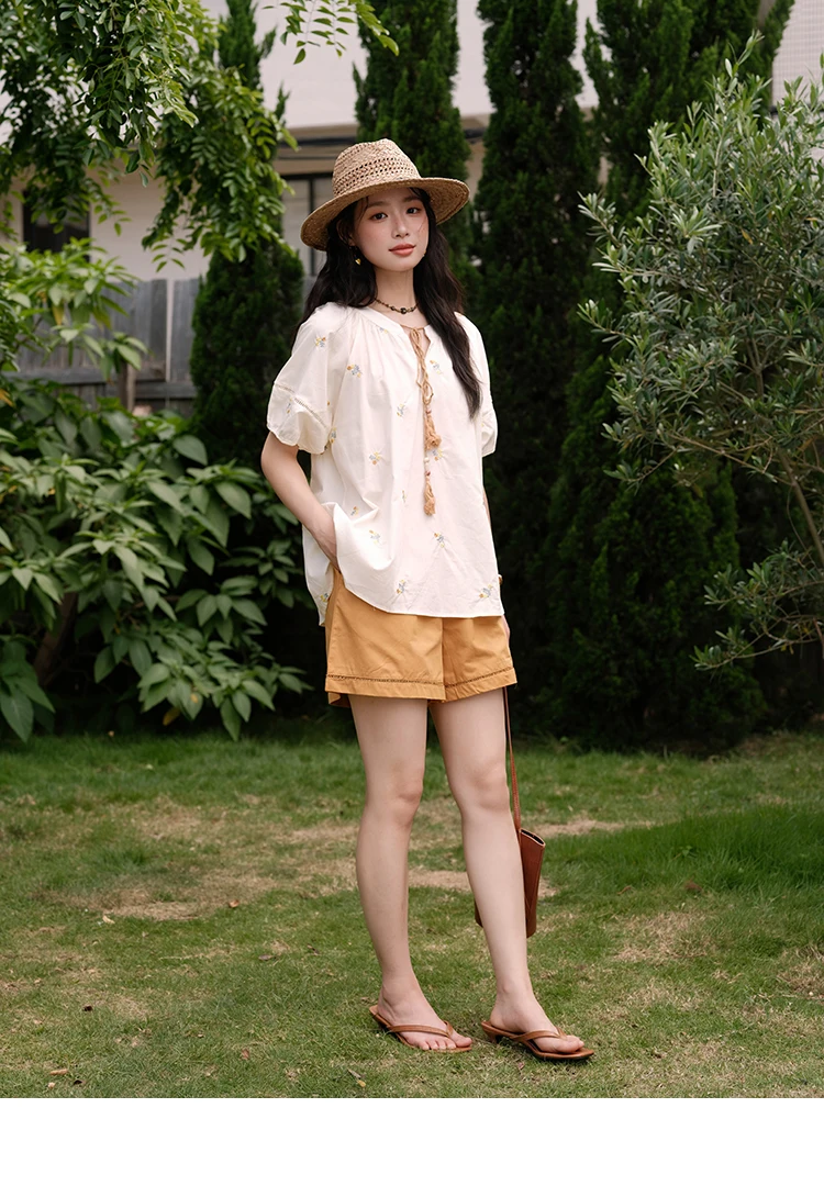 MISHOW Women Two-Piece Set 2025 Summer Puff Sleeve Lace Up Top Hollow Lace Spliced Elastic Waist Shorts Ladies Set MXE38T0684