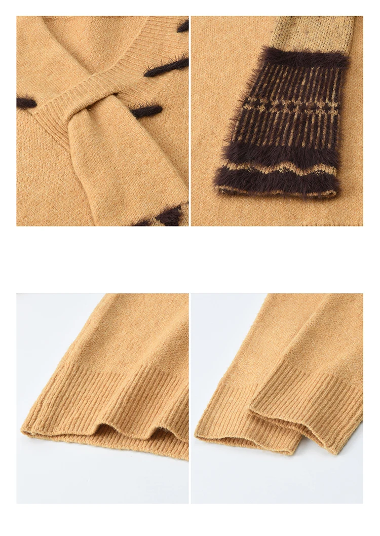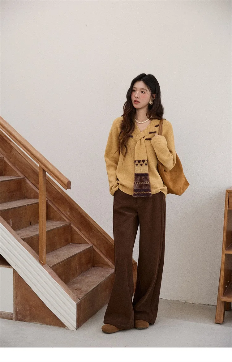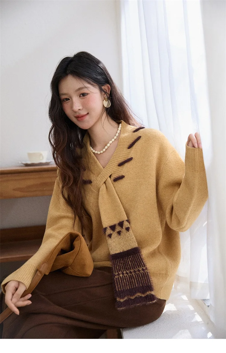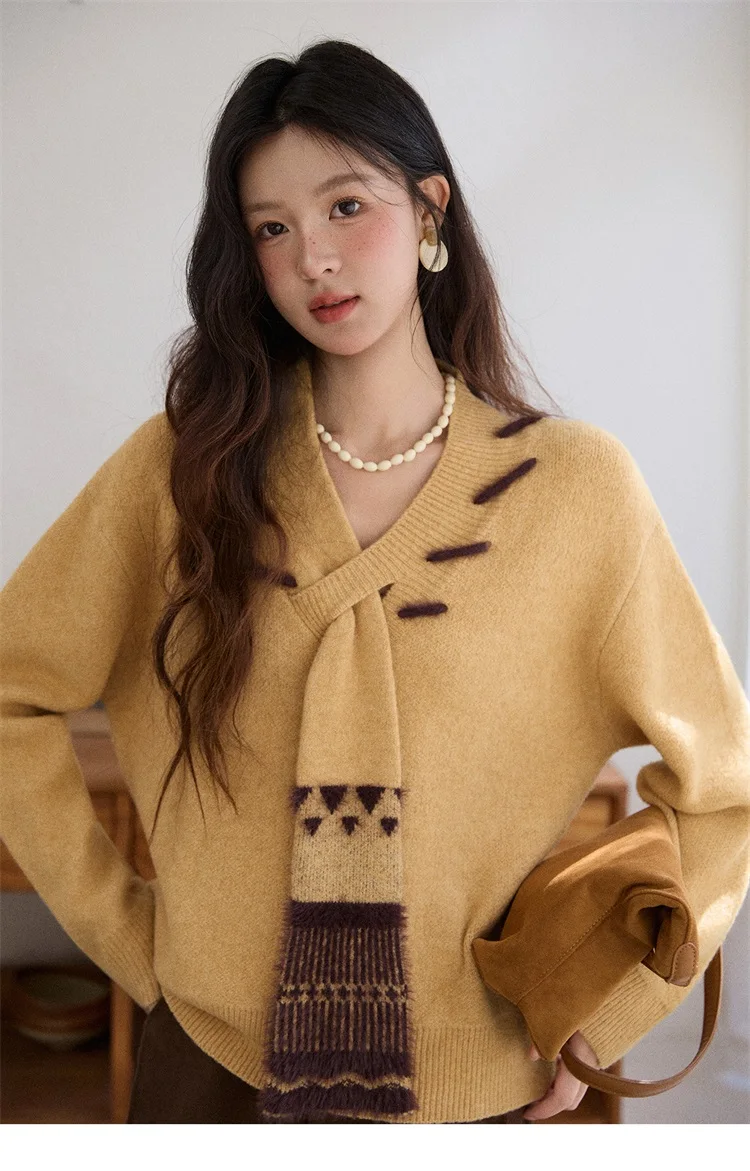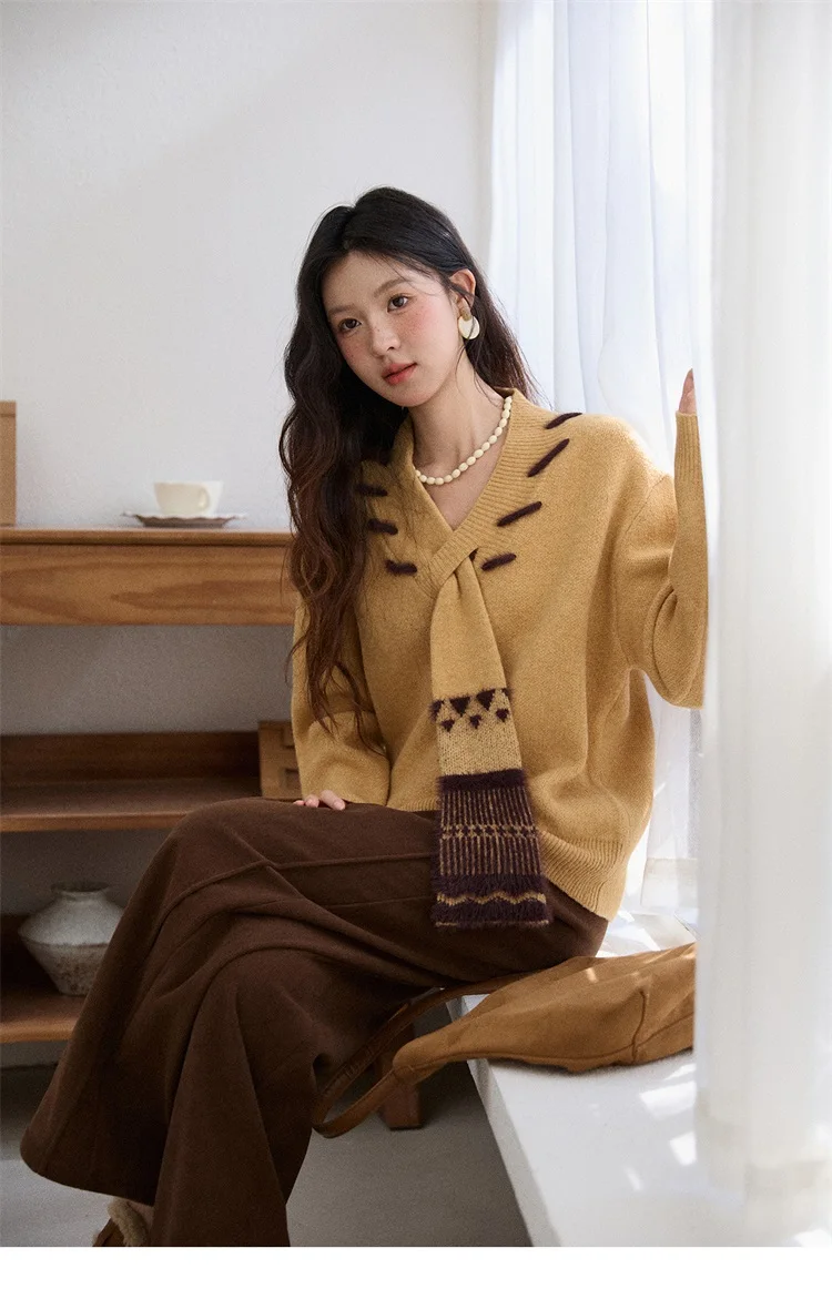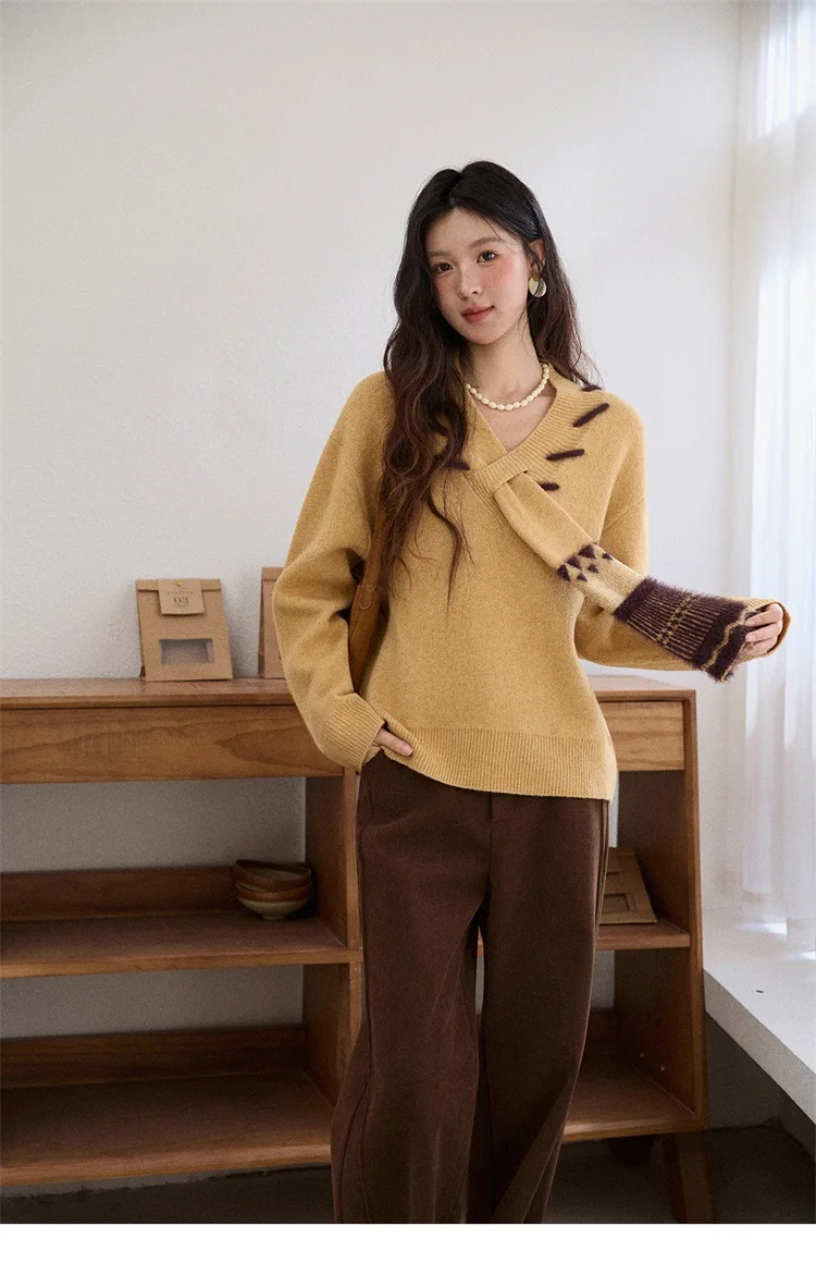 MISHOW Women V-neck Knit Top 2025 French-style Elegant Workwear Long-sleeved Yellow Pullover Women's Winter Clothing MXE87Z2771