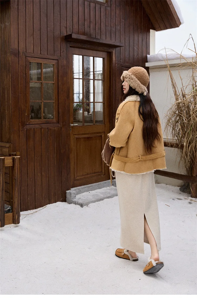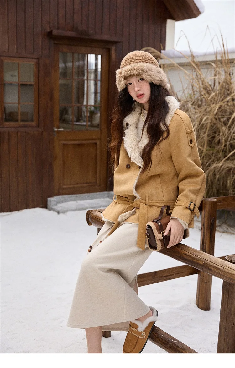 MISHOW Women Winter Jacket 2025 Fashion Suede Lambskin Fleece Coat Commute Windproof Retro Double-breasted Warm Coat MXE86W0907