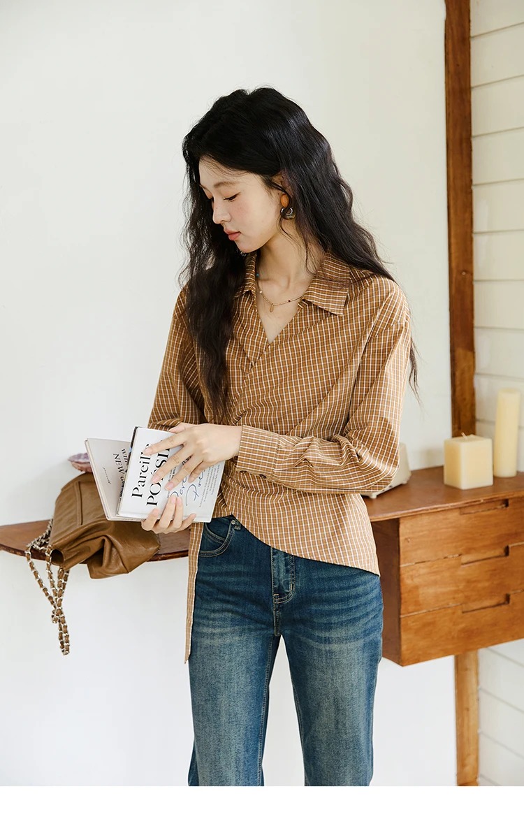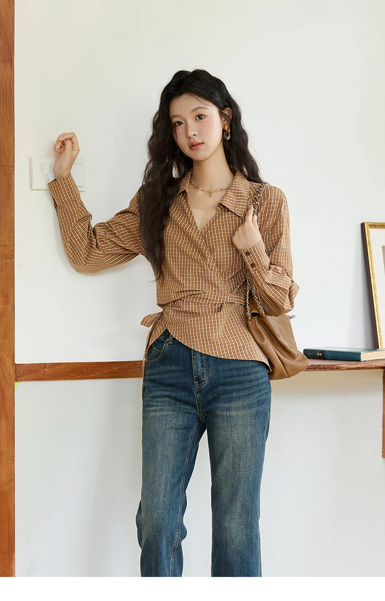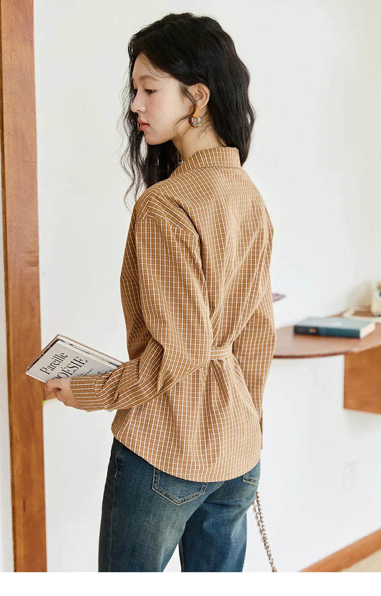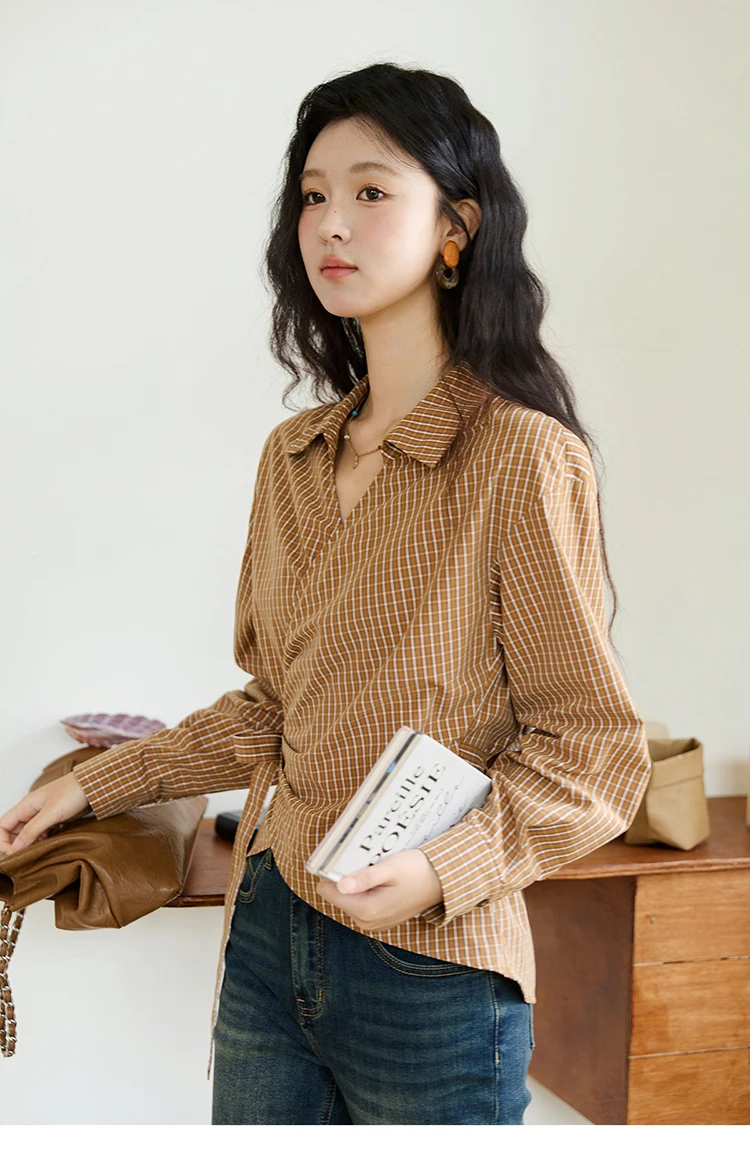 MISHOW Women's 100 Cotton Dark Orange Plaid Shirt Autumn Design Side Waist Lace-up Long Sleeved Shirts Office Lady MXE46X2494