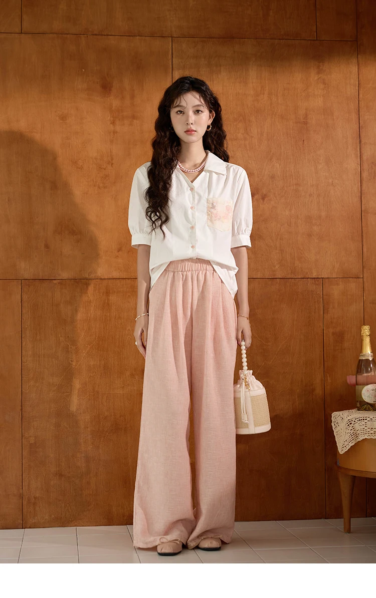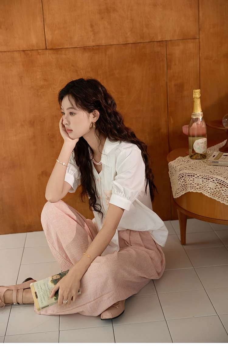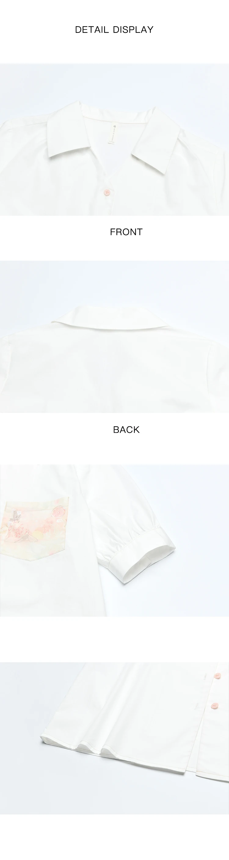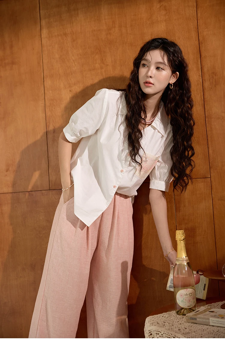 MISHOW Women's 100 Cotton Short Sleeved Shirt Loose 2025 Summer Embroidered Pocket Top Polo Neck Puff Sleeve Shirts MXD26C0243