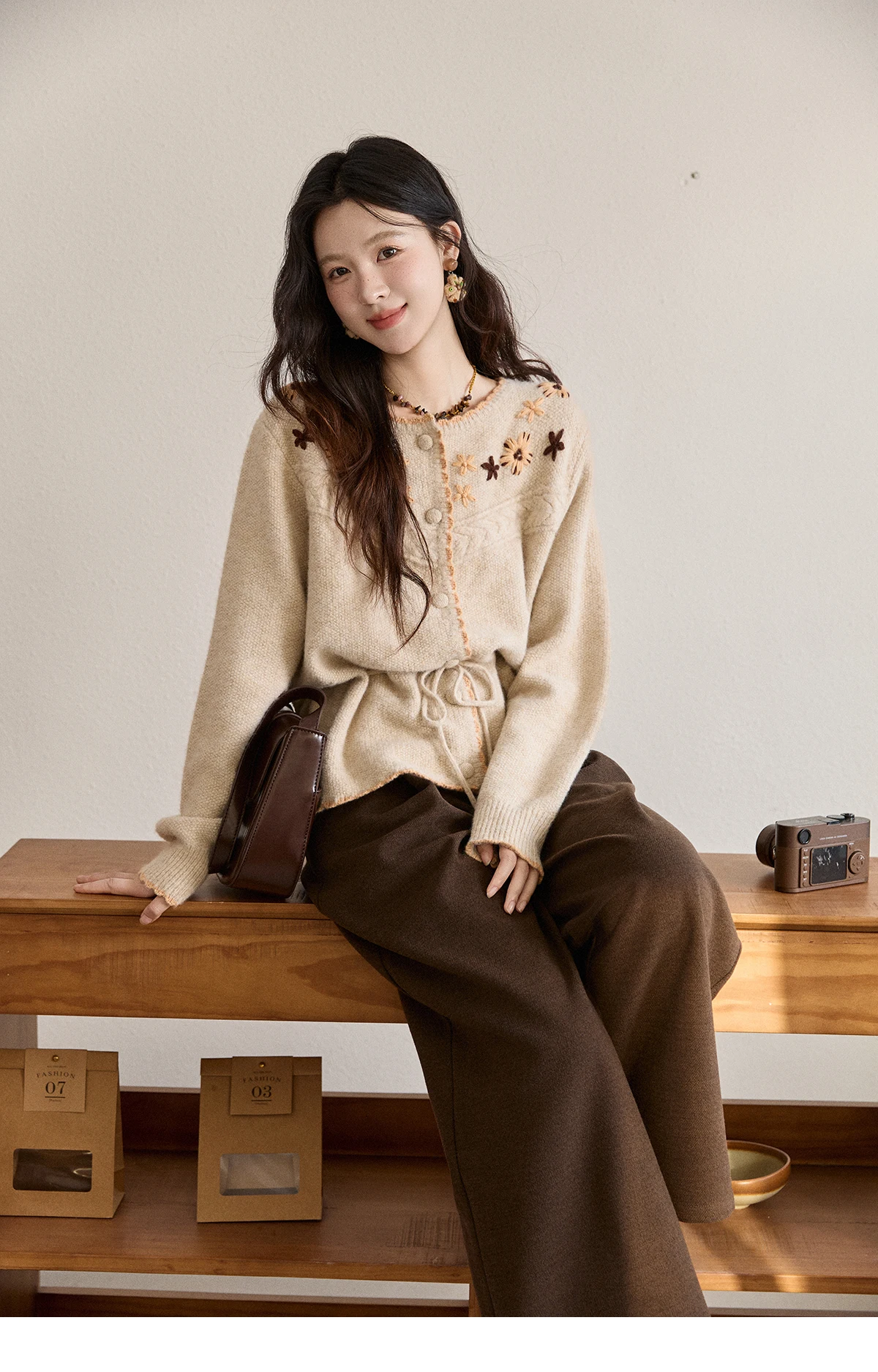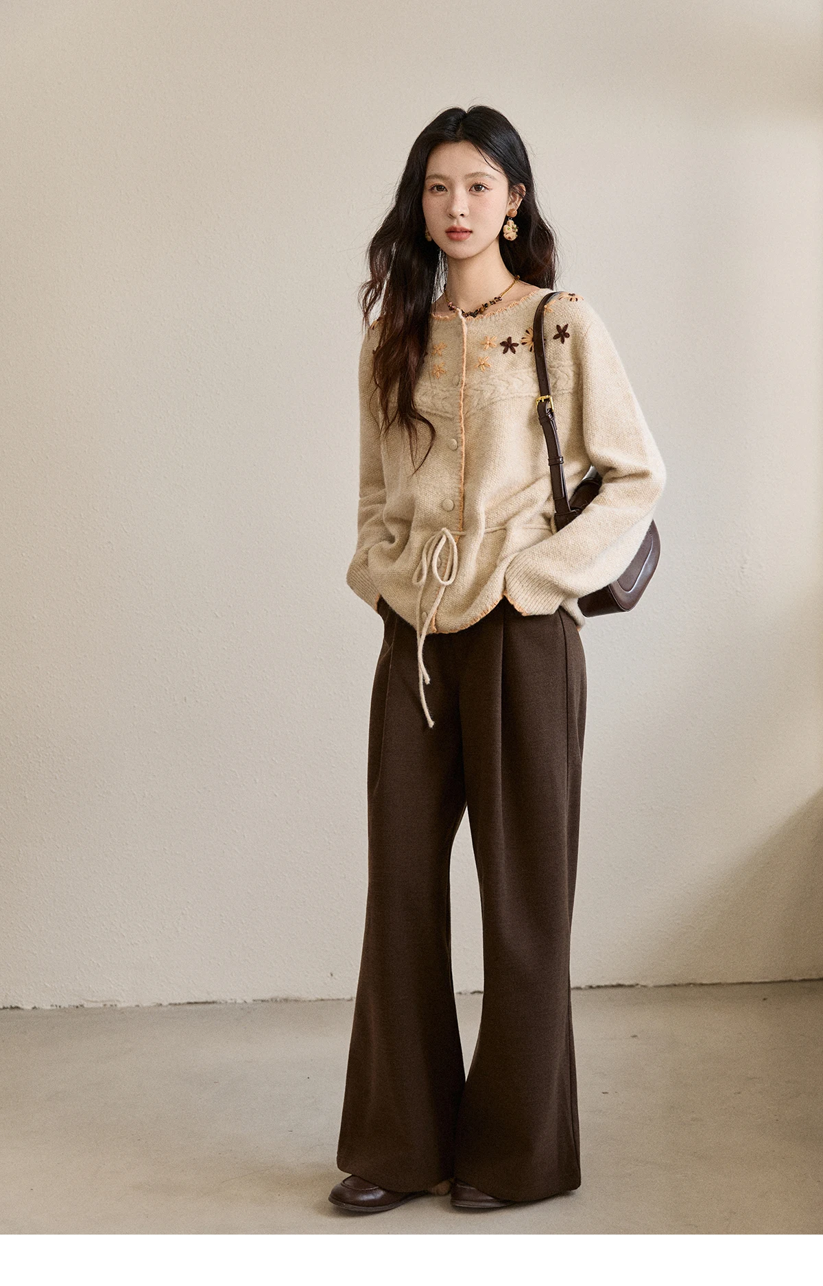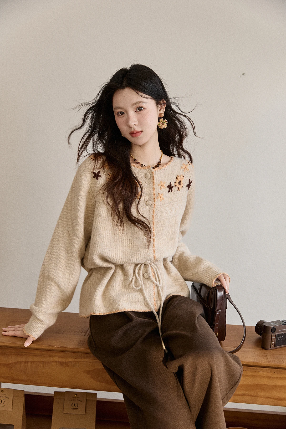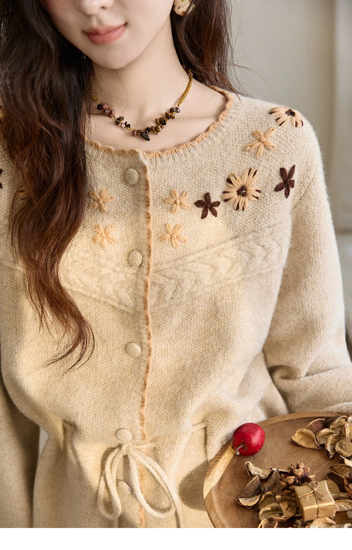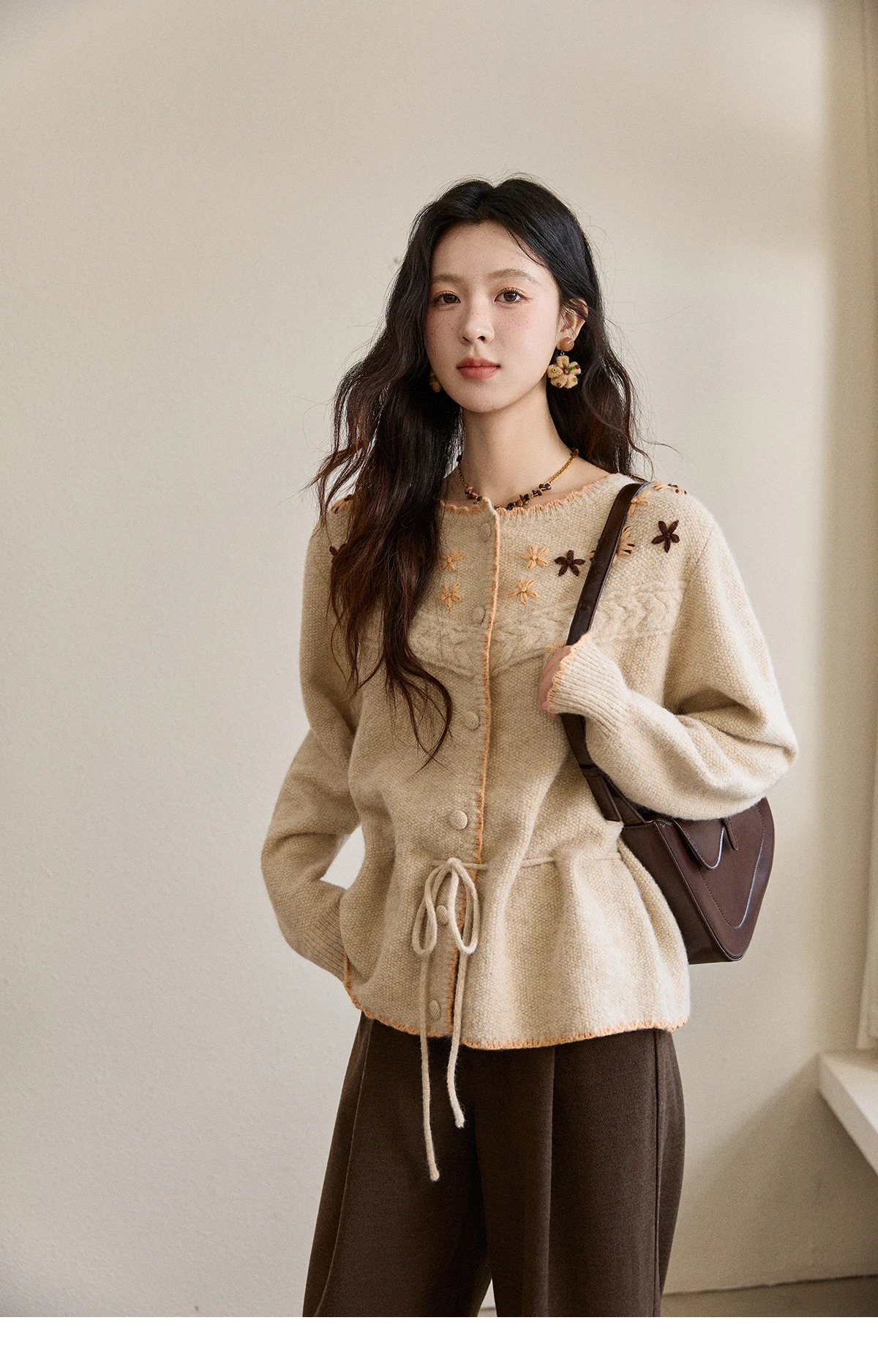 MISHOW Women's Apricot Hand-Embroidered Cardigan 2025 Winter Wool Blend Sweater Waist Tie Crochet Thick Warm Knitwear MXE87Z2702